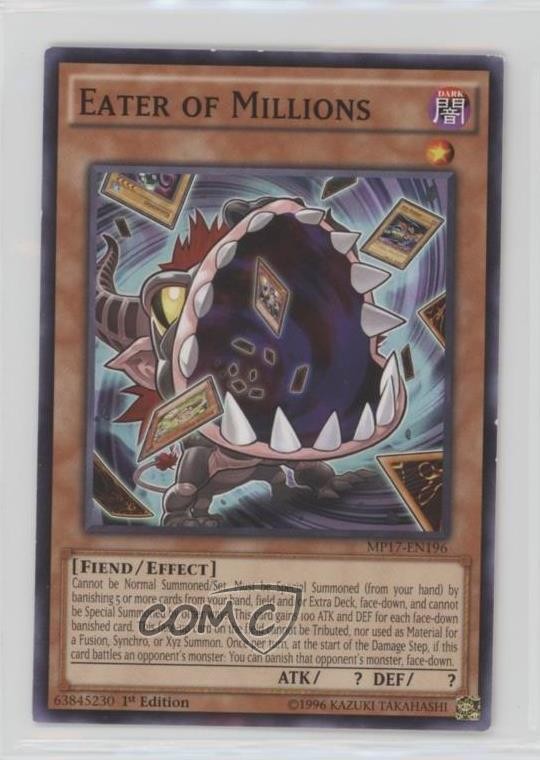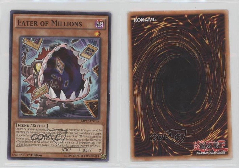 2017 Yu-Gi-Oh! Mega-Tins - Mega Pack [Base] - 1st Edition #MP17-EN196 Eater of Millions COMC Item: 128261060 - YuGiOh Card Search for more: 2017 Yu-Gi-Oh! Mega-Tins Search for more: 2017 Yu-Gi-Oh! Mega-Tins - Mega Pack [Base] - 1st Edition View all of our Listings Auctions Buy It Now About Us Located in the beautiful Pacific Northwest, COMC (Check Out My Cards) is the world's largest consignment service for trading card singles. More than 10,000 people have used our consignment service to list over 50 million trading cards. Find out how we can help you consign your items on eBay by contacting us through eBay messaging. COMC -- "The Safe & Easy Way to Buy & Sell" Raw Condition for Modern Cards Unless otherwise noted, raw modern cards are listed in Near Mint-Mint condition or better. A NM-MT card appears to be Mint at first glance, but upon closer inspection, may exhibit some of the following: minor print defects (e.g. roller marks, print line, dimple), minor scratches, slight edge wear, and slight corner wear. Centering is clearly visible in the images provided and does not factor into our condition assessment. Raw Condition for Vintage Cards Unless otherwise noted, raw vintage cards are listed in Excellent condition or better. An EX card may exhibit some of the following: minor rounding of corners, surface wear, print defects, light scratches, and slight edge wear/chipping. Centering is clearly visible in the images provided and does not factor into our condition assessment. Domestic Shipping Combined shipping for multiple items is available. To receive combined shipping, please ensure all desired items are in your eBay shopping cart before proceeding to checkout. eBay limits orders to 40 items per order. We automatically combine multiple orders placed on the same day. If you place multiple orders on the same day, please contact us to request a refund of applicable shipping costs. Signature confirmation may be required on invoices over $400. All cards are protected and shipped securely. International Shipping COMC offers eBay's International Shipping (EIS) for international orders under $2,500* (see country exceptions below). All duties and import fees are paid at checkout; in the rare event that there are additional import fees upon delivery, these are borne by the buyer. EIS packages route through a shipping hub in Erlanger, KY before shipping to their final destination. Please note that EIS does not allow for combined shipments. The shipping rates are determined by eBay and cannot be adjusted. *Maximum sale price exceptions: Colombia, Kuwait ($2,000); Taiwan ($1,539); Chile, Costa Rica, Guatemala, Honduras, Trinidad and Tobago ($1,000); Antigua and Barbuda, Aruba, Belize, Dominica, Grenada, Philippines, Saint Kitts and Nevis, Saint Lucia, Montserrat, Turks and Caicos Islands ($500); Dominican Republic, El Salvador ($200). Please request a shipping quote through eBay messaging for orders that exceed the maximum sale price supported by eBay's International Shipping. You will be responsible for all duties and import fees for international orders shipped outside the EIS. All cards are protected and shipped securely. Payment COMC does not accept offers on our cards through our eBay storefront. COMC utilizes eBay’s managed payments system. If you are experiencing difficulties making a payment, please contact eBay for assistance. Return Policy Returns are only accepted on the rare occasion the item is not as described. If you are making a return, please initiate the return process through eBay so a mailing label can be provided for you. Prior to listing, our expert team carefully assessed this item to represent it accurately. Please review the description and high-definition images prior to purchasing to ensure this item meets your satisfaction. We welcome you to contact us if you have further questions about this item. Trust and Integrity COMC carefully assesses each item consigned to us to prevent fraudulent items from entering the marketplace. If you believe an item offered on COMC may be fraudulent, please contact us with details so we can investigate the issue. Items we determine are outside our supported items policy may be removed. Last Modified: 5/14/2025 10:24:19 AM PDT