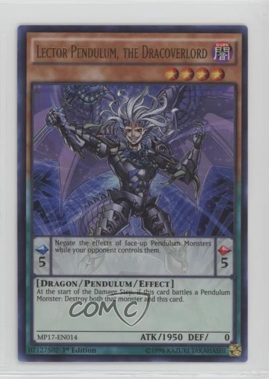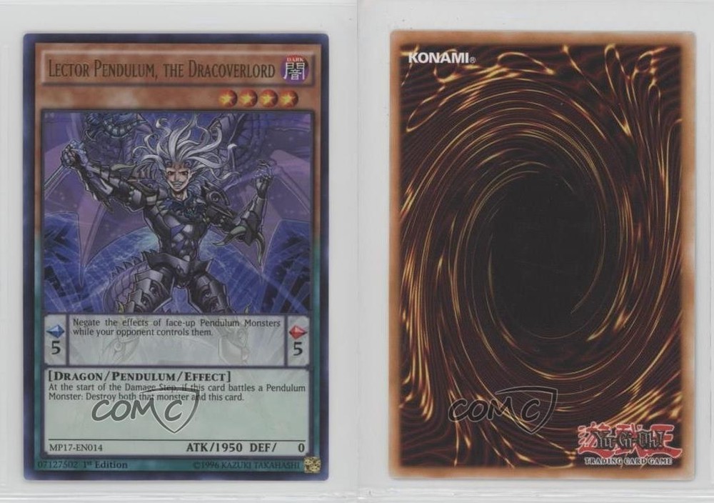 2017 Yu-Gi-Oh! Mega-Tins - Mega Pack [Base] - 1st Edition #MP17-EN014 Lector Pendulum, The Dracoverlord COMC Item: 128261085 - YuGiOh Card Search for more: 2017 Yu-Gi-Oh! Mega-Tins Search for more: 2017 Yu-Gi-Oh! Mega-Tins - Mega Pack [Base] - 1st Edition View all of our Listings Auctions Buy It Now About Us Located in the beautiful Pacific Northwest, COMC (Check Out My Cards) is the world's largest consignment service for trading card singles. More than 10,000 people have used our consignment service to list over 50 million trading cards. Find out how we can help you consign your items on eBay by contacting us through eBay messaging. COMC -- "The Safe & Easy Way to Buy & Sell" Raw Condition for Modern Cards Unless otherwise noted, raw modern cards are listed in Near Mint-Mint condition or better. A NM-MT card appears to be Mint at first glance, but upon closer inspection, may exhibit some of the following: minor print defects (e.g. roller marks, print line, dimple), minor scratches, slight edge wear, and slight corner wear. Centering is clearly visible in the images provided and does not factor into our condition assessment. Raw Condition for Vintage Cards Unless otherwise noted, raw vintage cards are listed in Excellent condition or better. An EX card may exhibit some of the following: minor rounding of corners, surface wear, print defects, light scratches, and slight edge wear/chipping. Centering is clearly visible in the images provided and does not factor into our condition assessment. Domestic Shipping Combined shipping for multiple items is available. To receive combined shipping, please ensure all desired items are in your eBay shopping cart before proceeding to checkout. eBay limits orders to 40 items per order. We automatically combine multiple orders placed on the same day. If you place multiple orders on the same day, please contact us to request a refund of applicable shipping costs. Signature confirmation may be required on invoices over $400. All cards are protected and shipped securely. International Shipping COMC offers eBay's International Shipping (EIS) for international orders under $2,500* (see country exceptions below). All duties and import fees are paid at checkout; in the rare event that there are additional import fees upon delivery, these are borne by the buyer. EIS packages route through a shipping hub in Erlanger, KY before shipping to their final destination. Please note that EIS does not allow for combined shipments. The shipping rates are determined by eBay and cannot be adjusted. *Maximum sale price exceptions: Colombia, Kuwait ($2,000); Taiwan ($1,539); Chile, Costa Rica, Guatemala, Honduras, Trinidad and Tobago ($1,000); Antigua and Barbuda, Aruba, Belize, Dominica, Grenada, Philippines, Saint Kitts and Nevis, Saint Lucia, Montserrat, Turks and Caicos Islands ($500); Dominican Republic, El Salvador ($200). Please request a shipping quote through eBay messaging for orders that exceed the maximum sale price supported by eBay's International Shipping. You will be responsible for all duties and import fees for international orders shipped outside the EIS. All cards are protected and shipped securely. Payment COMC does not accept offers on our cards through our eBay storefront. COMC utilizes eBay’s managed payments system. If you are experiencing difficulties making a payment, please contact eBay for assistance. Return Policy Returns are only accepted on the rare occasion the item is not as described. If you are making a return, please initiate the return process through eBay so a mailing label can be provided for you. Prior to listing, our expert team carefully assessed this item to represent it accurately. Please review the description and high-definition images prior to purchasing to ensure this item meets your satisfaction. We welcome you to contact us if you have further questions about this item. Trust and Integrity COMC carefully assesses each item consigned to us to prevent fraudulent items from entering the marketplace. If you believe an item offered on COMC may be fraudulent, please contact us with details so we can investigate the issue. Items we determine are outside our supported items policy may be removed. Last Modified: 5/18/2025 8:59:59 AM PDT