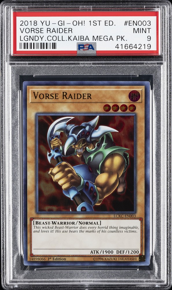 2018 YU-GI-OH! LEGENDARY COLLECTION KAIBA MEGA PACK 1ST EDITION #EN003 VORSE RAIDER PSA 9 2018 YU-GI-OH! LEGENDARY COLLECTION KAIBA MEGA PACK 1ST EDITION #EN003 VORSE RAIDER PSA 9 Purchase Info Thank you for your interest in this item consigned with PSA! By purchasing or making an offer on this item, you acknowledge and agree to the following terms: All sales are final. Returns not accepted. Payment must be made upon purchase of the item. All items are sold "as is" and without warranty of Collectors Universe, Inc. (d/b/a PSA), and ANY AND ALL IMPLIED WARRANTIES ARE DISCLAIMED AND EXCLUDED. Sales tax may apply depending on shipping address. PSA does not guarantee that another third-party grading company's authentication or certification of an item as genuine is correct or accurate. Neither a difference of opinion between third-party grading companies about authenticity, nor a company's subsequent reversal of its earlier authentication or certification of an item, will be a basis for rescinding a sale. Any dispute with another third-party grading company relating to the authenticity of an item must be resolved directly with that other company. Collectors' maximum liability in the event of loss or damage to an item during shipping will be the lesser of (a) the price paid for the item and (b) the change in fair market value of the item. You release Collectors from all other liability including for any claims of punitive damages, emotional distress, consequential damages, lost profits, or lost interest, except as prohibited by law. Shipping Purchased Items will be shipped directly from PSA Vault. You stay hands-free. PSA Vault When you purchase this item, you can save on sales tax and selling fees by keeping it in the PSA Vault, official Vault of eBay. Items already in PSA Vault and will be sent to PSA Vault will have no shipping charge Storage of any items with the PSA Vault will be subject to the PSA Vault Terms of Service. Consignment PSA has competitive rates on the world's largest collectibles marketplace with the option to list from the PSA Vault or immediately after PSA authentication and grading. Sale Price Under $100 $100 - $499 $500 - $999 $1,000 - $2,499 $2,500 - $4,999 $5,000+ Seller Fee 16% 14% 13% 10% 9% 7% Sellers pay a single fee as reflected above; no additional eBay fees are incurred. There is a $5 minimum fee on sold items.