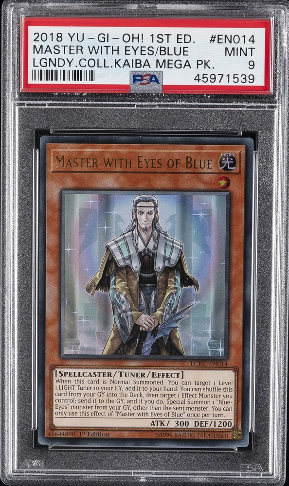 2018 YU-GI-OH! LEGENDARY COLLECTION KAIBA MEGA PACK 1ST EDITION #EN014 MASTER WITH EYES OF BLUE PSA 9 2018 YU-GI-OH! LEGENDARY COLLECTION KAIBA MEGA PACK 1ST EDITION #EN014 MASTER WITH EYES OF BLUE PSA 9 Purchase Info Thank you for your interest in this item consigned with PSA! By purchasing or making an offer on this item, you acknowledge and agree to the following terms: All sales are final. Returns not accepted. Payment must be made upon purchase of the item. All items are sold "as is" and without warranty of Collectors Universe, Inc. (d/b/a PSA), and ANY AND ALL IMPLIED WARRANTIES ARE DISCLAIMED AND EXCLUDED. Sales tax may apply depending on shipping address. PSA does not guarantee that another third-party grading company's authentication or certification of an item as genuine is correct or accurate. Neither a difference of opinion between third-party grading companies about authenticity, nor a company's subsequent reversal of its earlier authentication or certification of an item, will be a basis for rescinding a sale. Any dispute with another third-party grading company relating to the authenticity of an item must be resolved directly with that other company. Collectors' maximum liability in the event of loss or damage to an item during shipping will be the lesser of (a) the price paid for the item and (b) the change in fair market value of the item. You release Collectors from all other liability including for any claims of punitive damages, emotional distress, consequential damages, lost profits, or lost interest, except as prohibited by law. Shipping Purchased Items will be shipped directly from PSA Vault. You stay hands-free. PSA Vault When you purchase this item, you can save on sales tax and selling fees by keeping it in the PSA Vault, official Vault of eBay. Items already in PSA Vault and will be sent to PSA Vault will have no shipping charge Storage of any items with the PSA Vault will be subject to the PSA Vault Terms of Service. Consignment PSA has competitive rates on the world's largest collectibles marketplace with the option to list from the PSA Vault or immediately after PSA authentication and grading. Sale Price Under $100 $100 - $499 $500 - $999 $1,000 - $2,499 $2,500 - $4,999 $5,000+ Seller Fee 16% 14% 13% 10% 9% 7% Sellers pay a single fee as reflected above; no additional eBay fees are incurred. There is a $5 minimum fee on sold items.