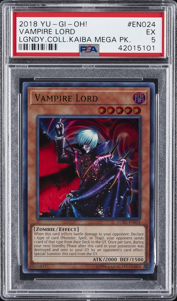 2018 YU-GI-OH! LEGENDARY COLLECTION KAIBA MEGA PACK #EN024 VAMPIRE LORD PSA 5 2018 YU-GI-OH! LEGENDARY COLLECTION KAIBA MEGA PACK #EN024 VAMPIRE LORD PSA 5 Purchase Info Thank you for your interest in this item consigned with PSA! By purchasing or making an offer on this item, you acknowledge and agree to the following terms: All sales are final. Returns not accepted. Payment must be made upon purchase of the item. All items are sold "as is" and without warranty of Collectors Universe, Inc. (d/b/a PSA), and ANY AND ALL IMPLIED WARRANTIES ARE DISCLAIMED AND EXCLUDED. Sales tax may apply depending on shipping address. PSA does not guarantee that another third-party grading company's authentication or certification of an item as genuine is correct or accurate. Neither a difference of opinion between third-party grading companies about authenticity, nor a company's subsequent reversal of its earlier authentication or certification of an item, will be a basis for rescinding a sale. Any dispute with another third-party grading company relating to the authenticity of an item must be resolved directly with that other company. Collectors' maximum liability in the event of loss or damage to an item during shipping will be the lesser of (a) the price paid for the item and (b) the change in fair market value of the item. You release Collectors from all other liability including for any claims of punitive damages, emotional distress, consequential damages, lost profits, or lost interest, except as prohibited by law. Shipping Purchased Items will be shipped directly from PSA Vault. You stay hands-free. PSA Vault When you purchase this item, you can save on sales tax and selling fees by keeping it in the PSA Vault, official Vault of eBay. Items already in PSA Vault and will be sent to PSA Vault will have no shipping charge Storage of any items with the PSA Vault will be subject to the PSA Vault Terms of Service. Consignment PSA has competitive rates on the world's largest collectibles marketplace with the option to list from the PSA Vault or immediately after PSA authentication and grading. Sale Price Under $100 $100 - $499 $500 - $999 $1,000 - $2,499 $2,500 - $4,999 $5,000+ Seller Fee 16% 14% 13% 10% 9% 7% Sellers pay a single fee as reflected above; no additional eBay fees are incurred. There is a $5 minimum fee on sold items.