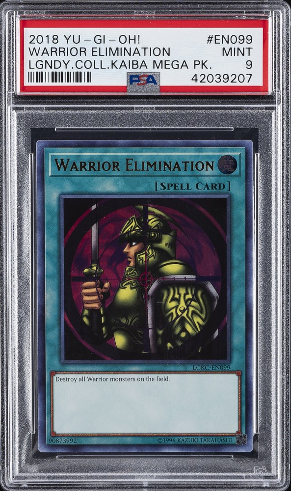 2018 YU-GI-OH! LEGENDARY COLLECTION KAIBA MEGA PACK #EN099 WARRIOR ELIMINATION PSA 9 2018 YU-GI-OH! LEGENDARY COLLECTION KAIBA MEGA PACK #EN099 WARRIOR ELIMINATION PSA 9 Purchase Info Thank you for your interest in this item consigned with PSA! By purchasing or making an offer on this item, you acknowledge and agree to the following terms: All sales are final. Returns not accepted. Payment must be made upon purchase of the item. All items are sold "as is" and without warranty of Collectors Universe, Inc. (d/b/a PSA), and ANY AND ALL IMPLIED WARRANTIES ARE DISCLAIMED AND EXCLUDED. Sales tax may apply depending on shipping address. PSA does not guarantee that another third-party grading company's authentication or certification of an item as genuine is correct or accurate. Neither a difference of opinion between third-party grading companies about authenticity, nor a company's subsequent reversal of its earlier authentication or certification of an item, will be a basis for rescinding a sale. Any dispute with another third-party grading company relating to the authenticity of an item must be resolved directly with that other company. Collectors' maximum liability in the event of loss or damage to an item during shipping will be the lesser of (a) the price paid for the item and (b) the change in fair market value of the item. You release Collectors from all other liability including for any claims of punitive damages, emotional distress, consequential damages, lost profits, or lost interest, except as prohibited by law. Shipping Purchased Items will be shipped directly from PSA Vault. You stay hands-free. PSA Vault When you purchase this item, you can save on sales tax and selling fees by keeping it in the PSA Vault, official Vault of eBay. Items already in PSA Vault and will be sent to PSA Vault will have no shipping charge Storage of any items with the PSA Vault will be subject to the PSA Vault Terms of Service. Consignment PSA has competitive rates on the world's largest collectibles marketplace with the option to list from the PSA Vault or immediately after PSA authentication and grading. Sale Price Under $100 $100 - $499 $500 - $999 $1,000 - $2,499 $2,500 - $4,999 $5,000+ Seller Fee 16% 14% 13% 10% 9% 7% Sellers pay a single fee as reflected above; no additional eBay fees are incurred. There is a $5 minimum fee on sold items.