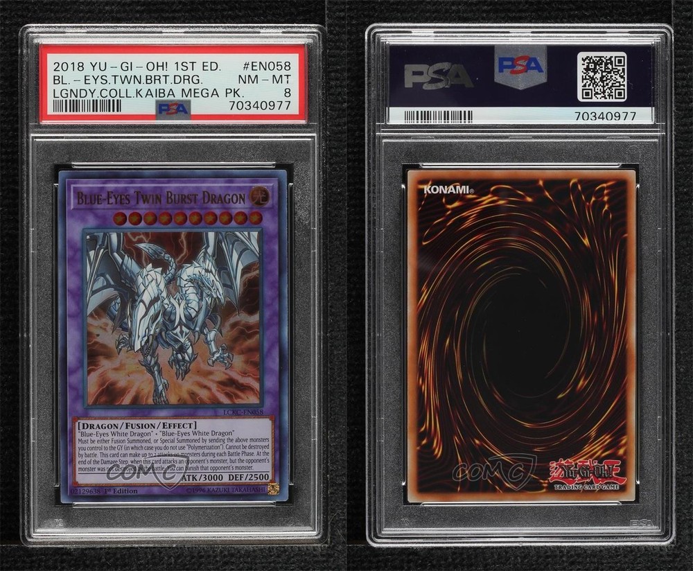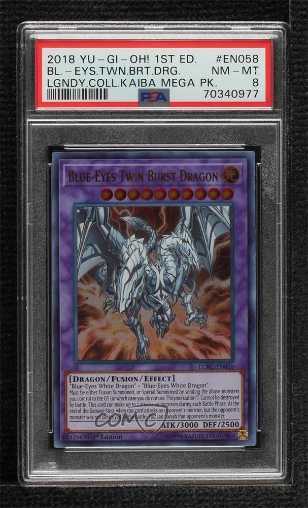 2018 Yu-Gi-Oh! - Legendary Collection Kaiba - [Base] - 1st Edition #LCKC-EN058 Blue-Eyes Twin Burst Dragon Graded PSA 8 NM-MT COMC Item: 269721329 - YuGiOh Card Search for more: 2018 Yu-Gi-Oh! - Legendary Collection Kaiba Search for more: 2018 Yu-Gi-Oh! - Legendary Collection Kaiba - [Base] - 1st Edition View all of our Listings Auctions Buy It Now About Us Located in the beautiful Pacific Northwest, COMC (Check Out My Cards) is the world's largest consignment service for trading card singles. More than 10,000 people have used our consignment service to list over 50 million trading cards. Find out how we can help you consign your items on eBay by contacting us through eBay messaging. COMC -- "The Safe & Easy Way to Buy & Sell" Raw Condition for Modern Cards Unless otherwise noted, raw modern cards are listed in Near Mint-Mint condition or better. A NM-MT card appears to be Mint at first glance, but upon closer inspection, may exhibit some of the following: minor print defects (e.g. roller marks, print line, dimple), minor scratches, slight edge wear, and slight corner wear. Centering is clearly visible in the images provided and does not factor into our condition assessment. Raw Condition for Vintage Cards Unless otherwise noted, raw vintage cards are listed in Excellent condition or better. An EX card may exhibit some of the following: minor rounding of corners, surface wear, print defects, light scratches, and slight edge wear/chipping. Centering is clearly visible in the images provided and does not factor into our condition assessment. Domestic Shipping Combined shipping for multiple items is available. To receive combined shipping, please ensure all desired items are in your eBay shopping cart before proceeding to checkout. eBay limits orders to 40 items per order. We automatically combine multiple orders placed on the same day. If you place multiple orders on the same day, please contact us to request a refund of applicable shipping costs. Signature confirmation may be required on invoices over $400. All cards are protected and shipped securely. International Shipping COMC offers eBay's International Shipping (EIS) for international orders under $2,500* (see country exceptions below). All duties and import fees are paid at checkout; in the rare event that there are additional import fees upon delivery, these are borne by the buyer. EIS packages route through a shipping hub in Erlanger, KY before shipping to their final destination. Please note that EIS does not allow for combined shipments. The shipping rates are determined by eBay and cannot be adjusted. *Maximum sale price exceptions: Colombia, Kuwait ($2,000); Taiwan ($1,539); Chile, Costa Rica, Guatemala, Honduras, Trinidad and Tobago ($1,000); Antigua and Barbuda, Aruba, Belize, Dominica, Grenada, Philippines, Saint Kitts and Nevis, Saint Lucia, Montserrat, Turks and Caicos Islands ($500); Dominican Republic, El Salvador ($200). Please request a shipping quote through eBay messaging for orders that exceed the maximum sale price supported by eBay's International Shipping. You will be responsible for all duties and import fees for international orders shipped outside the EIS. All cards are protected and shipped securely. Payment COMC does not accept offers on our cards through our eBay storefront. COMC utilizes eBay’s managed payments system. If you are experiencing difficulties making a payment, please contact eBay for assistance. Return Policy Returns are only accepted on the rare occasion the item is not as described. If you are making a return, please initiate the return process through eBay so a mailing label can be provided for you. Prior to listing, our expert team carefully assessed this item to represent it accurately. Please review the description and high-definition images prior to purchasing to ensure this item meets your satisfaction. We welcome you to contact us if you have further questions about this item. Trust and Integrity COMC carefully assesses each item consigned to us to prevent fraudulent items from entering the marketplace. If you believe an item offered on COMC may be fraudulent, please contact us with details so we can investigate the issue. Items we determine are outside our supported items policy may be removed. Last Modified: 5/7/2025 4:49:02 AM PDT