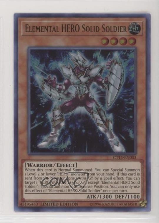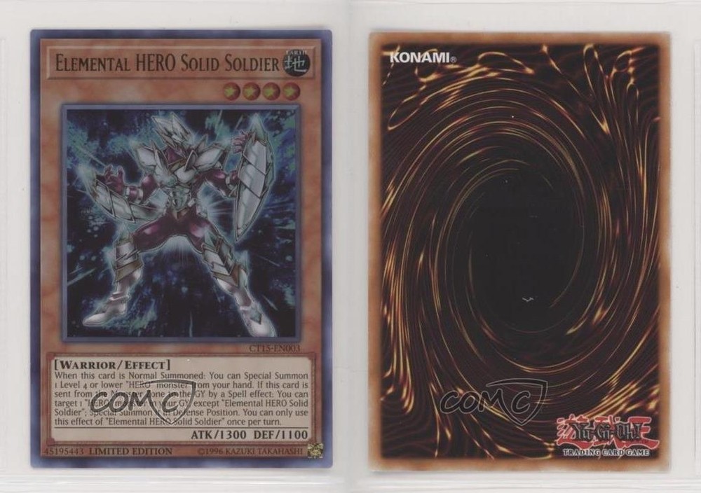 2018 Yu-Gi-Oh! Mega-Tins Jaden Yuki - [Base] - Limited Edition #CT15-EN003 Elemental HERO Solid Soldier COMC Item: 72506242 - YuGiOh Card Search for more: 2018 Yu-Gi-Oh! Mega-Tins Jaden Yuki Search for more: 2018 Yu-Gi-Oh! Mega-Tins Jaden Yuki - [Base] - Limited Edition View all of our Listings Auctions Buy It Now About Us Located in the beautiful Pacific Northwest, COMC (Check Out My Cards) is the world's largest consignment service for trading card singles. More than 10,000 people have used our consignment service to list over 50 million trading cards. Find out how we can help you consign your items on eBay by contacting us through eBay messaging. COMC -- "The Safe & Easy Way to Buy & Sell" Raw Condition for Modern Cards Unless otherwise noted, raw modern cards are listed in Near Mint-Mint condition or better. A NM-MT card appears to be Mint at first glance, but upon closer inspection, may exhibit some of the following: minor print defects (e.g. roller marks, print line, dimple), minor scratches, slight edge wear, and slight corner wear. Centering is clearly visible in the images provided and does not factor into our condition assessment. Raw Condition for Vintage Cards Unless otherwise noted, raw vintage cards are listed in Excellent condition or better. An EX card may exhibit some of the following: minor rounding of corners, surface wear, print defects, light scratches, and slight edge wear/chipping. Centering is clearly visible in the images provided and does not factor into our condition assessment. Domestic Shipping Combined shipping for multiple items is available. To receive combined shipping, please ensure all desired items are in your eBay shopping cart before proceeding to checkout. eBay limits orders to 40 items per order. We automatically combine multiple orders placed on the same day. If you place multiple orders on the same day, please contact us to request a refund of applicable shipping costs. Signature confirmation may be required on invoices over $400. All cards are protected and shipped securely. International Shipping COMC offers eBay's International Shipping (EIS) for international orders under $2,500* (see country exceptions below). All duties and import fees are paid at checkout; in the rare event that there are additional import fees upon delivery, these are borne by the buyer. EIS packages route through a shipping hub in Erlanger, KY before shipping to their final destination. Please note that EIS does not allow for combined shipments. The shipping rates are determined by eBay and cannot be adjusted. *Maximum sale price exceptions: Colombia, Kuwait ($2,000); Taiwan ($1,539); Chile, Costa Rica, Guatemala, Honduras, Trinidad and Tobago ($1,000); Antigua and Barbuda, Aruba, Belize, Dominica, Grenada, Philippines, Saint Kitts and Nevis, Saint Lucia, Montserrat, Turks and Caicos Islands ($500); Dominican Republic, El Salvador ($200). Please request a shipping quote through eBay messaging for orders that exceed the maximum sale price supported by eBay's International Shipping. You will be responsible for all duties and import fees for international orders shipped outside the EIS. All cards are protected and shipped securely. Payment COMC does not accept offers on our cards through our eBay storefront. COMC utilizes eBay’s managed payments system. If you are experiencing difficulties making a payment, please contact eBay for assistance. Return Policy Returns are only accepted on the rare occasion the item is not as described. If you are making a return, please initiate the return process through eBay so a mailing label can be provided for you. Prior to listing, our expert team carefully assessed this item to represent it accurately. Please review the description and high-definition images prior to purchasing to ensure this item meets your satisfaction. We welcome you to contact us if you have further questions about this item. Trust and Integrity COMC carefully assesses each item consigned to us to prevent fraudulent items from entering the marketplace. If you believe an item offered on COMC may be fraudulent, please contact us with details so we can investigate the issue. Items we determine are outside our supported items policy may be removed. Last Modified: 5/6/2025 11:39:49 AM PDT