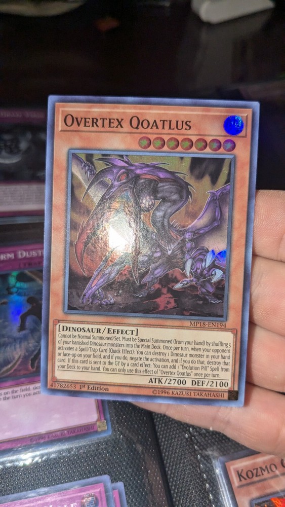 | Card Text | Cannot be Normal Summoned/Set. Must be Special Summoned (from your hand) by shuffling 5 of your banished Dinosaur monsters into the Main Deck. Once per turn, when your opponent activates a Spell/Trap Card (Quick Effect): You can destroy 1 Dinosaur monster in your hand or face-up on your field, and if you do, negate that activation, and if you do that, destroy that card. If this card is sent to the GY by a card effect: You can add 1 "Evolution Pill" Spell from your Deck to your hand. You can only use this effect of "Overtex Qoatlus" once per turn. |