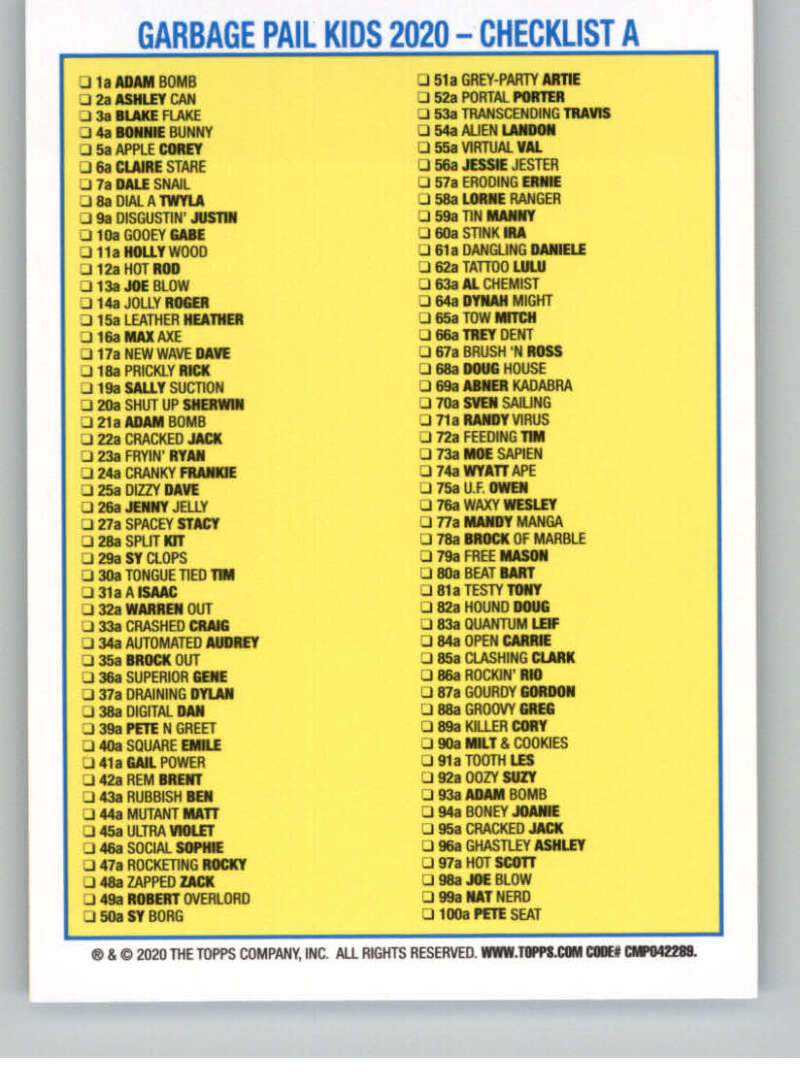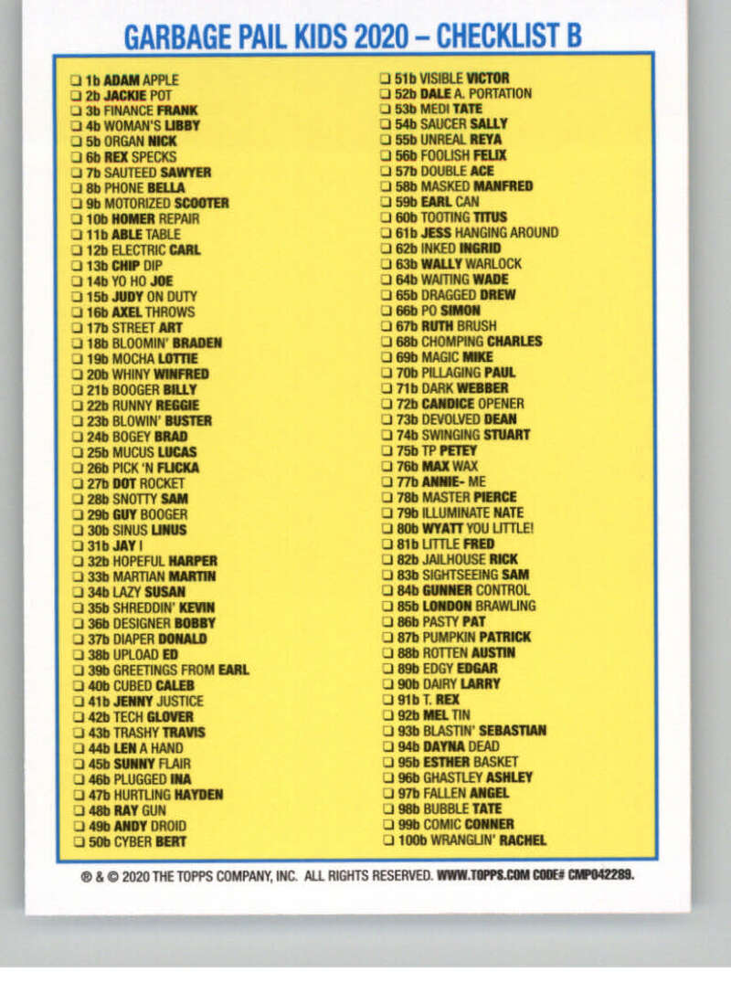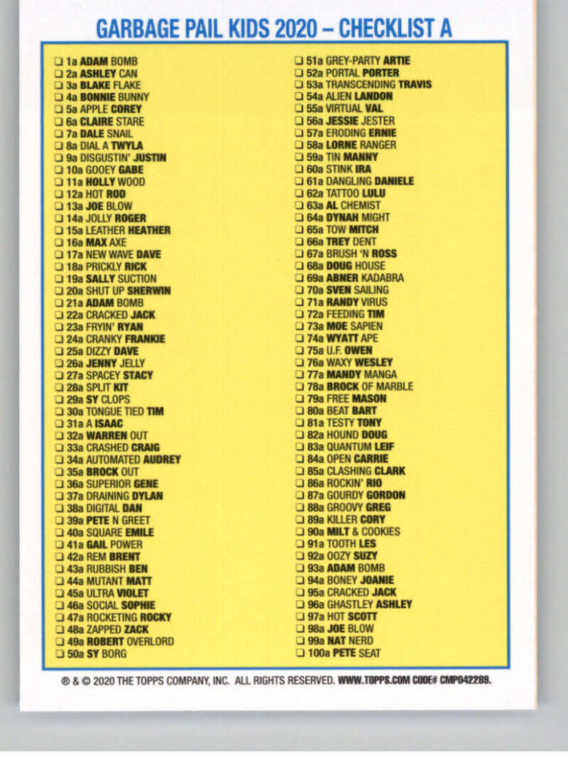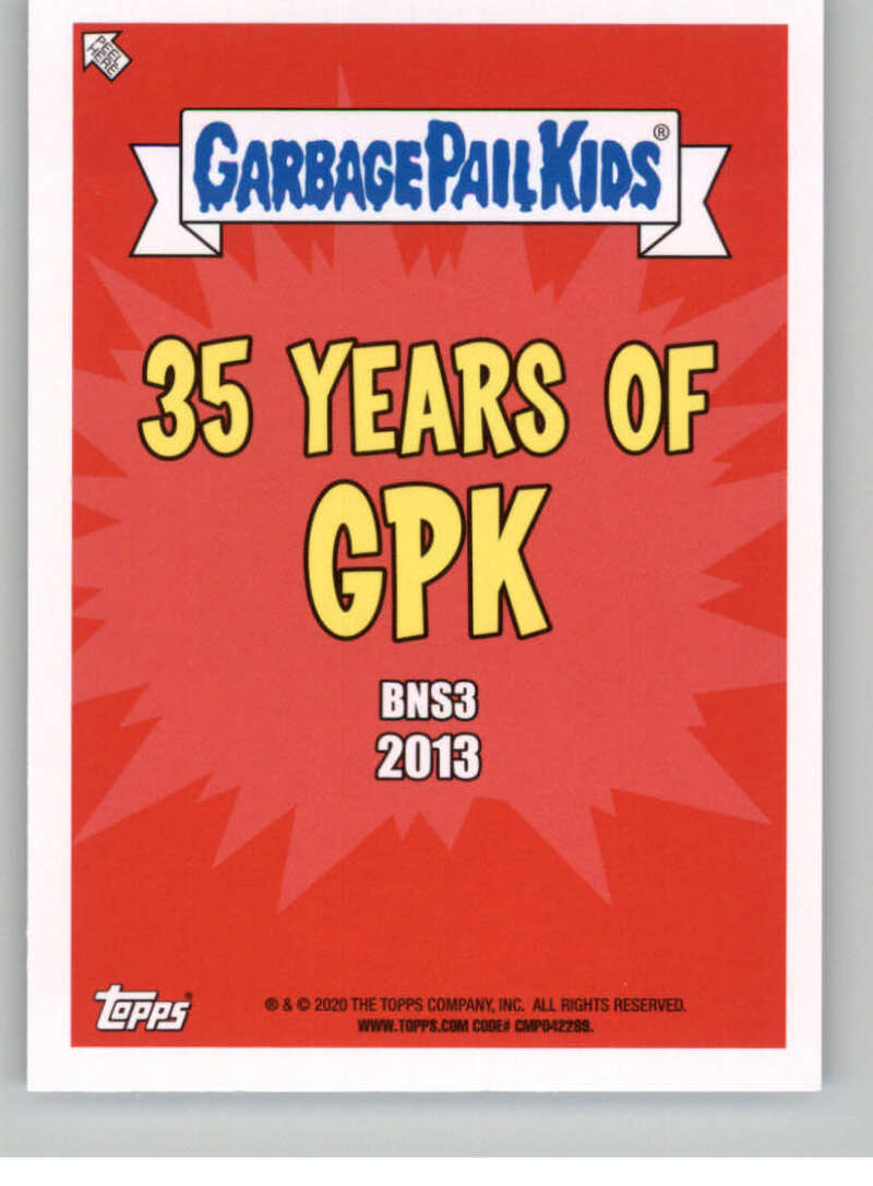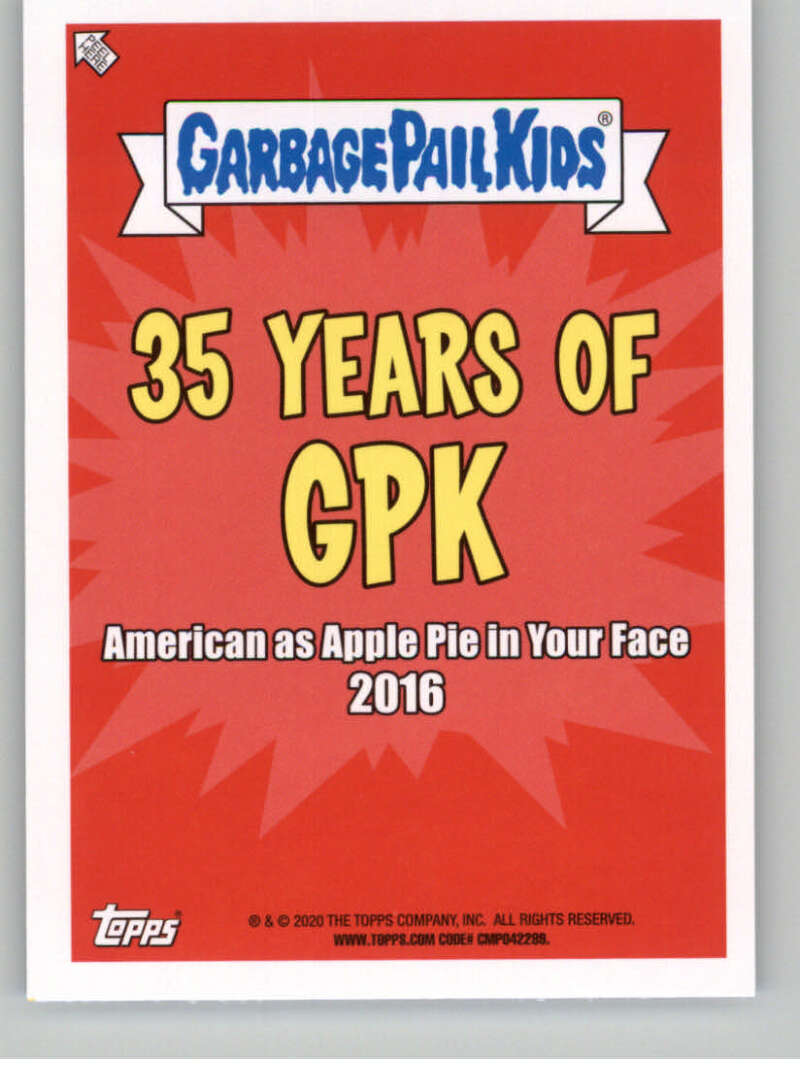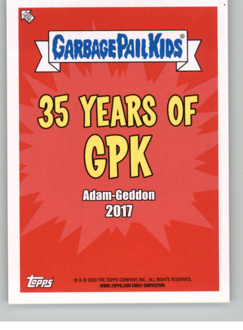 2020 Topps Garbage Pail Kids Series Two 35th Anniversary Cards Pick From List eBay requires a condition for raw (ungraded) trading cards - These cards are listed as NM (Near Mint) - Here is a description direcly from the PSA website: A PSA NM 7 is a card showing slight surface wear visible only upon close inspection. There may be slight fraying on some corners. Picture focus may be slightly out-of-register although a minor printing blemish is acceptable. Slight wax staining is acceptable on the back of the card only. Due to high volume of unreasonable buyers, all cards are going to be classified as RAW / AUTHENTIC WITH SOME SORT OF FLAW THAT I DID NOT SEE WITH NO GURANTEE TO WHAT ANY SPECIFIC ITEM WILL GRADE AT unless otherwise noted in the title or if the item has already been graded/slabbed. I am marking this change due to the number of collections I get in. For 2000-Present Modern Cards: I try my best to remove all the cards that aren't NM or better, but sometimes there are a few that slilp through the cracks and get listed. Expect a card in at least NM condition, with most cards I sell exceeding this grade. This means, set your expectations that the card you receive is in this condition. Stock photos are used for most of these items, unless the card's SN or jersey swatch is noted in drop down menu. For 1981-1999-Present Modern Cards: I try my best to remove all the cards that aren't EX or better, but sometimes there are a few that slilp through the cracks and get listed. Expect a card in at least EX condition, with most cards I sell exceeding this grade. This means, set your expectations that the card you receive is in this condition. Stock photos are used for most of these items, unless the card's SN or jersey swatch is noted in drop down menu. For Vintage Cards 1980 and Earlier: These will be listed in "Lot or Set Break" formats, which means the card you see is the card you will receive. Front and back images will be displayed on all cards. Expect a card in Fair/Poor condition. Do not assume that because the card is priced higher than market price, it is going to grade high. Please check scan carefully for condition. If the card photo doesn't match the description, please contact me before purchasing. You are purchasing the card in the title only, not necessarily. the one pictured. Returns are accepted, but I reserve the right to charge a 30% re-stocking based on reason for return. Shipping is specified up above. Two options for shipping available for domestic and international customers. Please note economy shipping is sent in a small white envelope or reinforced cardboard mailer in a semi-rigid holder. If you do not want to risk unnecessary damage to your card, please select the padded envelope option. International Customers, I ship through a third party mail processing provider. Tracking numbers may change throughout the process, but all items will ship with tracking Please use the eBay.com shopping cart to pay one shipping price and receive all discounts possible. Due to the constant Postal Rate increases, I will no longer quote shipping and handling prices in my description. Any questions please do not hesitate to ask. Some features may not be available on the App vs. the Desktop version, like request total from seller and upgraded shipping options. Please try it on both platforms before you contact me.Thank you for clicking on my listings. I only have the cards available from the drop down menu. Please select carefully from the drop down list as all sets in the title are included in this listing. Thank you for understanding. There are stock photos in use on most of my listings. I cannot gurantee any specific serial number or jersey swatch.