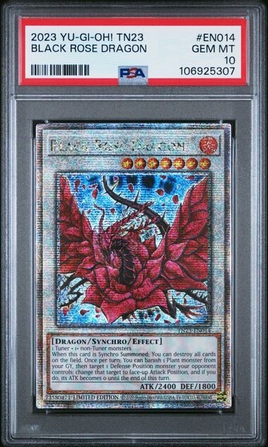 The 2023 PSA 10 YUGIOH DUELING HEROES QC SECRET RARE BLACK ROSE DRAGON is a highly sought-after collectible card from the Yu-Gi-Oh! TCG. This card features the character Dark Magician and is part of the Legendary Duelists set. With a rarity of Secret Rare and a speciality of GX, this card is a valuable addition to any Yu-Gi-Oh! card collection. The holo finish and 1st Edition stamp add to the card's appeal, making it a desirable item for fans and collectors alike.