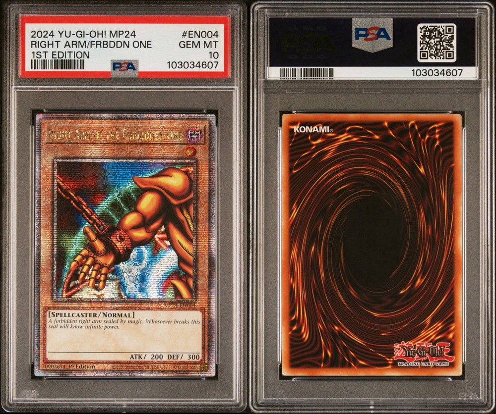 Elevate your YuGiOh! collection with the 2024 PSA 10 Secret Rare Right Arm of Exodia card, a must-have for enthusiasts and competitive players alike. Featuring the iconic Dark Magician, this card from the Legendary Duelists set is a powerful addition to any deck, embodying the essence of strategic gameplay with its Harpy creature/monster type and Darkness attribute. The card boasts a stunning Holo finish, capturing the eye with its intricate design, and comes as a 1st Edition piece, ensuring its uniqueness among collectibles. With English language and a Card Number of 2024, it's ready to take center stage in your display or to make a formidable impact in your next duel.