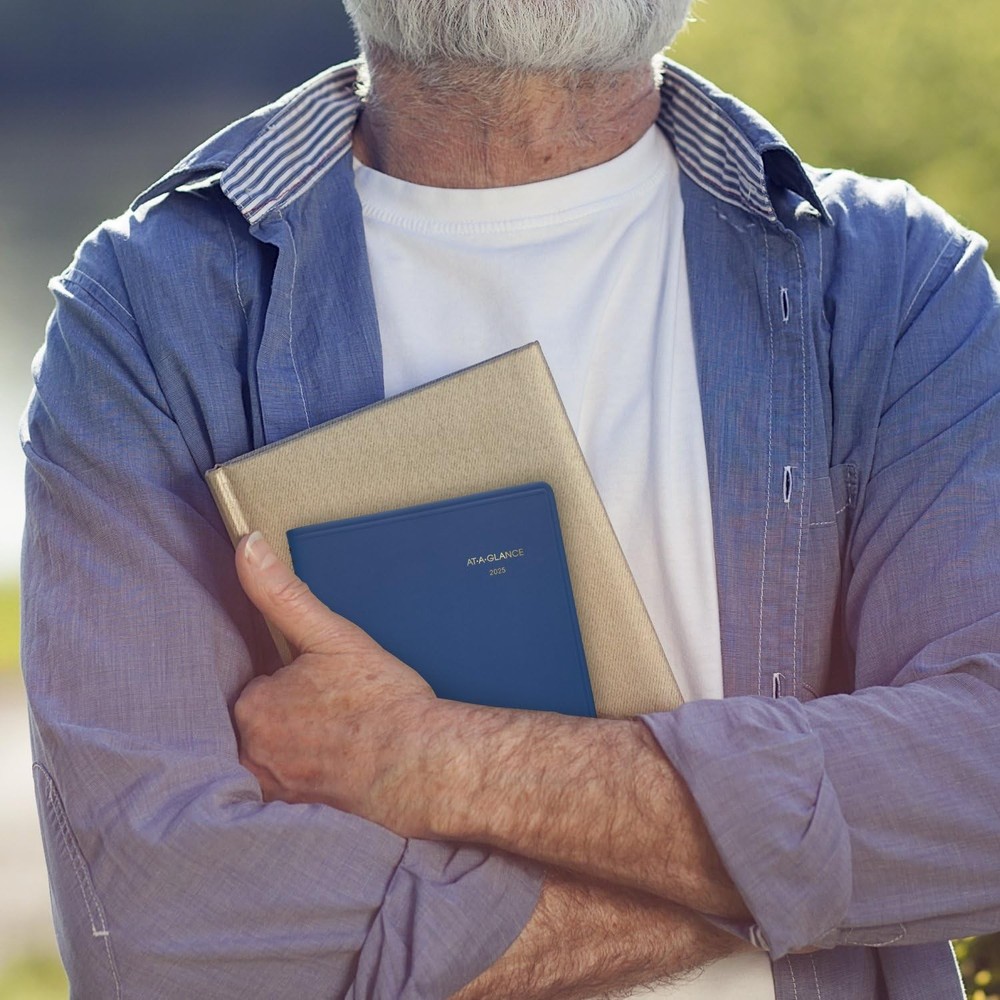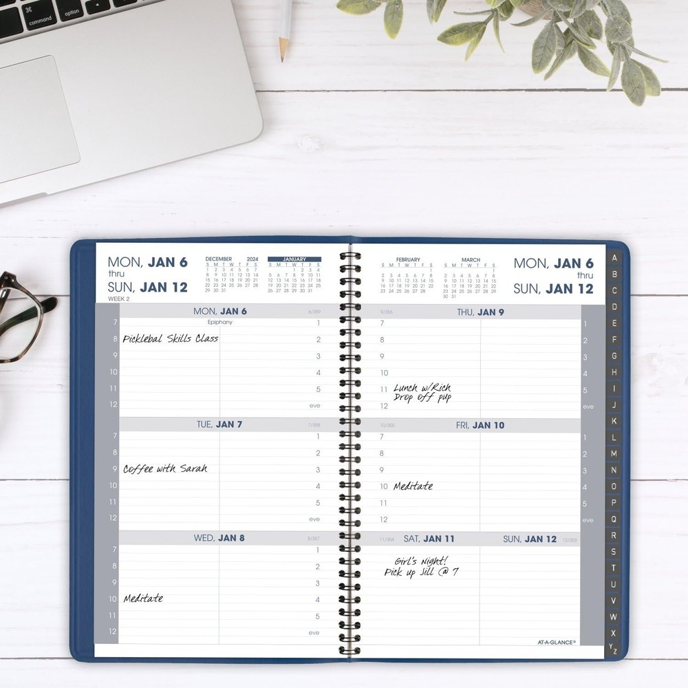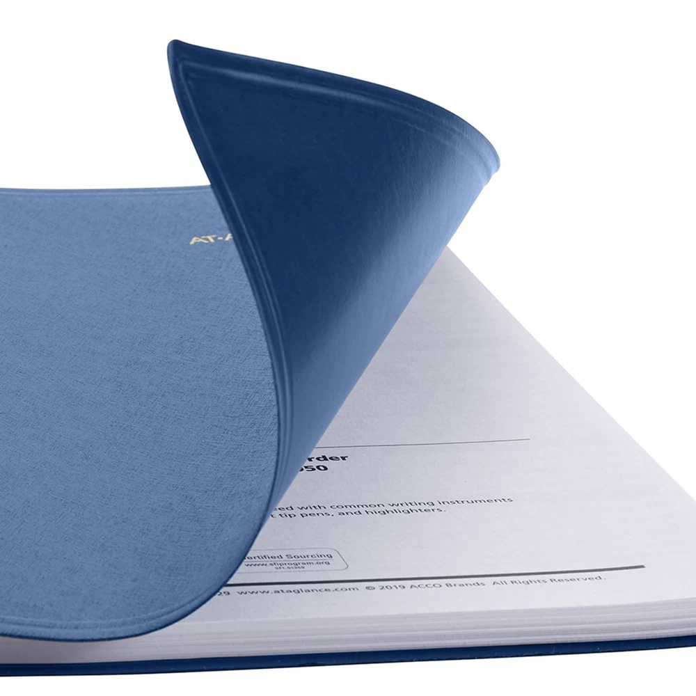 YEAR ROUND PLANNING – Planner covers a 12-month date range from January 2025 — December 2025. Guaranteed to last all year.* GUARANTEED TO LAST ALL YEAR – ACCO Brands will replace any defective planner that is returned within year from the date of purchase. This does not cover damage due to misuse or abuse. INK BLEED RESISTANCE – Plan your schedule without fear of distracting ink bleeding. Our high-quality paper is designed for ink bleed resistance, which keeps plans neat and legible. WEEKLY OVERVIEWS – week per page spread feature hourly appointment times from 7:00 a.m. – 5:00 p.m. Monday – Friday. Weekends are condensed and untimed. Pages measure 5" x 8". SPECIAL FEATURES – Includes a double-sided pocket, a tabbed contacts section and notes page PROFESSIONAL DESIGN – Planner has a blue faux leather cover and twin wire binding to help keep pages secure ASSEMBLED IN THE U.S. – Thoughtfully designed and assembled in the U.S. using high-quality materials