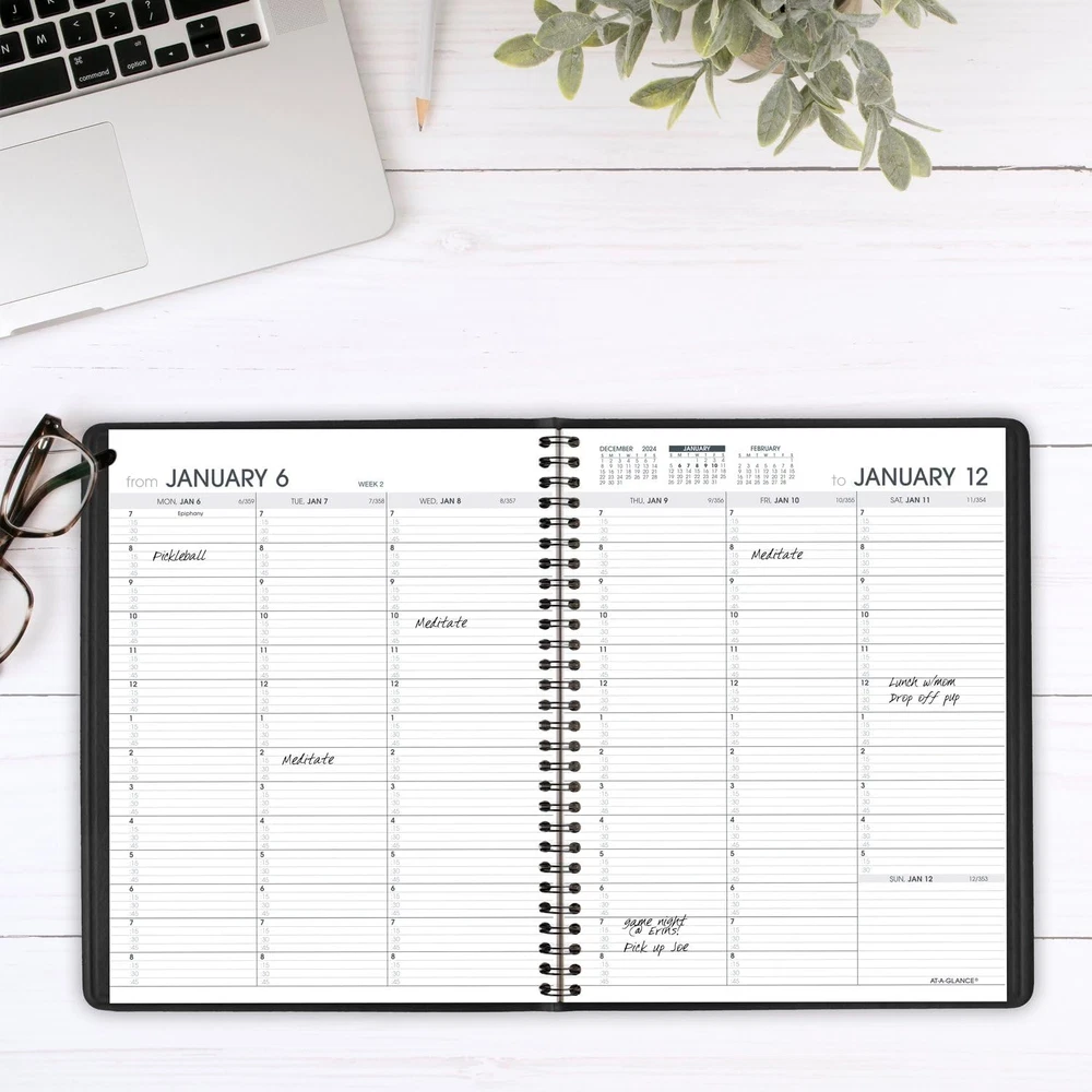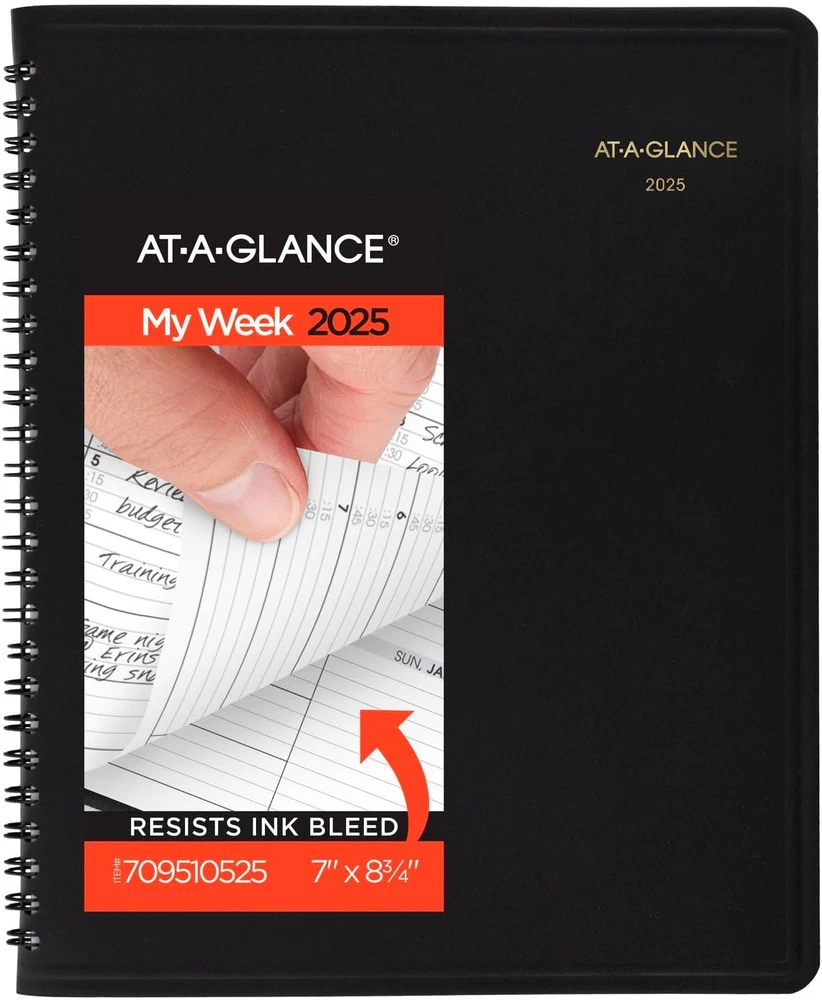 YEAR ROUND PLANNING – Planner covers 13 months from January 2025 — January 2026. Keep track of important deadlines, special events and more with clear organization. GUARANTEED TO LAST ALL YEAR – ACCO Brands will replace any defective AT-A-GLANCE planner that is returned within one year from the date of purchase. This guarantee does not cover damage due to misuse or abuse. INK BLEED RESISTANCE – Plan your schedule without fear of distracting ink bleeding. Our high-quality paper is designed for ink bleed resistance, which keeps plans neat and legible. WEEKLY OVERVIEW – One week per two page spread has quarter-hourly appointments from 7:00 a.m. – 8:45 p.m. Monday – Friday. Saturday times run 7:00 a.m. – 5:30 p.m. Pages measure 7" x 8-3/4". SPECIAL FEATURES – Special pages include a 3-year reference calendar, personal information page, 3 notes pages and a double-sided pocket for extra storage PROFESSIONAL DESIGN – Take charge of your schedule with classic style. Planner has a black faux leather cover and twin wire binding to help prevent snags and secure pages. ASSEMBLED IN THE U.S. – Thoughtfully designed and assembled in the U.S. using high-quality materials Confidently face every deadline this year with the AT-A-GLANCE Weekly Appointment Book Planner. Covers 13 months from January 2025 — January 2026. Guaranteed to last all year.* Plan your schedule without fear of distracting ink bleeding. High-quality paper is designed for ink bleed resistance, which keeps plans neat and legible. One week per two page spread has quarter-hourly appointments from 7:00 a.m. – 8:45 p.m. Monday – Friday. Saturday times run 7:00 a.m. – 5:30 p.m. Pages measure 7" x 8-3/4". Special pages include a 3-year reference calendar, personal information page, 3 notes pages and a double-sided pocket for extra storage. Take charge of your schedule with classic style. Planner has a black faux leather cover and twin wire binding to help prevent snags and secure pages. Thoughtfully designed and assembled in the U.S. using high-quality materials . *ACCO Brands will replace any defective AT-A-GLANCE planner that is returned within one year from the date of purchase. This guarantee does not cover damage due to misuse or abuse.