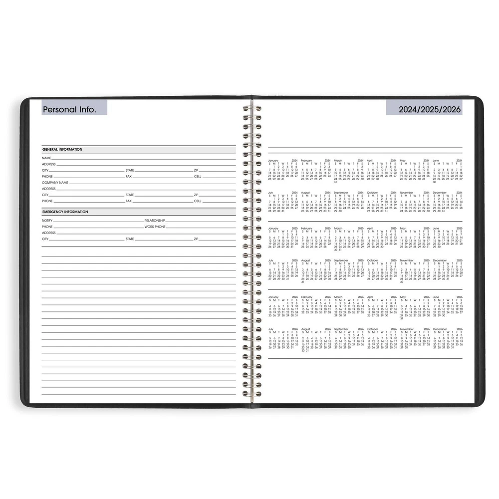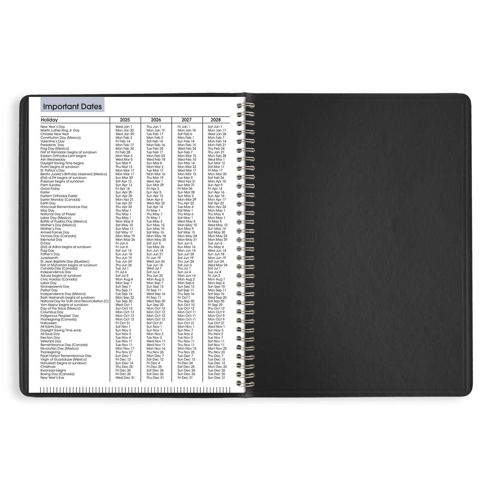 YEAR ROUND PLANNING – Planner covers a 12-month date range from January 2025 — December 2025 with Julian dates GUARANTEED TO LAST ALL YEAR – ACCO Brands will replace any defective planner that is returned within one year from the date of purchase. This guarantee does not cover damage due to misuse or abuse. INK BLEED RESISTANCE – Plan your schedule without fear of distracting ink bleeding. Our high-quality paper is designed for ink bleed resistance, which keeps plans neat and legible. WEEKLY VIEWS – One week per two page spread features ruled hourly appointment times from 7:00 a.m. — 9:45 p.m., Monday — Friday and 7:00 a.m. — 6:35 p.m. on Saturday. Sundays are untimed. Pages measure 8" x 11". SPECIAL FEATURES – Includes a 3-year reference calendar, personal information and important dates PROFESSIONAL DESIGN – Planner has a durable black cover and twin wire binding to help prevent snags and secure pages ASSEMBLED IN THE U.S. – Thoughtfully designed and assembled in the U.S. using high-quality materials