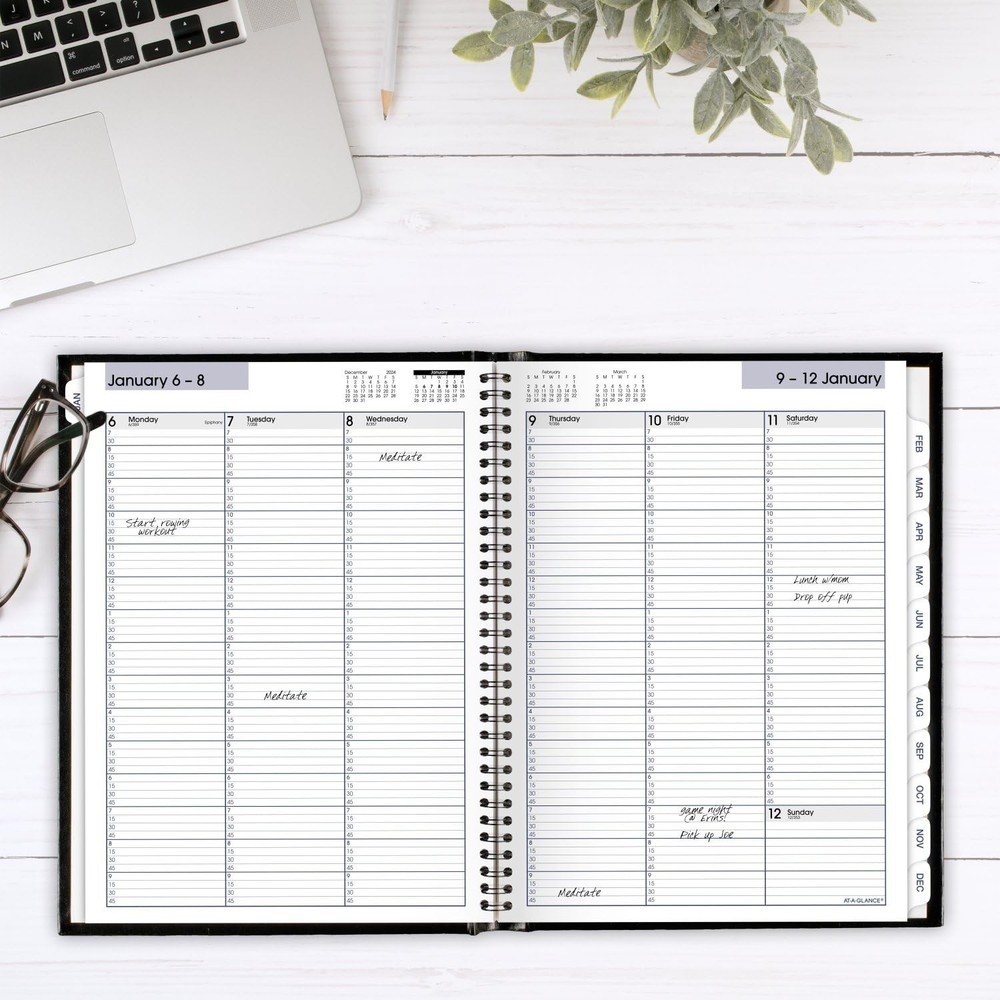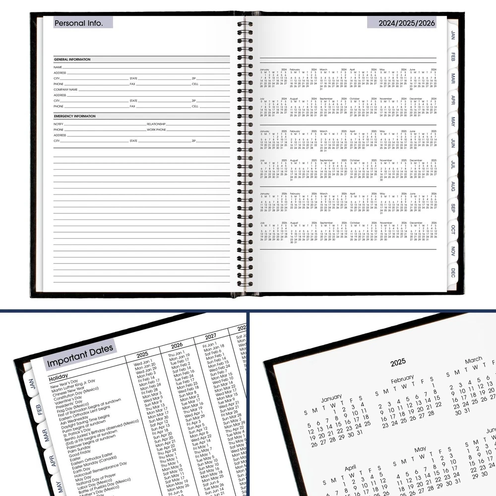 YEAR ROUND PLANNING – Planner covers a 12-month date range from January 2025 — December 2025 with Julian dates GUARANTEED TO LAST ALL YEAR – ACCO Brands will replace any defective planner that is returned within one year from the date of purchase. This guarantee does not cover damage due to misuse or abuse. INK BLEED RESISTANCE – Plan your schedule without fear of distracting ink bleeding. Our high-quality paper is designed for ink bleed resistance, which keeps plans neat and legible. WEEKLY OVERVIEW – One week per two page spread has weekday columns with ruled hourly appointments from 7:00 a.m. — 9:45 p.m., Monday — Friday and Saturday appointments from 7:00 a.m. — 6:45 p.m. Pages measures 5" x 8". SPECIAL FEATURES – Includes a 3-year reference calendar, personal information, important dates and a double-sided pocket PROFESSIONAL DESIGN – Take charge of your schedule with classic style. Planner has a durable, black hardcover and concealed twin wire binding to help prevent snags and secure pages for prolonged use.
