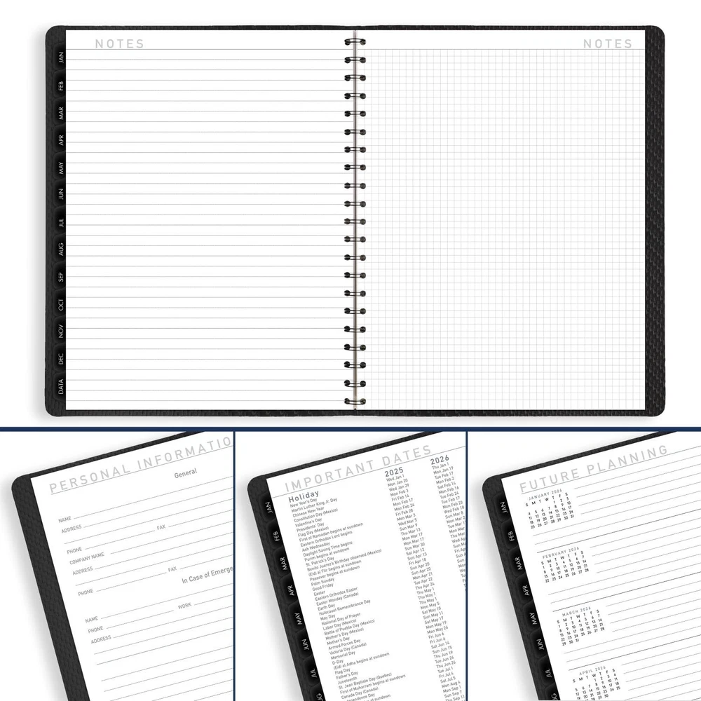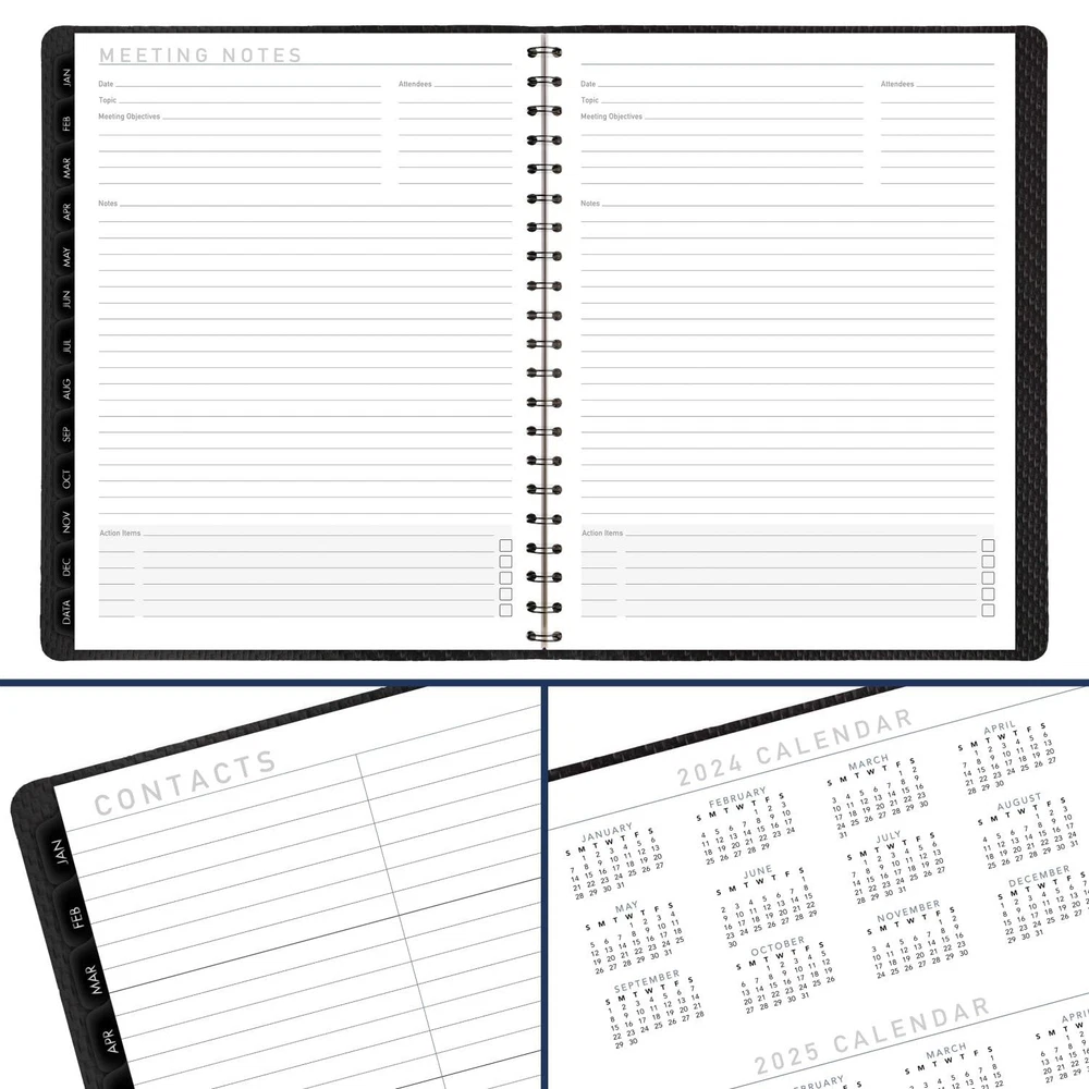YEAR ROUND PLANNING – With 12-month date coverage from January 2025 — December 2025 with Julian dates, you can stay on track, all year long GUARANTEED TO LAST ALL YEAR – ACCO Brands will replace any defective planner that is returned within one year from the date of purchase. This guarantee does not cover damage due to misuse or abuse. INK BLEED RESISTANCE – Plan your schedule without fear of distracting ink bleeding. Our high-quality paper features ink bleed resistance to keep your planning pages neat. WEEKLY & MONTHLY OVERVIEWS – Detail your work week with ruled, half hourly appointments from 8:00 a.m. — 5:30 p.m., Monday to Friday. Months are tabbed for easy navigation. 8-1/4" x 11" page size. ENHANCED ORGANIZATION – Expand your organizational skills. Special pages include over 40 notes pages, a 3-year reference calendar, future planning, important dates and a double-sided poly pocket. MODERN STYLE – Professional materials for professional organization. The durable charcoal faux leather cover with twin wire binding helps prevent snags and secure pages.