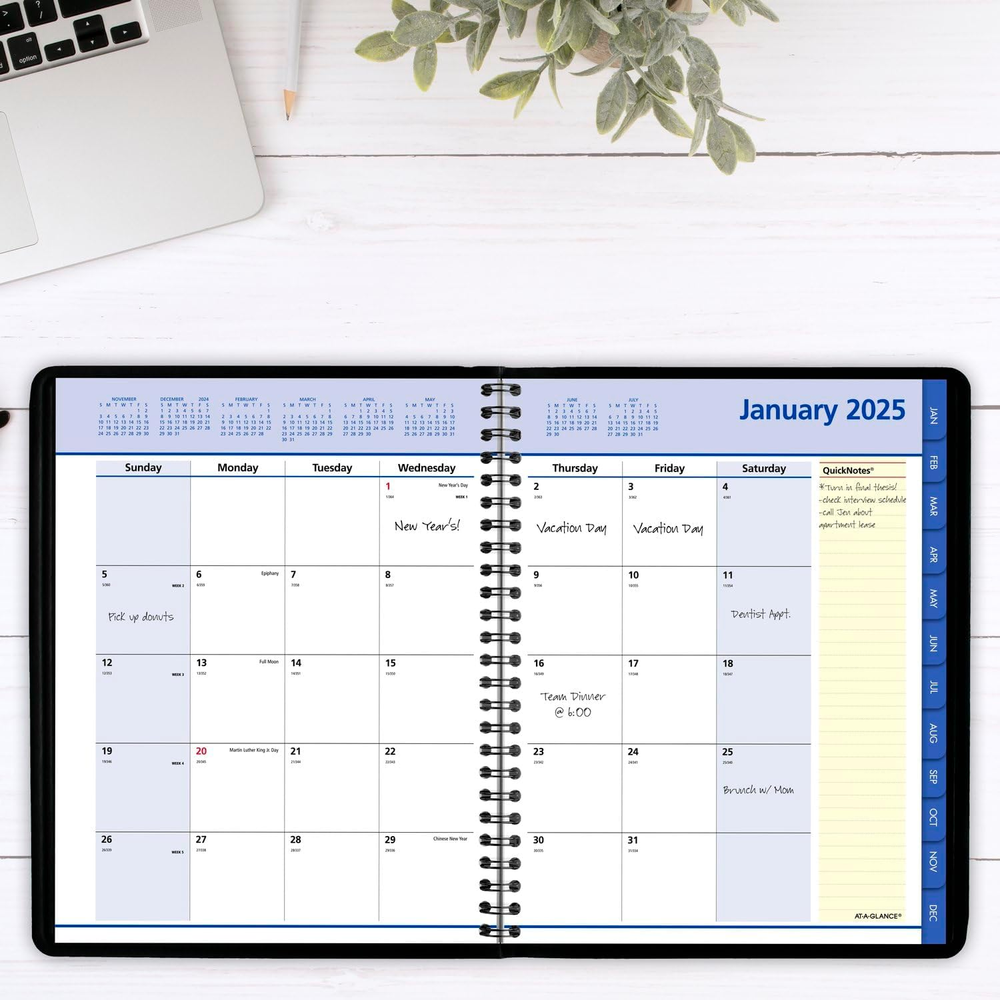 Menu Other Items Feedbacks About Us Contact Us Add To Favorites 2025 Planner, Monthly, 7" X 8-3/4", Medium, Quicknotes, Black (76080525) YEAR ROUND PLANNING – Planner covers 12 months from January 2025 — December 2025 GUARANTEED TO LAST ALL YEAR – ACCO Brands will replace any defective AT-A-GLANCE planner that is returned within one year from the date of purchase. This does not cover damage due to misuse or abuse. INK BLEED RESISTANCE – Plan your schedule without fear of distracting ink bleeding. Our high-quality paper is designed for ink bleed resistance, which keeps plans neat and legible. MONTHLY OVERVIEWS – One month per two page spreads feature unruled daily blocks on one side and a full-page QuickNotes section on the other. 7" x 8 3/4" page size. Daily blocks measure 1-7/16" x 1-3/8". QUICKNOTES REMINDERS – Monthly spreads are tabbed for easy navigation and feature a spacious yellow QuickNotes writing area to create and emphasize important notes, reminders and to-do's SPECIAL FEATURES – Includes 48 full size QuickNotes pages to let you write down ideas and a double-sided storage pocket to hold loose sheets STURDY DESIGN – Take charge of your schedule with a planner that will last all year. Features a black faux leather cover and twin wire binding to help keep pages secure. ASSEMBLED IN THE U.S. – Thoughtfully designed and assembled in the U.S. using high-quality materials Manage your time and keep track of due dates, special events and more with this AT-A-GLANCE QuickNotes Monthly Planner. Date range covers 12 months from January 2025 – December 2025. Guaranteed to last all year.* Plan your schedule without fear of distracting ink bleeding. High-quality paper is designed for ink bleed resistance, which keeps plans neat and legible. One month per two page spreads feature unruled daily blocks on one side and a full-page yellow QuickNotes writing area to create and emphasize important notes, reminders and to-do's on the other. Monthly pages are tabbed for easy navigation. Pages measure 7" x 8-3/4". Daily blocks measure 1-7/16" x 1-3/8". Special features include 48 full size QuickNotes pages and a double-sided poly pocket to store loose sheets. Planner has a black faux leather cover and twin wire binding to help keep pages secure. Thoughtfully designed and assembled in the U.S. using high-quality materials. *ACCO Brands will replace any defective AT-A-GLANCE planner that is returned within one year from the date of purchase. This does not cover damage due to misuse or abuse. Item Specification Style 2025 New Edition Material Paper Item Dimensions L x W 7"L x 7"W Format Organizer Color Black Material Type Paper Cover Material Faux Leather Calendar Type Monthly Binding Spiral-bound Item Weight 6.24 ounces Pattern Name Planner - Medium Model Year 2025 Year 2025 Additional Features 48 full size QuickNotes pages, double-sided storage pocket Target Audience Teacher, Adult, Student Recommended Uses For Product daily planning, monthly planning, yearly planning, note-taking Dimensions Shipping Returns Additional Info Product Dimensions: 7.5 inches x 9.31 inches x 0.5 inches. Weight: 6.24 oz Fast shipping is very important for us. Our standard shipping service is FREE. Your order will be shipped within 1-3 business days upon full payment received. Most items are delivered within 3-5 business days, however, please allow 3-10 business days. We are shipping only to USA. We only ship to the confirmed Paypal address. We reserve the right to cancel any order for any reason at any time. We are not responsible for undeliverable addresses. We offer a 30 day return policy from checkout winning date. Your satisfaction is guaranteed! If for any reason you are unhappy with your item, just return it within 30 days for a full refund, minus shipping cost. Please contact us prior to initiating a return so that we can issue you a refund authorization. Items defective upon receipt must be packaged in their retail packaging as if new and returned with a detailed description of the problem. Return shipping fees are not refundable. We reserve the right to decline any returns if the above guidelines are not followed. All of our items, unless otherwise stated, will only run on 120 volts. Please check to make sure your country complies with these specifications. If you have a problem or question regarding your transaction please contact us before leaving any type of feedback. We will work with you to resolve any problem you may have.