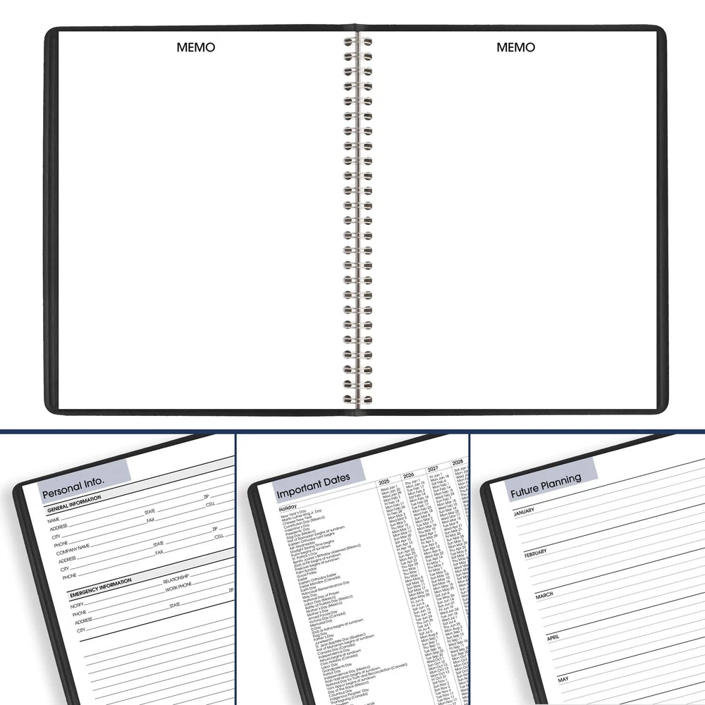 YEAR ROUND PLANNING – Planner covers a 12-month date range from January 2025 — December 2025 with Julian dates GUARANTEED TO LAST ALL YEAR – ACCO Brands will replace any defective planner that is returned within year from the date of purchase. This does not cover damage due to misuse or abuse. INK BLEED RESISTANCE – Plan your schedule without fear of distracting ink bleeding. Our high-quality paper is designed for ink bleed resistance, which keeps plans neat and legible. MONHTLY VIEWS – month per page spread features unruled daily blocks and six reference calendars. Pages measure 7" x 8-3/4". Daily blocks measure 1-1/2" x 1-1/2". SPECIAL FEATURES – Includes future planning, personal information, memo and expense tracking pages PROFESSIONAL DESIGN – Planner has a durable black cover and twin wire binding to help prevent snags and secure pages ASSEMBLED IN THE U.S. – Thoughtfully designed and assembled in the U.S. using high-quality materials