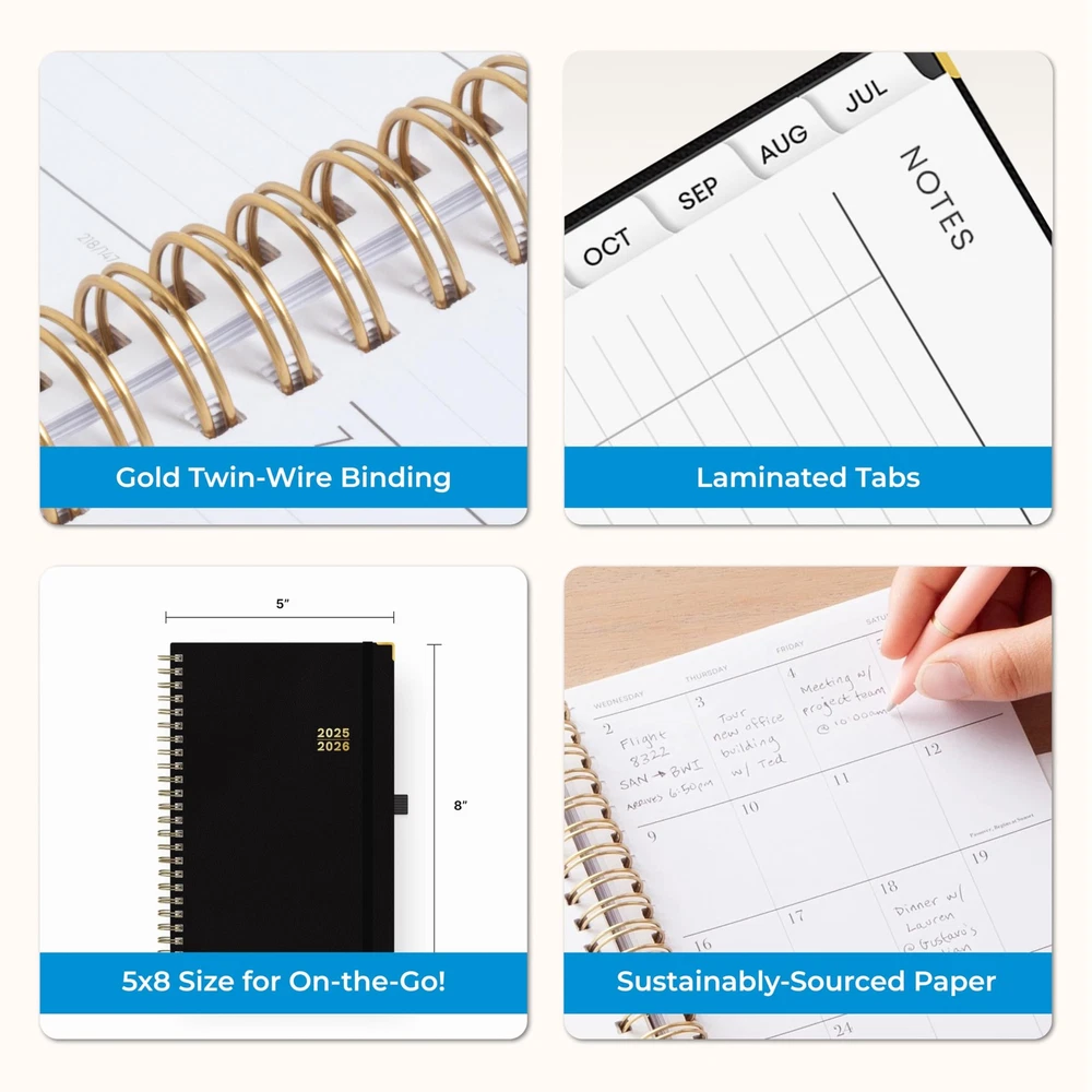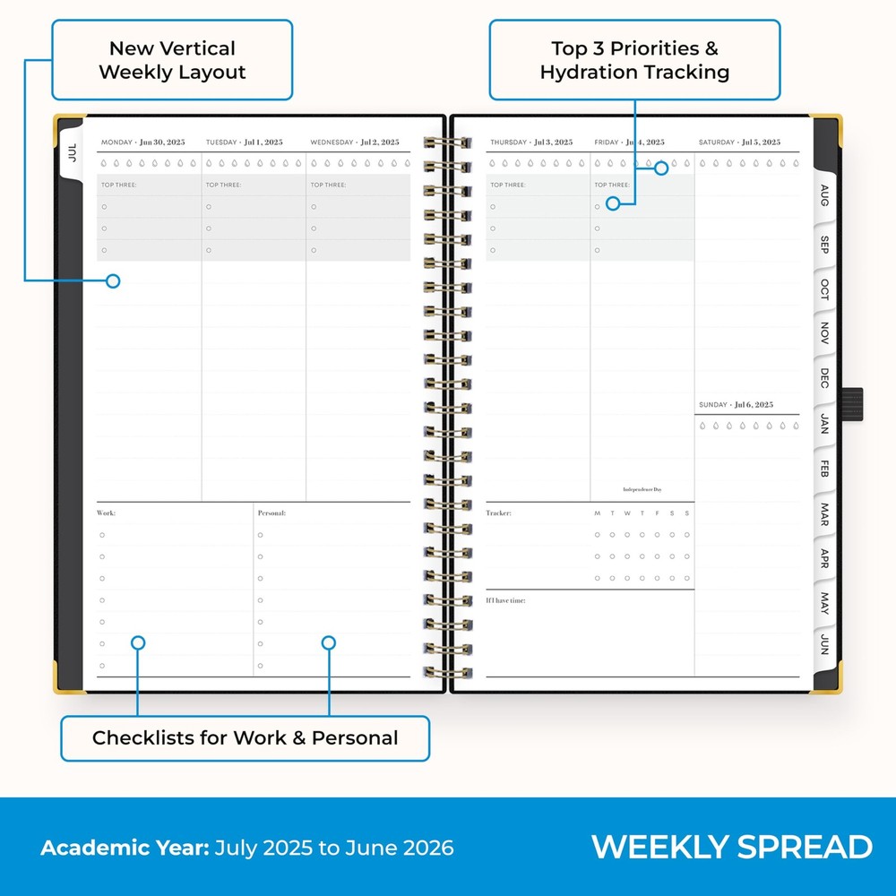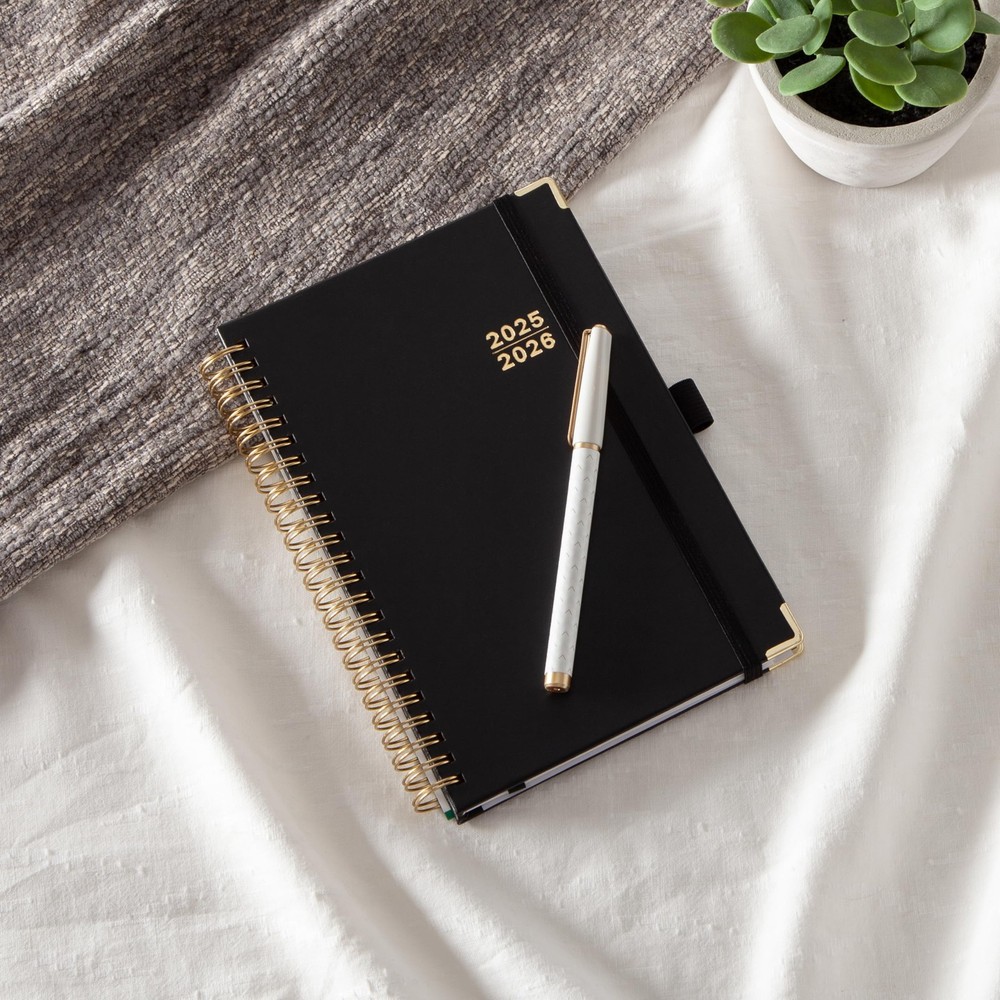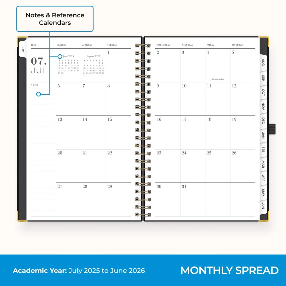 Plan your year in style with the beautiful black and gold cover and gold wire binding of this 2025-2026 academic year planner. This chic weekly and monthly planner will keep you organized everywhere you go. Simple page designs add a touch of sophistication and offer plenty of room for all of your important information. Designed with practicality and ease of use in mind, this academic agenda's monthly calendar tabs allow for easy access to each month’s plans while weekly views offer ample writing space for detailing each day. High-quality white paper provides clean writing space for jotting down your appointments, to-dos and reminders, priorities and habit tracking. Use this dated academic planner to keep track of your appointments, and to write down notes and ideas in one place. Durable tabbed dividers are long lasting and make accessing information a breeze. Premium quality covers and twin-wire binding provide reliable durability for daily use. Stay on track throughout the academic year with this small 5” by 8” planner dated July 2025 - June 2026. Mix and match with other planning products from to organize your daily life. creates modern and sophisticated organizational planners and calendars to fit the scheduling needs of busy people - whether it’s for business professionals, college students, teachers, or anyone with appointments to make note of. Keep your life organized with our full line of products including desk pad calendars, wirebound tabbed weekly and monthly planners with contacts and notes pages to accommodate your scheduling needs, and laminated two-sided wall calendars, all in a variety of colors and patterns to suit your lifestyle and personality. [STAY ORGANIZED ALL YEAR] July 2025 - June 2026 day planner with 12 months of monthly and weekly pages for easy academic planning and scheduling; 2 additional monthly pages (May 2025 - June 2025) are included [MONTHLY & WEEKLY LAYOUTS] Monthly layouts contain previous and next month reference calendars for long-term planning, and a notes section for important projects; Major holidays listed, elapsed and remaining days noted. Weekly view pages offer ample lined writing space for more detailed planning, allowing you to keep track of your appointments, reminders, ideas and to-do lists every day of the week [YEARLY OVERVIEW] Yearly calendar planner includes a convenient list of holidays, reference calendars, contacts pages and extra notes pages to accommodate your scheduling needs [BUILT TO LAST] Designed with a faux leather hard cover and premium pages that endure daily use while maintaining a sleek, professional look. Printed on quality FSC-certified paper with convenient laminated tabs that are durable enough to handle daily use throughout the school year [EVERYDAY INSPIRATION] Thoughtfully designed to help you identify goals and create positive, lasting habits this academic year with a habit tracker and space to list daily priorities. Equipped with a handy storage pocket to hold notes and assignments allowing you to keep everything in one place