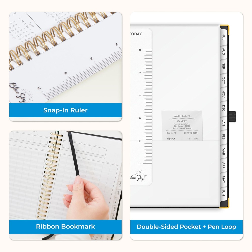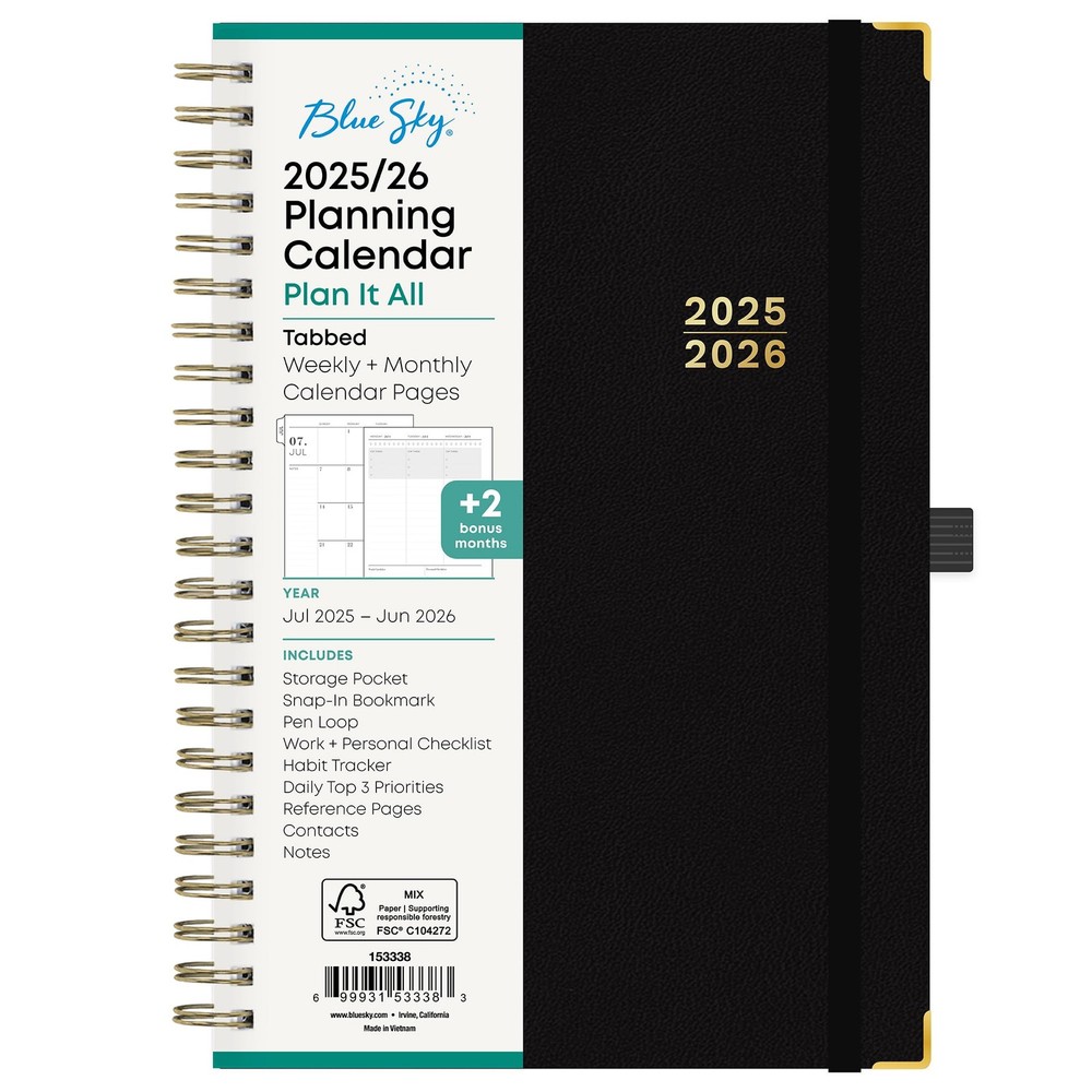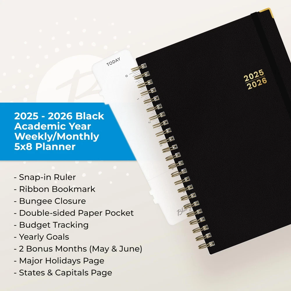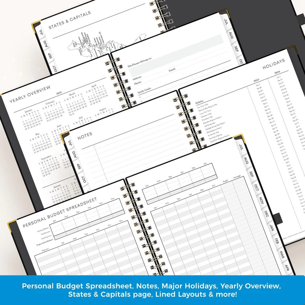 Plan your year in style with the beautiful black and gold cover and gold wire binding of this 2025-2026 academic year planner. This chic weekly and monthly planner will keep you organized everywhere you go. Simple page designs add a touch of sophistication and offer plenty of room for all of your important information. Designed with practicality and ease of use in mind, this academic agenda's monthly calendar tabs allow for easy access to each month’s plans while weekly views offer ample writing space for detailing each day. High-quality white paper provides clean writing space for jotting down your appointments, to-dos and reminders, priorities and habit tracking. Use this dated academic planner to keep track of your appointments, and to write down notes and ideas in one place. Durable tabbed dividers are long lasting and make accessing information a breeze. Premium quality covers and twin-wire binding provide reliable durability for daily use. Stay on track throughout the academic year with this small 5” by 8” planner dated July 2025 - June 2026. Mix and match with other planning products from to organize your daily life. creates modern and sophisticated organizational planners and calendars to fit the scheduling needs of busy people - whether it’s for business professionals, college students, teachers, or anyone with appointments to make note of. Keep your life organized with our full line of products including desk pad calendars, wirebound tabbed weekly and monthly planners with contacts and notes pages to accommodate your scheduling needs, and laminated two-sided wall calendars, all in a variety of colors and patterns to suit your lifestyle and personality. [STAY ORGANIZED ALL YEAR] July 2025 - June 2026 day planner with 12 months of monthly and weekly pages for easy academic planning and scheduling; 2 additional monthly pages (May 2025 - June 2025) are included [MONTHLY & WEEKLY LAYOUTS] Monthly layouts contain previous and next month reference calendars for long-term planning, and a notes section for important projects; Major holidays listed, elapsed and remaining days noted. Weekly view pages offer ample lined writing space for more detailed planning, allowing you to keep track of your appointments, reminders, ideas and to-do lists every day of the week [YEARLY OVERVIEW] Yearly calendar planner includes a convenient list of holidays, reference calendars, contacts pages and extra notes pages to accommodate your scheduling needs [BUILT TO LAST] Designed with a faux leather hard cover and premium pages that endure daily use while maintaining a sleek, professional look. Printed on quality FSC-certified paper with convenient laminated tabs that are durable enough to handle daily use throughout the school year [EVERYDAY INSPIRATION] Thoughtfully designed to help you identify goals and create positive, lasting habits this academic year with a habit tracker and space to list daily priorities. Equipped with a handy storage pocket to hold notes and assignments allowing you to keep everything in one place