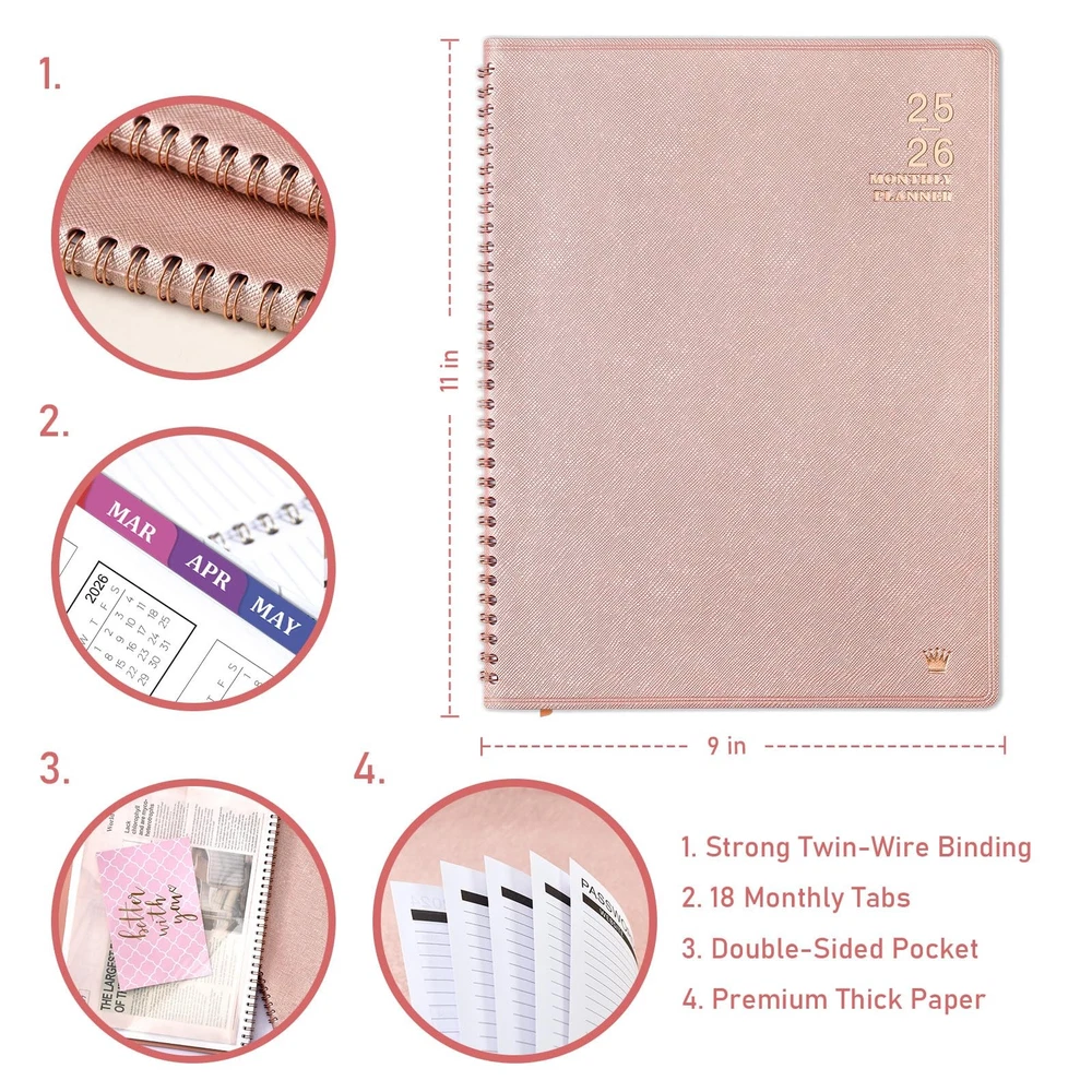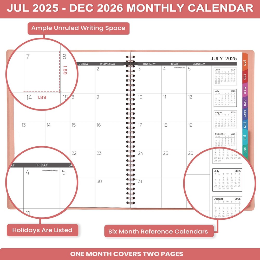 2025-2026 Monthly Planner - 9'' x 11'' JUL. 2025 - DEC. 2026, 18 Monthly Planner Spiral Bound, Monthly Calendar 2025-2026 with Soft Leather Cover, 15 Note Pages, Monthly Tabs, Inner Pocket 2025-2026 Monthly Planner - This beautiful 2025-2026 Monthly Planner covers 18 months which starts from JULY 2025 to DECEMBER 2026. The sizes of this monthly planner 2025-2026 is 8.86 × 11.4 inches(A4), which has a large space for monthly planning and scheduling. Monthly Page Overview - The monthly page of this 2025-2026 monthly calendar planner included Unruled 1.89" x 2" Daily Blocks and Holidays. This page also includes Six Reference Calendars on the right column that be used for your long-term planning. Flexible Leather Cover - This 18 Monthly 2025-2026 calendar planner is made of soft leather, so you can fold it to carry it with you. Soft leather also better protects the paper and reduces wrinkles, which makes this 2025-2026 planner more durable. Functional Designs - | Inner Pocket | Leather Soft Flexible Cover | Twin-Wire Binding | Monthly Tabs | Premium Thick Paper | Contacts | Quick Reference Information | Note Pages | Yearly Overview | Holidays Keep Organizd - This 2025-2026 monthly planner will assist you in setting priorities and organizing your life by helping you schedule your days, weeks, and months. By setting goals at the start of the year and keeping track of your appointments, you may manage and complete your goals in 2025-2026.