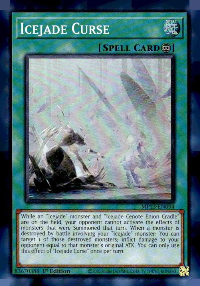 This is a nice example of a 25th Anniversary Tin: Dueling Heroes Mega Pack #MP23-EN094 Icejade Curse Other important information about this card: Super Rare In 2023 Icejade Curse played for the . Please check out our other listings for more great cards.