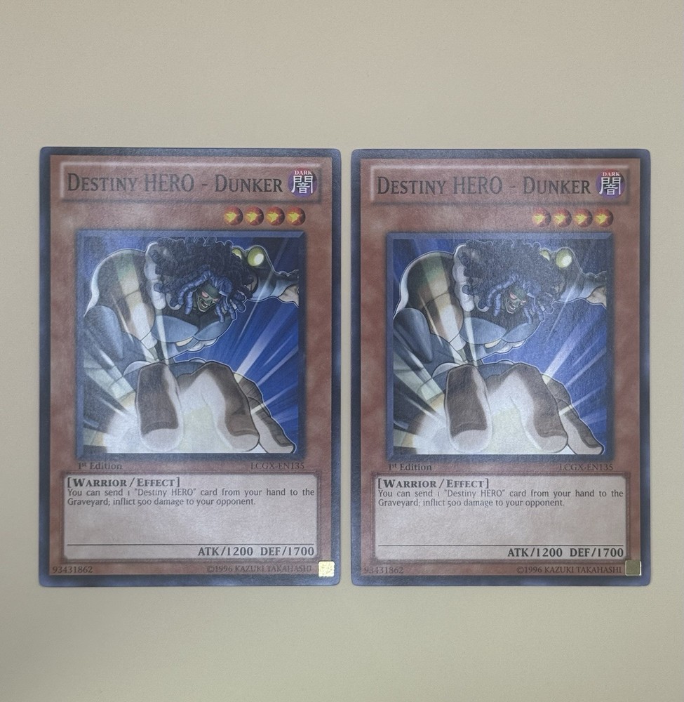 Elevate your Yu-Gi-Oh! TCG collection with the 2x Destiny Hero - Dunker cards from the Legendary Collection 2: The Duel Academy Years set. These enigmatic Dark attribute cards, featuring the valiant Hero creature type, are sure to be a strategic addition to your deck, capable of pouring in the necessary momentum to secure victory. Both cards boast the sought-after 1st Edition stamp, showcasing their original release. With the English language print and rarity classified as Common / Short Print, these Destiny Hero - Dunker cards, numbered LCGX-EN135, are a must-have for both seasoned collectors and aspiring duelists.