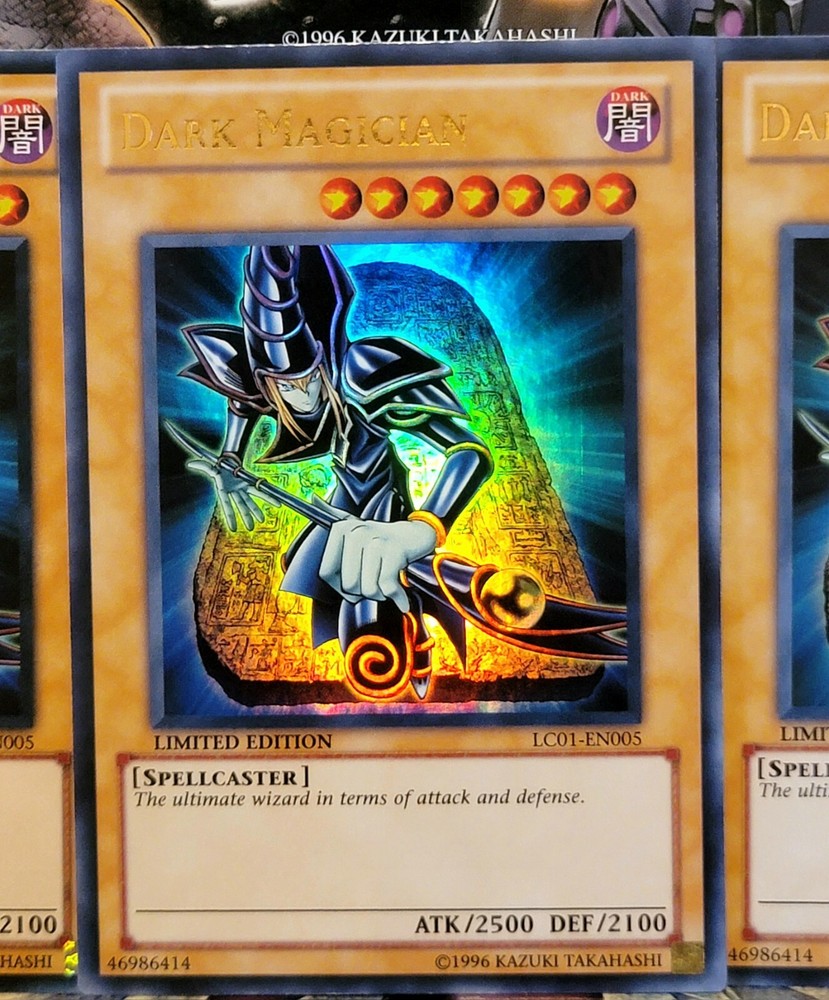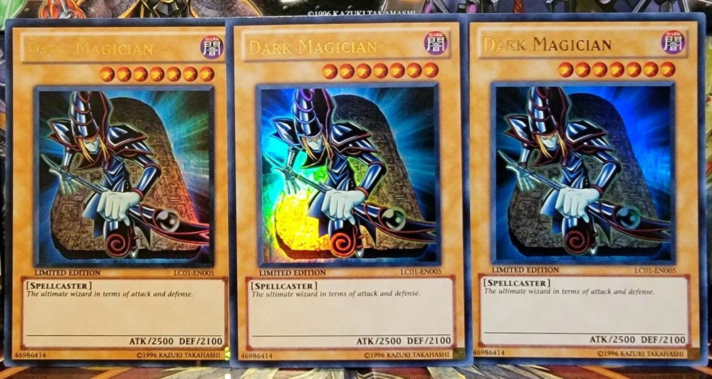 This listing is for three Dark Magician LC01-EN005 limited edition promo cards in near mint or better condition. These ultra rare foil cards feature the spellcaster monster type and are from the Yu-Gi-Oh! TCG Legendary Collection set. Perfect for collectors, these cards are ungraded and have a beautiful shiny finish. Don't miss out on the opportunity to add these promo cards to your collection.