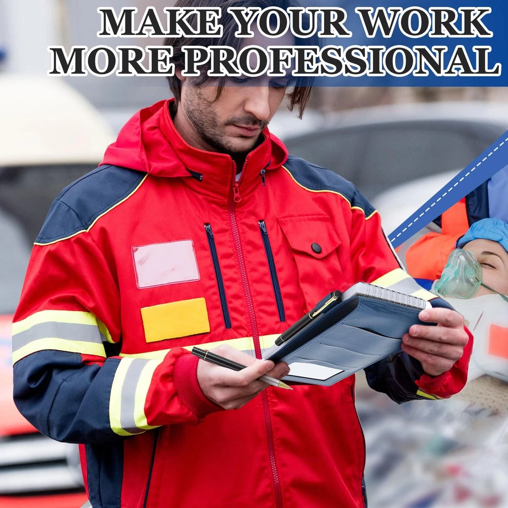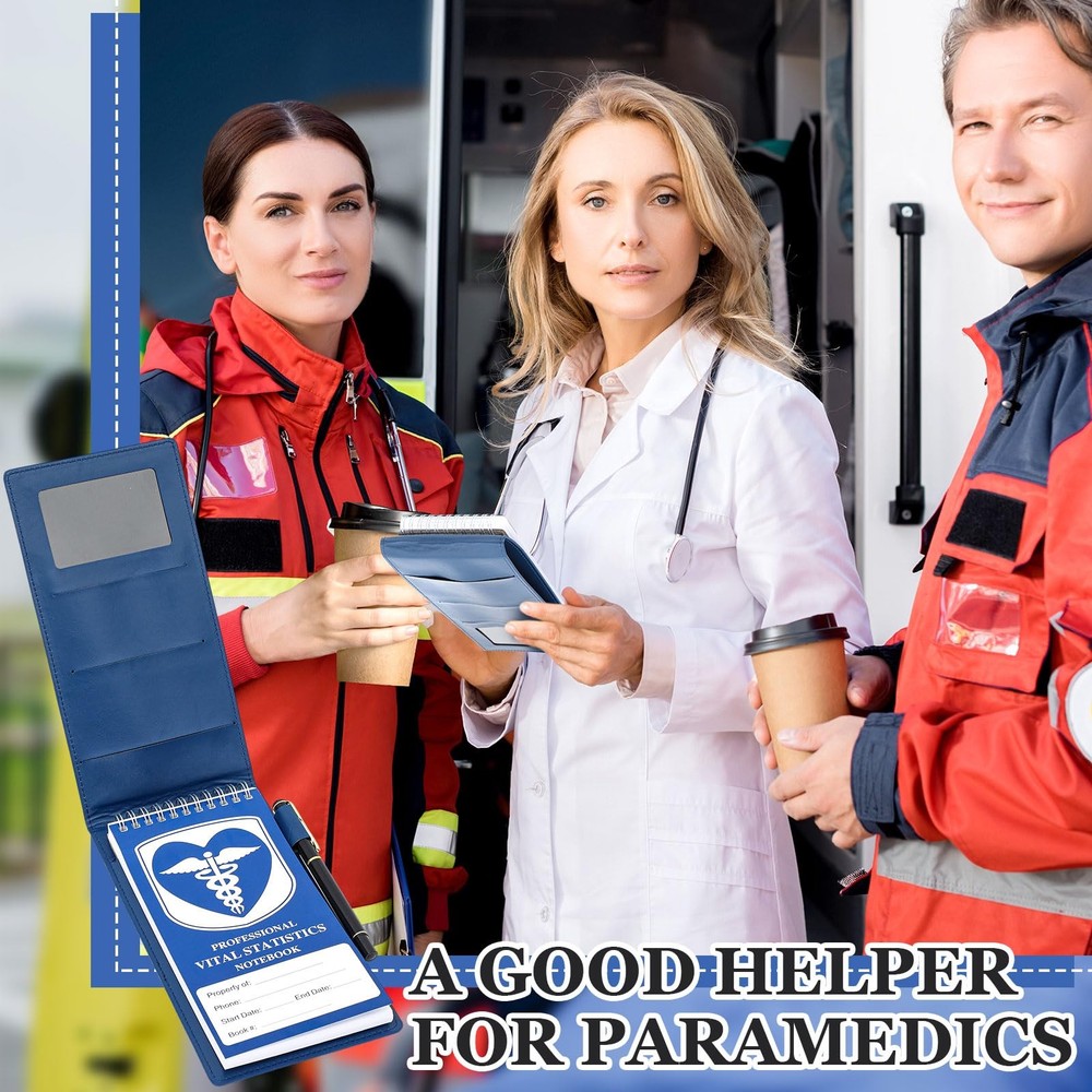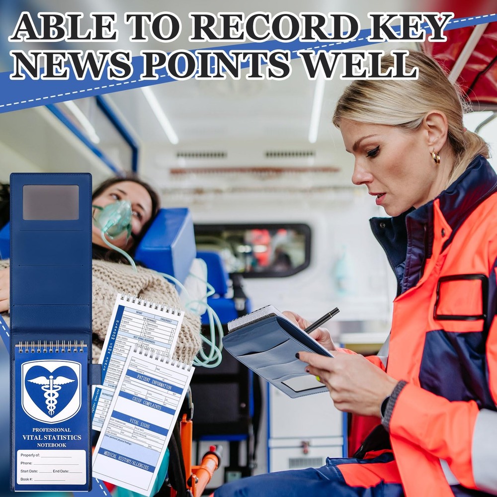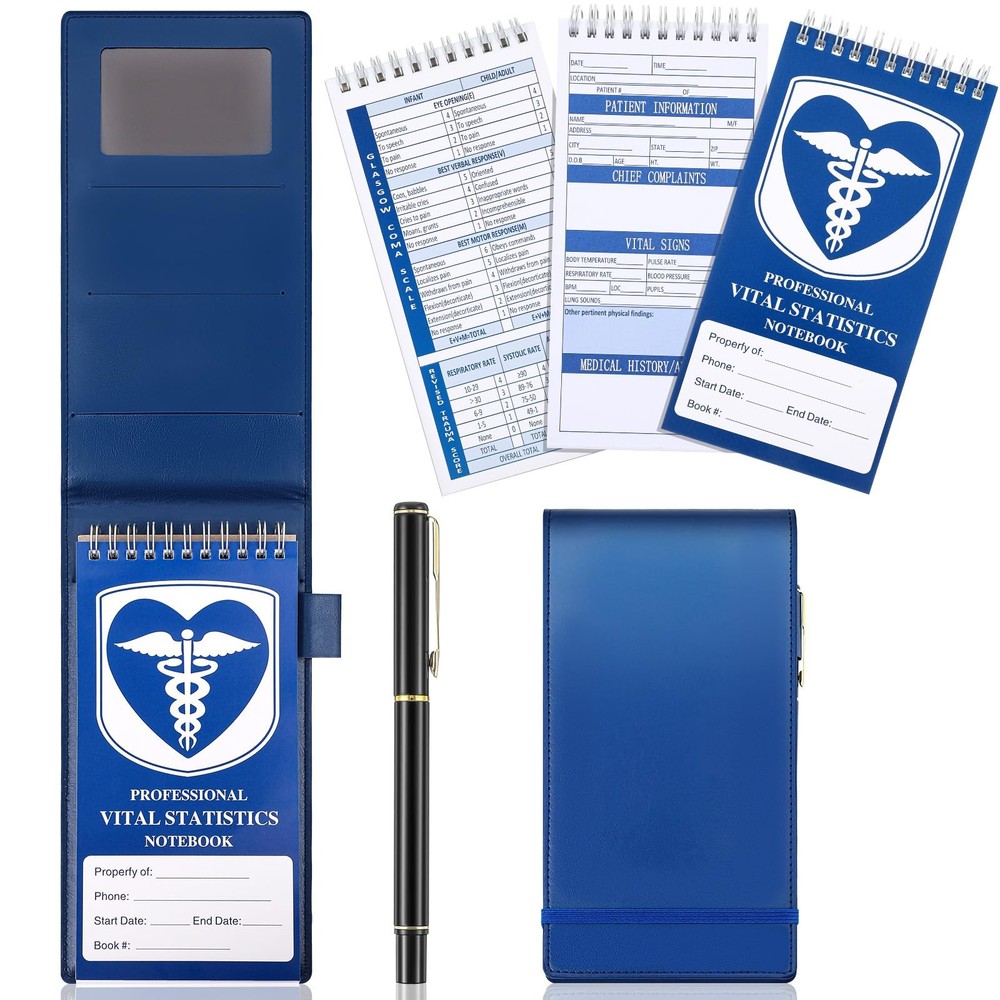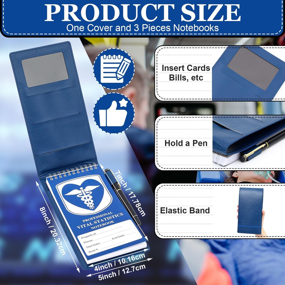 Features: Our steno notebooks top spiral have an outstanding paper quality that reduces ink bleeding, feathering, and offers smooth writing feel, meeting all your note taking needs comfortably. Its black and sleek appearance gives our notebook cover a classic and elegant look, not only provides functionality but also adds an element of style to your daily life, fitting for most people. Specifications: Material: Notebook: paper Notebook cover: PU leather Color: Notebook cover: black Size: Notebook: about 4 x 8 inches Package includes: 3 x EMT vital statistics notebook 1 x PU leather notebook cover 1 x Pen Notes: Manual measurement, please allow slight errors on size. The color may exist a slight difference due to different screen displays. Multipack Bundle: this set includes 3 pieces EMT vital statistics notepad, 1 PU leather notebook cover and a writing pen; The included notebook cover provides an extra layer of protection and keeps your notes secure; Our bundle ensures that you'll always have a place to write down important information or sudden inspiration Robust Materials and Longevity: made from quality paper materials, our first responder notebook offer a firm and stable surface for easy note taking; The PU leather cover withstands wear and tear, offering a sturdy solution for your writing needs Portable Size: each of the EMT vital statistics notebook measures about 4 x 8 inches, pocket size that fits easily and comfortably in a uniform pocket, embodying the nice balance of size and usability; And each pad with 70 sheets, 140 pages, sufficient quantity to meet your shorthand needs Stay Organized: these vital statistics memo pads feature a top bound spiral design for ease of flip; And they are with template for recording key notes, each sheet has individual sections for patient number, time, date and location, making notes more concise and clear. Meanwhile, the notepad holder comes with an elastic closure and pen holder to keep your writing accessories in one place Wide Application: these EMT note pad with notepad holder and pen are ideal for EMT, nurse, doctors and more first responders to log patient vital signs, they are also practical gifts for them on Christmas, New Year, birthday and more