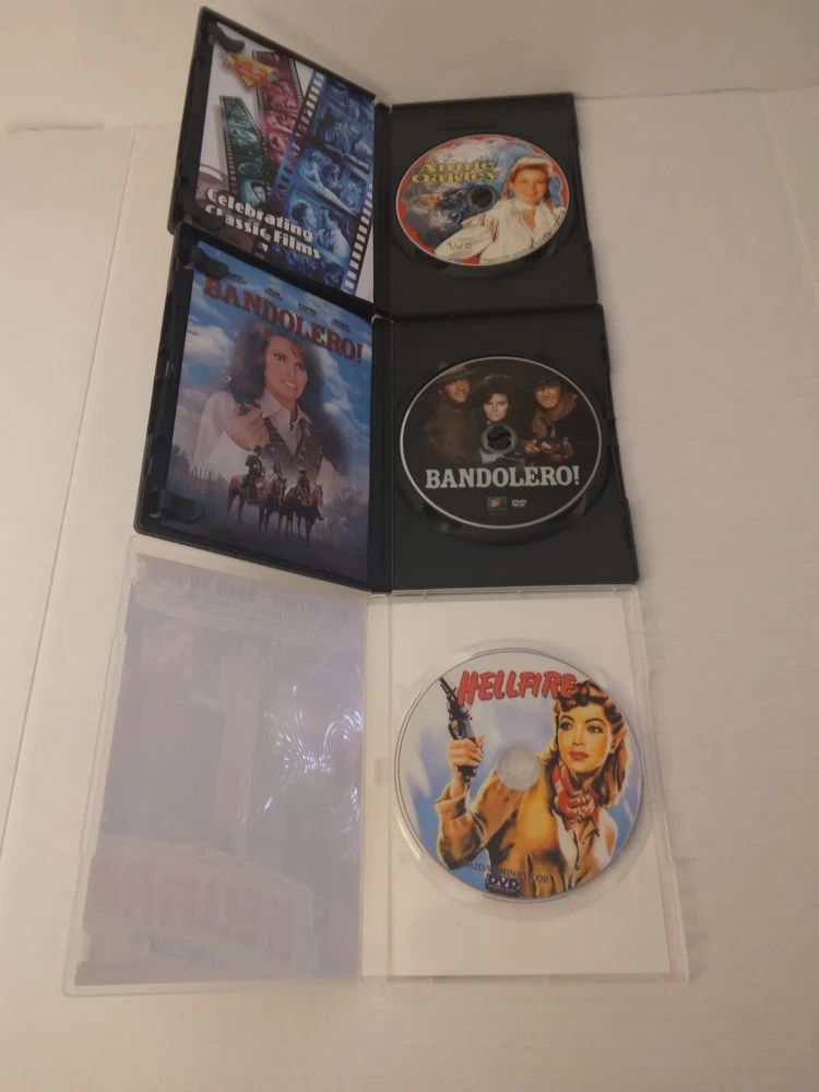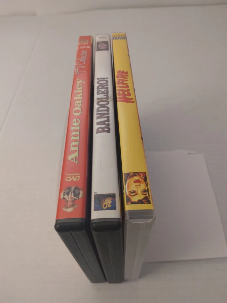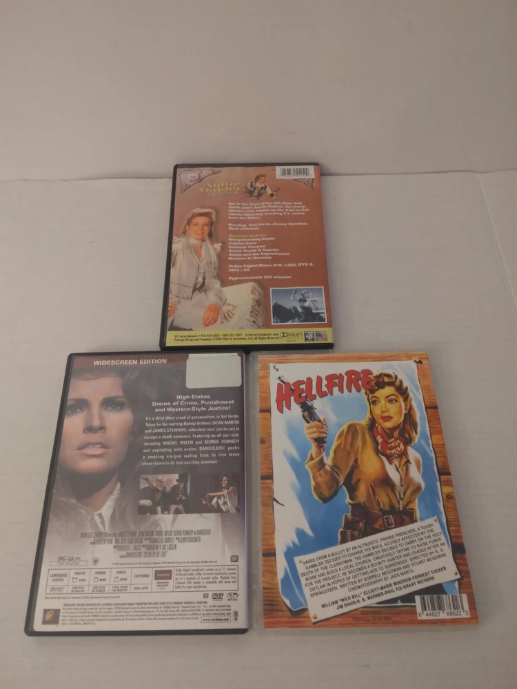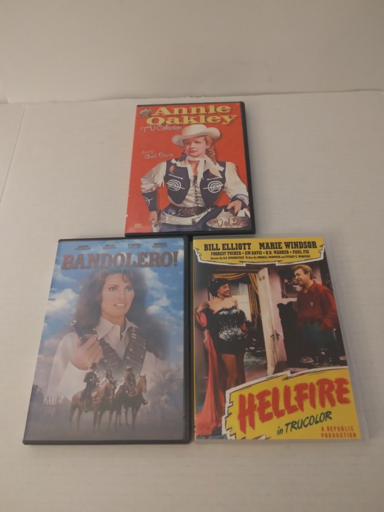 3 Tenacious pistol packing"Mama Jamas". Annie Oakley TV Collection 1954-1956 (2007 DVD). Bandolero 1968 (2003 DVD). Hellfire 1949 (2015 DVD). Cases are in Good Condition with few dent marks and scuff marks. Dvds are in Very Good Condition.