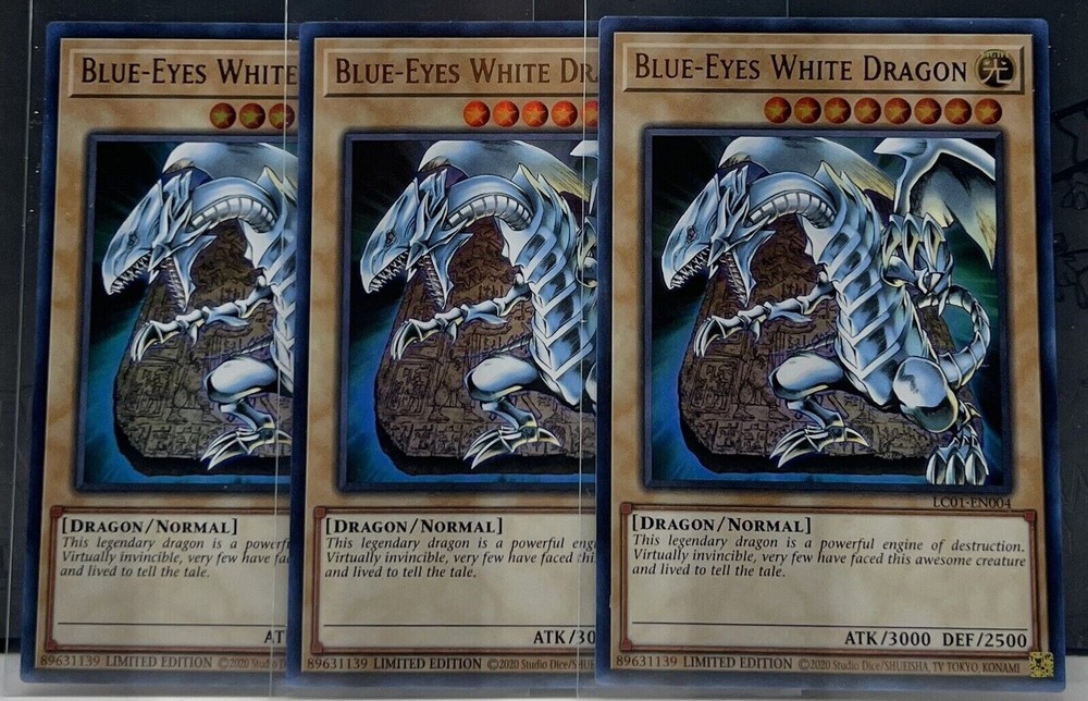 You are bidding on : 3 x Yu-Gi-Oh Legendary Collection 25th Anniversary Edition BLUE-EYES WHITE DRAGON (Play Set of 3 Cards) (Ultra Rare - Limited Edition) LC01-EN004 All cards are in Near Mint condition unless specified Pictures are stock pictures ONLY it is not of the actual card How we identify the condition of the card: Near Mint: Most of the time cards in this condition are pack fresh but, the card may have minor flaws that are not visible with a quick inspection, small white dots or scratches that you have to closely examine the card to see. Excellent: Overall the card looks near mint but may have minor scratches, slightly worn edges that are visible but they do not interfere with the way the card looks. Lightly Played: Similar to a card in excellent condition except there is more whitening around the edges and the corners are a little more worn or slight bends or creases that are visible. There might be some slight whitening on the back or front of the card. Imperfections will be visible with a quick inspection. When the card is sleeved the imperfections will not be noticeable and the card will look just like the rest of your cards Played: There is a large amount of whitening around the edges and the corners have a good amount of damage, many scratches, bends and/or creases on the card. When the card is sleeved it can still be played Shipping and Handling : Canada Shipping is $1.75 CAD Tracking is offered for $13 CAD BUT tracking is required on any purchases that are over $50 CAD Please contact us for combined shipping if interested in purchasing multiple cards before paying USA Shipping is $2.49 CAD Regular Mail for all orders under $19.99 Shipping is $7.99 CAD with tracking for all orders $19.99 and over Please contact us for combined shipping if interested in purchasing multiple cards before paying INTERNATIONAL Shipping is $5.99 CAD with regular mail Tracking is offered for $29.99 CAD BUT tracking is required for purchases over $50 CAD Please contact us for combined shipping if interested in purchasing multiple cards before you pay Combined shipping: We offer combined shipping: each and every additional item after the first one is only $0.25 (25 cents). To obtain combined shipping fees, please use the shopping cart or ask for the combined shipping invoice BEFORE you pay. If you pay item-by-item, right away after the purchase, we will not be able to offer you combined shipping anymore. Handling Your order will be shipped 1-3 business days after payment has been received *“Business days” are normal weekdays. Saturdays, Sundays, and major holidays do not count as business days. Cards purchased are packaged and shipped in a sleeve, toploaders, a team bag and an envelope to ensure protection of cards Payment : Payments should be made within 5 days after purchase Epic Cards and Games Any questions feel free to email us and allow 1 day for a response. Thanks for looking! Sales Tax (Canada Only) : Purchases made by Canadian residents are subject to applicable GST/HST, depending on your province/territory. (If you do not agree to this, please do not bid. We have a registered business in Canada and are required by law to charge taxes to anything shipped within the country.) Thank you for shopping with Epic Cards and Games