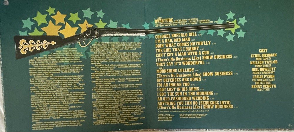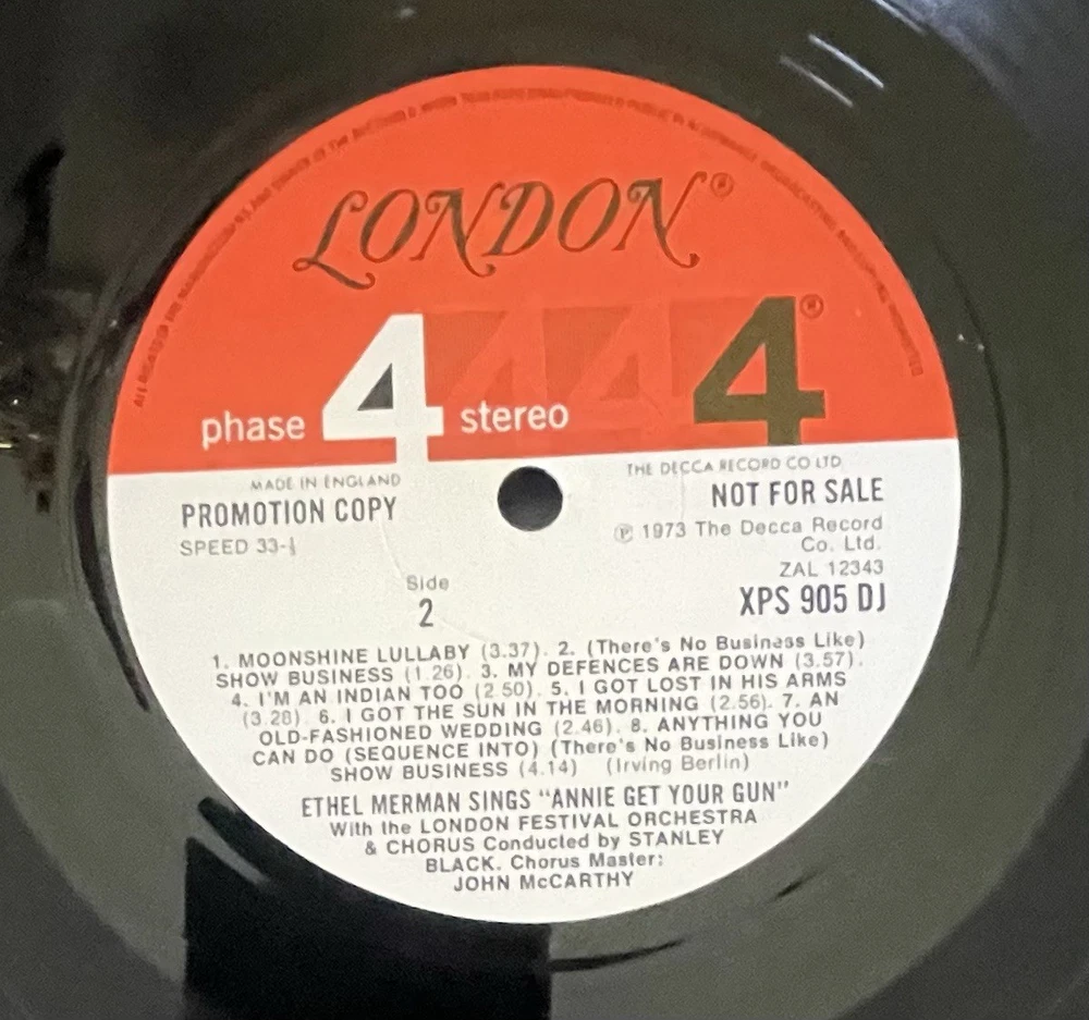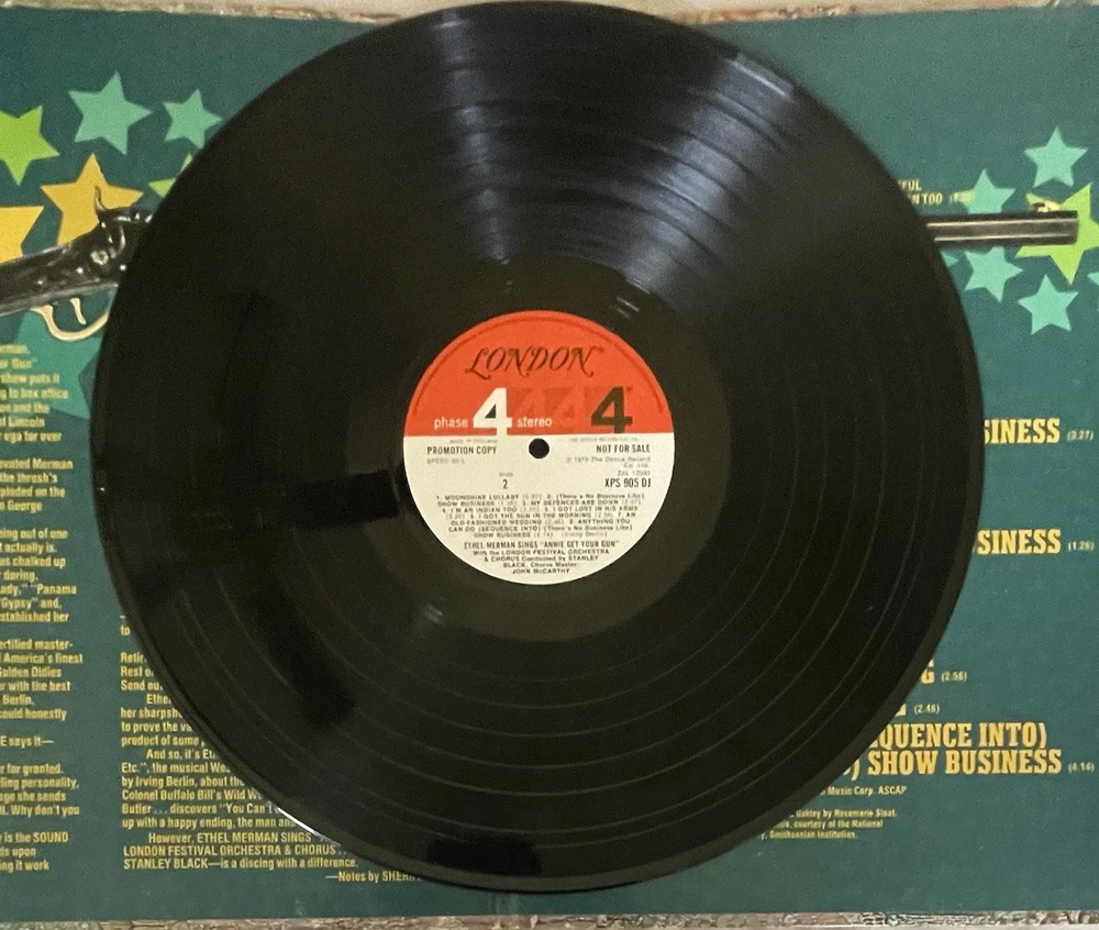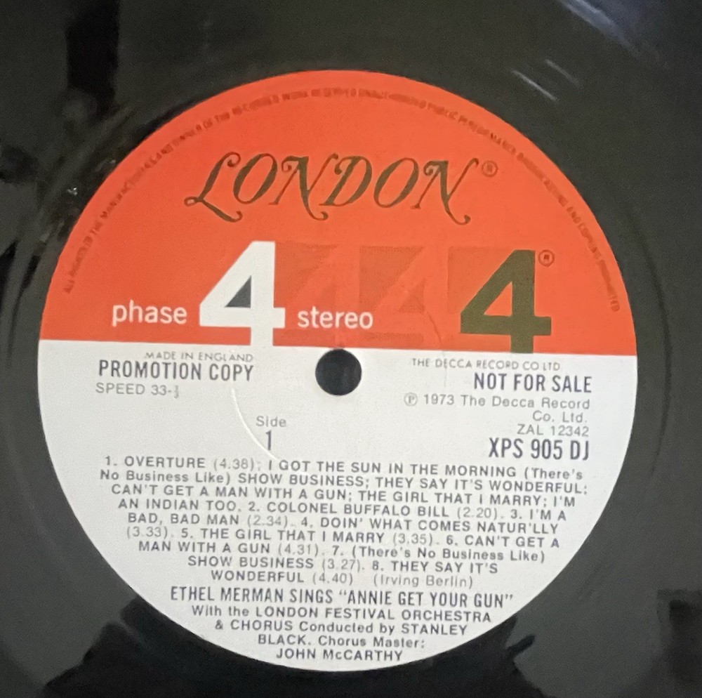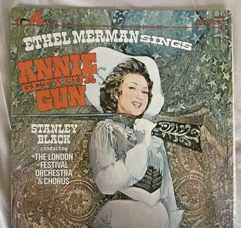 Dive into the world of musicals with Ethel Merman's captivating performance on the 33 LP record, "Annie Get Your Gun." Released in 1973 by London Records, this collectible features the timeless soundtrack from the iconic musical, presented in a classic black vinyl. The album, catalog number XPS 905, spins at 33 RPM, allowing for an expansive audio experience. This particular edition is a promo double LP, boasting an excellent cardboard sleeve and an original inner sleeve that adds to the authenticity of this vintage piece. The gatefold design enhances the visual appeal, making it a striking addition to any vinyl collection. Relish in the stereo sound of The London Festival Orchestra, led by the talented Stanley Black, as you revisit the enchanting melodies of "Annie Get Your Gun."