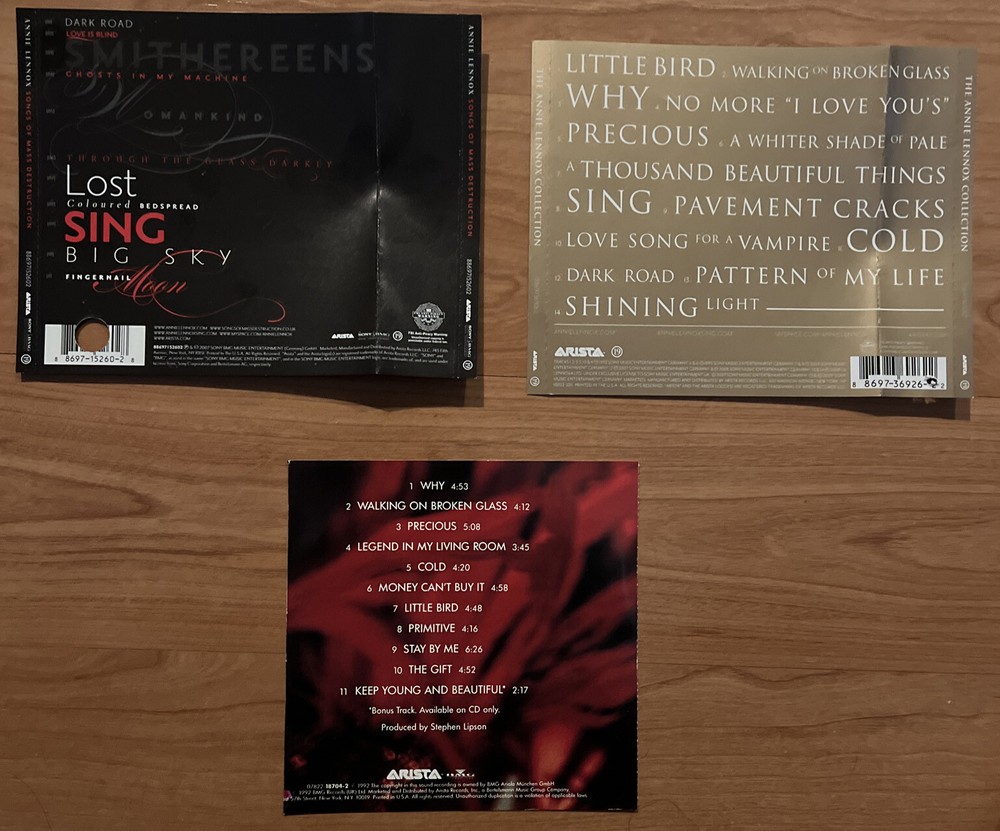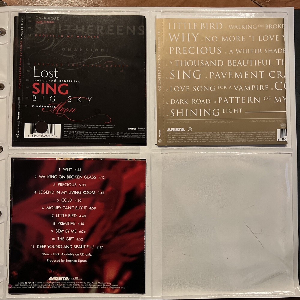 Ships with CD and sleeve material, no jewel case. CD originally stored in a binder and the back cover has been folded or cut. Hole punch in the barcode.. Detail info and photos provided. 3CD LOT OF ANI LENNOX in a SLEEVE PACKAGE SONGS OF MASS DESTRUCTION COLLECTIONS DIVA (back sleeve cut) CD’s and all items come from my personal collection which I am currently downsizing. CD and DVD’s have been stored in binders and being sold without the jewel case. The back covers may have been cut or folded. details provided on each item. I am willing to sell the sleeve package items in a UNIVENTURE BINDER with additional sleeves if interested. Contact me for details and photos. All disc are guaranteed to play and description and grades will be provided. The CD may have spin scuffs or marks but nothing that would effect the play back. I try to provided detail photos but please request or ask questions if you need more info and I will respond within 24 in most cases (sooner if I can) I have been collecting for a very long time and have variety of items please be sure to visit my ebay store and follow me to stay updated with new listings. I try to list 100-200 a month