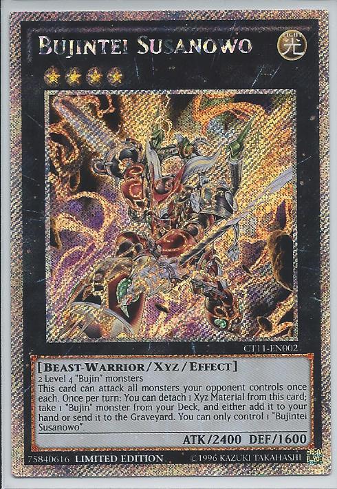 Condition: NEAR MINT Availability: In Stock You are Purchasing 3x Yugioh CT11-EN002 Bujintei Susanowo Platinum Secret Rare Card