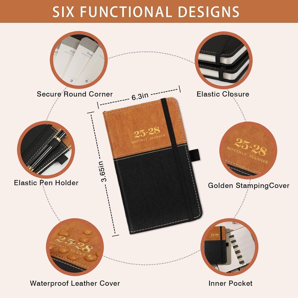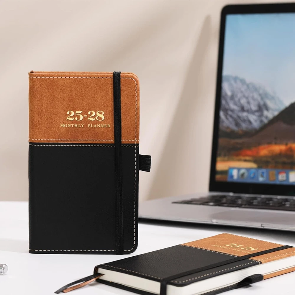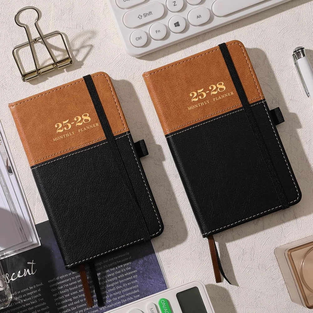 3-Year Pocket Calendar 2025-2028 - 6.4x3.8" Leather Cover w/Elastic Three-Year Pocket Planner Description: This compact monthly organizer covers July 2025 through June 2028, featuring a 6.3" x 3.65" leather-bound design with elastic closure. The two-page monthly spreads include past, current, and upcoming month references for convenient date tracking. Each date box provides adequate writing space while noting various observances throughout the three-year period. Product Specifications: Date range: July 2025 - June 2028 Dimensions: 6.3" x 3.65" (16 x 9.3 cm) Cover material: Leather-like finish Binding: Elastic closure Layout: Monthly format with reference calendars Practical Features: Portable size fits in bags and purses Durable cover material Ample daily writing space Three-month reference views Holiday and observance markings Compact yet functional design Usage Suggestions: Personal schedule management Long-term project tracking Appointment recording Goal planning system Portable date reference Package Contents: 1 leather-bound planner Elastic closure band 36 monthly spreads Reference calendars