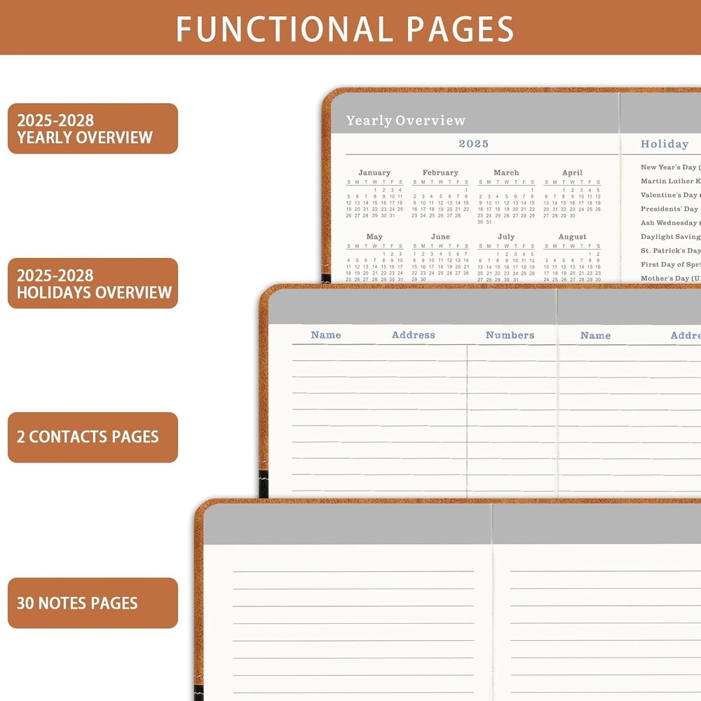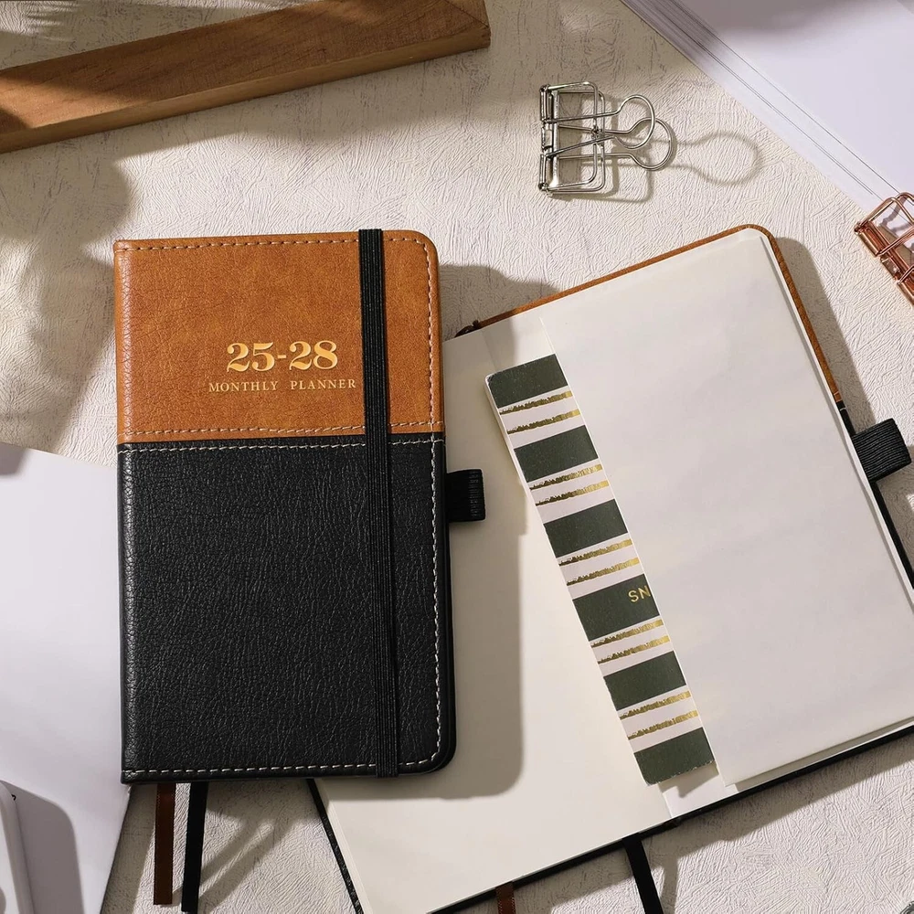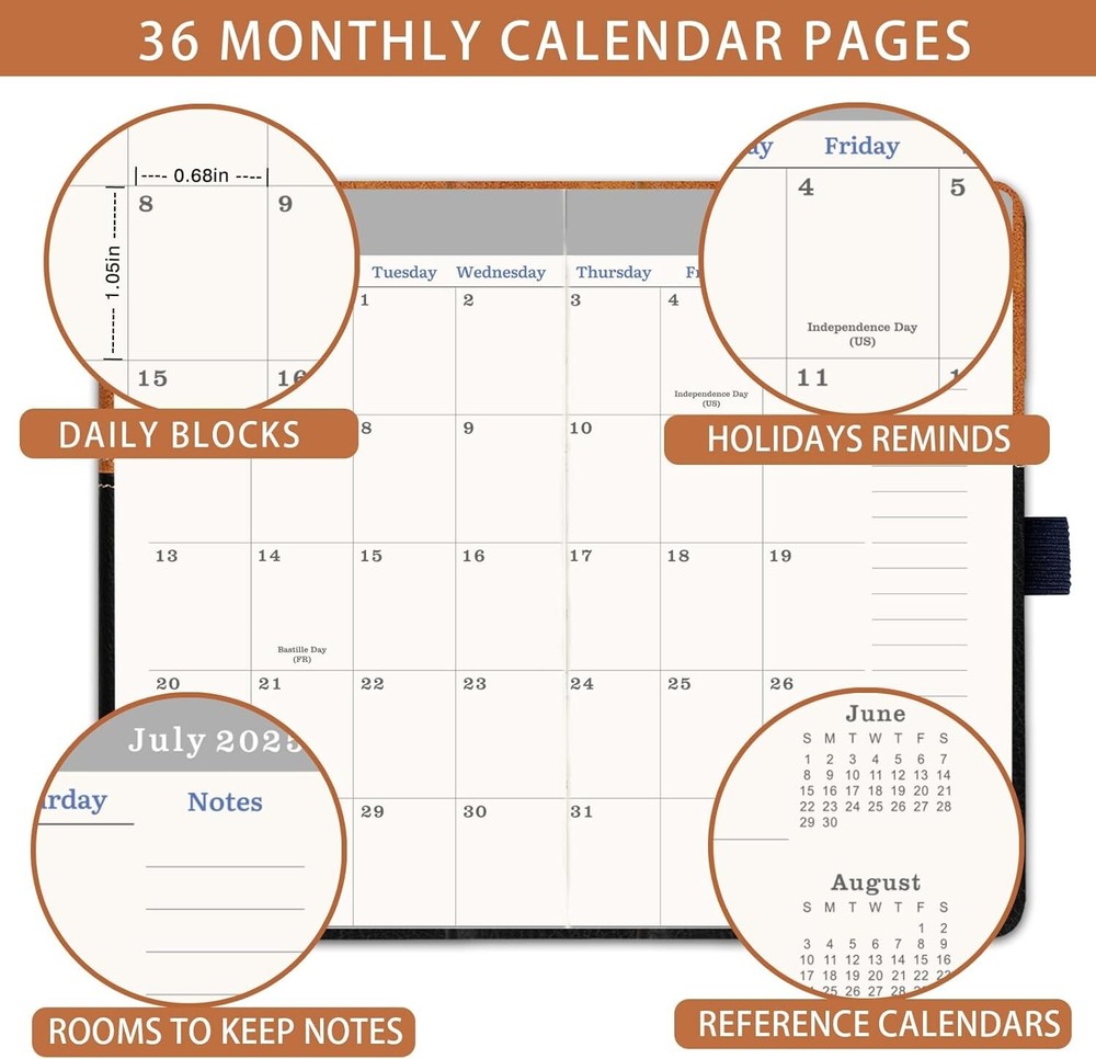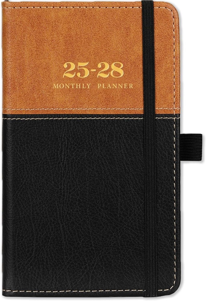 3-Year Pocket Calendar 2025-2028 - 6.4x3.8" Leather Cover w/Elastic Three-Year Pocket Planner Description: This compact monthly organizer covers July 2025 through June 2028, featuring a 6.3" x 3.65" leather-bound design with elastic closure. The two-page monthly spreads include past, current, and upcoming month references for convenient date tracking. Each date box provides adequate writing space while noting various observances throughout the three-year period. Product Specifications: Date range: July 2025 - June 2028 Dimensions: 6.3" x 3.65" (16 x 9.3 cm) Cover material: Leather-like finish Binding: Elastic closure Layout: Monthly format with reference calendars Practical Features: Portable size fits in bags and purses Durable cover material Ample daily writing space Three-month reference views Holiday and observance markings Compact yet functional design Usage Suggestions: Personal schedule management Long-term project tracking Appointment recording Goal planning system Portable date reference Package Contents: 1 leather-bound planner Elastic closure band 36 monthly spreads Reference calendars