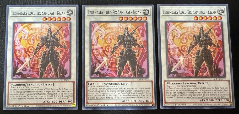 The product is a set of three Yu-Gi-Oh! trading cards featuring the Legendary Lord Six Samurai - Kizan. These 1st Edition Common cards are part of the Yu-Gi-Oh! TCG collection manufactured by Konami. Perfect for collectors and fans of the game, these cards are highly sought after for their rarity and unique design within the Yu-Gi-Oh! universe. Each card is an essential addition to any card game collection, offering a piece of the action-packed world of Yu-Gi-Oh! to enthusiasts and players alike. These cards were taken straight from the pack and placed into a sleeve and top loader for protection. Never played. Thank you for viewing the above listed item. Any, and all trading cards of any genre that are initially listed at $19.99 or less will be shipped in a card protector, placed in a standard white envelope and shipped via eBay standard envelope shipping unless otherwise noted due to weight or thickness. This is to make every effort to reduce shipping costs for the buyer. Trading cards that sell for more than $20, and all other items will be shipped via USPS ground advantage postage, unless otherwise noted. if you have any questions, feel free to ask. PLEASE VIEW PHOTOS CLOSELY. Conditions are as they are seen in the photos. If you need additional photos please ask.