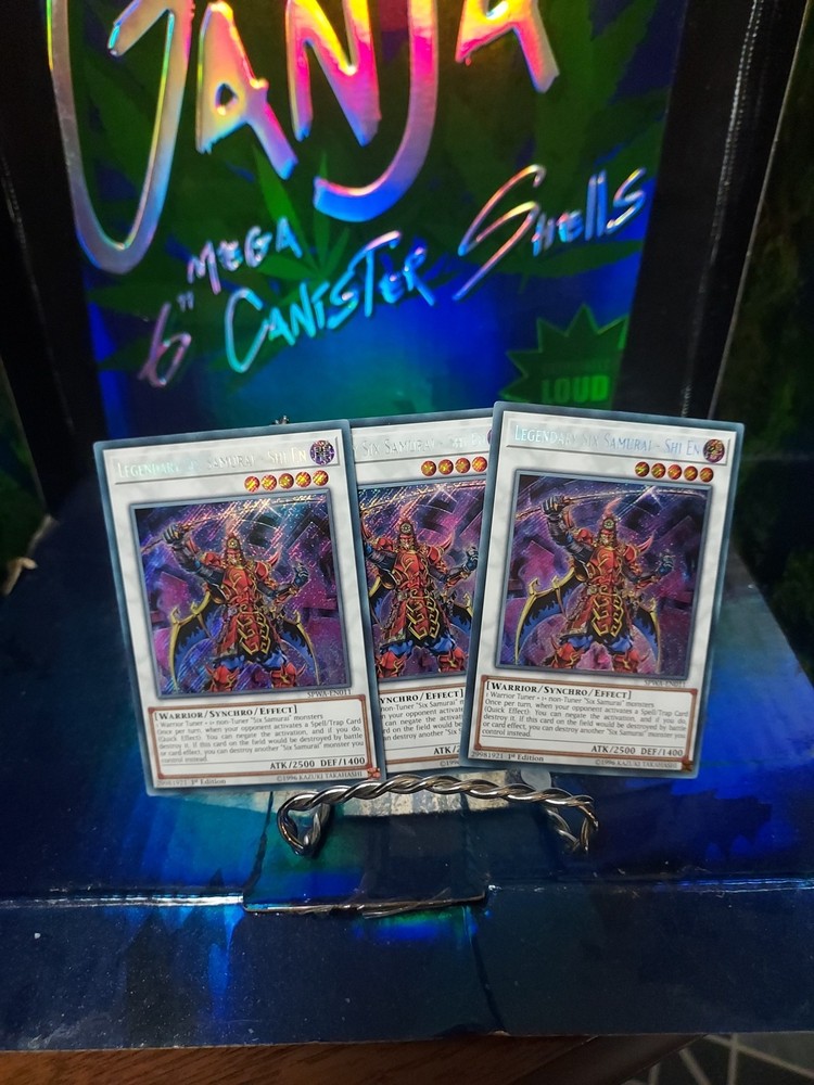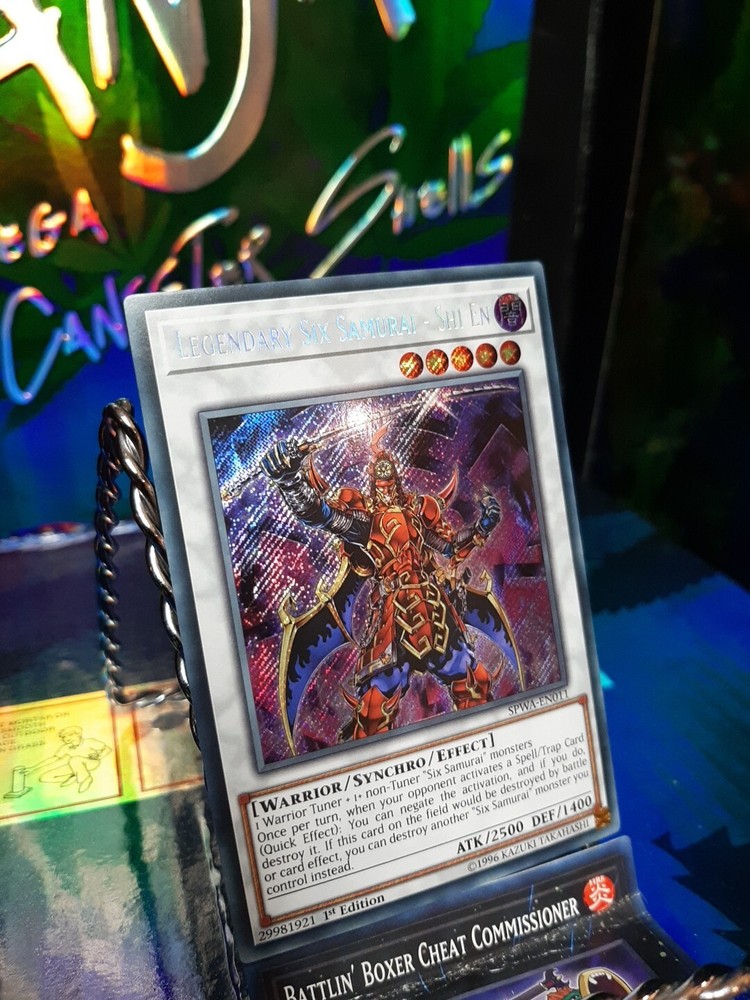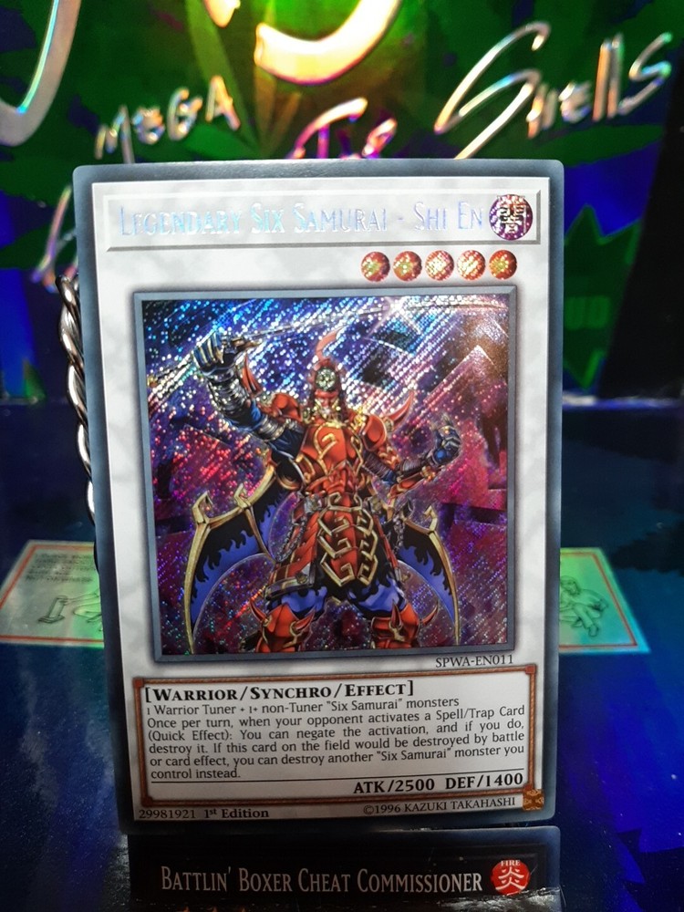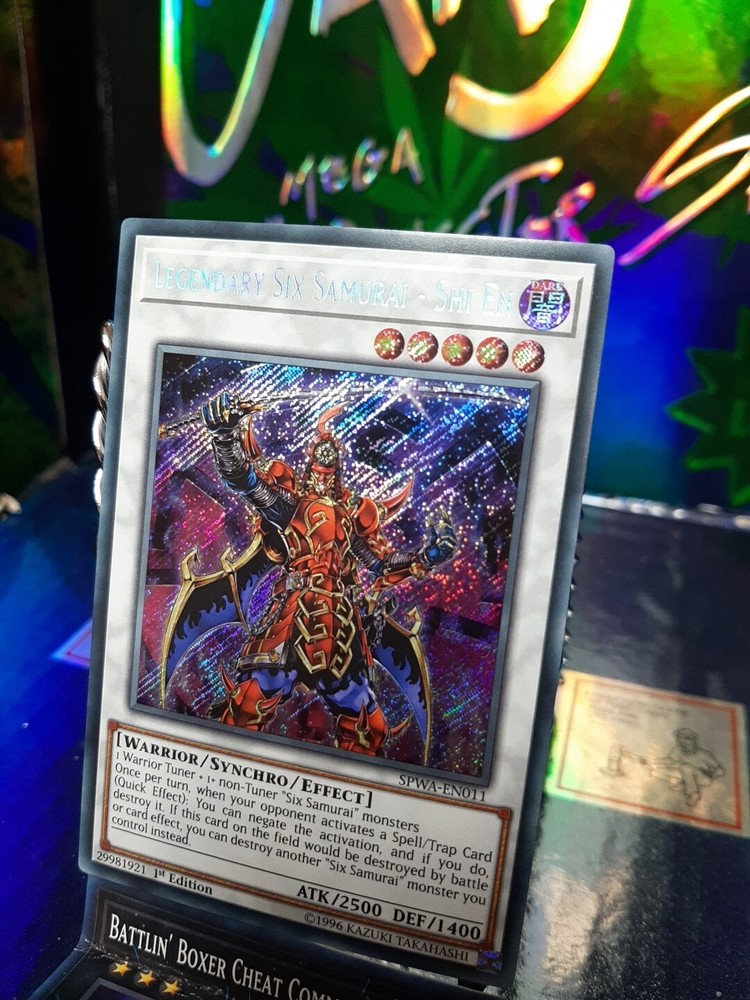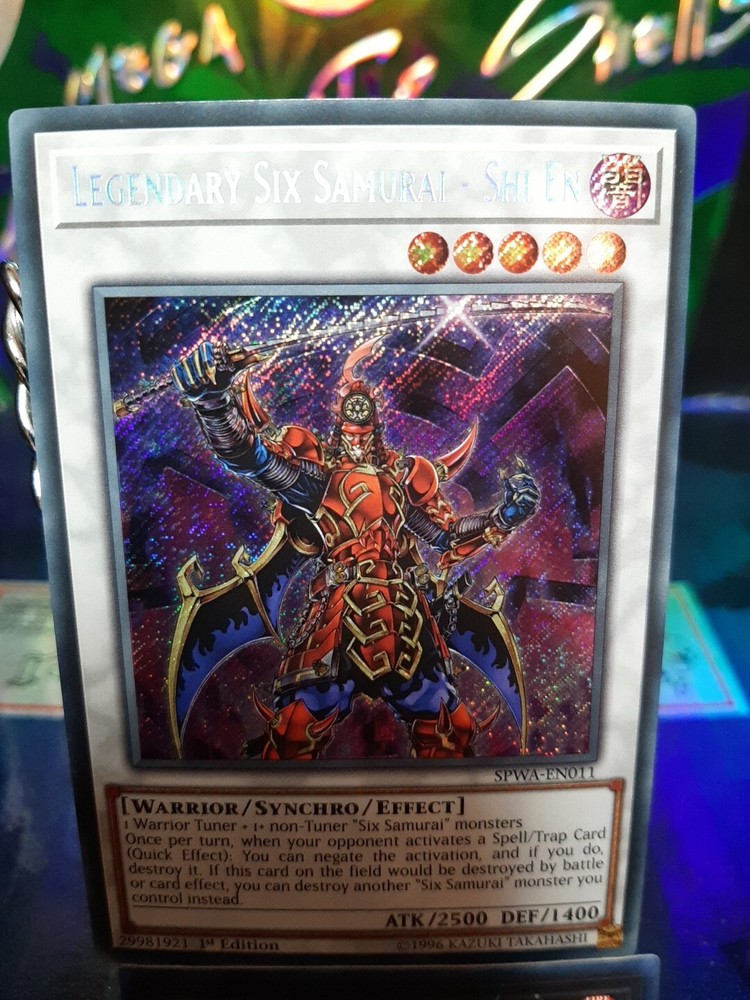 The product is a Secret Rare 1st Edition English Yu-Gi-Oh! TCG card named "Legendary Six Samurai - Shi En." Manufactured by Konami in the United States, this card has the card number SPWA-EN011. It is a highly sought-after collectible card game individual card that features the powerful Legendary Six Samurai - Shi En character. In Near Mint condition, this card is a valuable addition to any Yu-Gi-Oh! card collection.