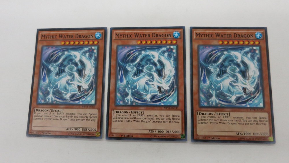 Welcome to Great_Deals_On_Collectibles.We are in the retail hobby sector and have been since 1991.We sell sportscards,gaming cards,comic books,action figures,plush toys and various other hobby related items.We have been on Ebay since 1999.We try to make buyers experience on EBAY as satisfying as possible.Our feedback on Ebay speaks volumes.Every item we have up for auction is LIVE and ready to be shipped upon payment. If you have any questions feel free to contact us,thanks for showing interest. YUGIOH You are bidding on 3x MYTHIC WATER DRAGON MP14-EN135 1ST EDITION COMMON YUGIOH NM / UNPLAYED
