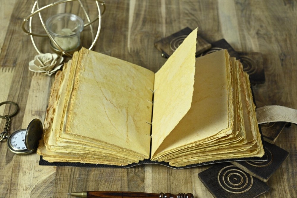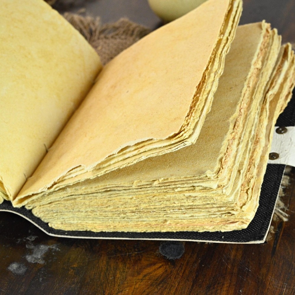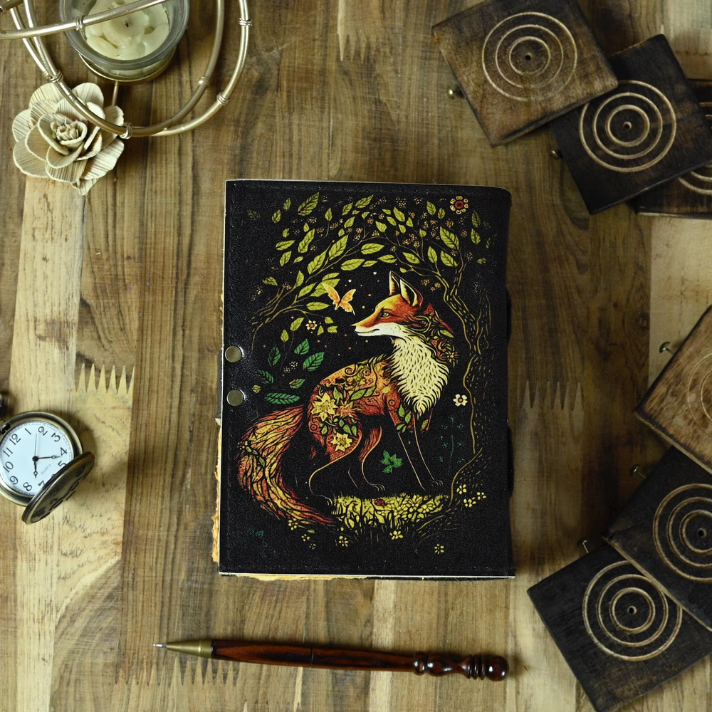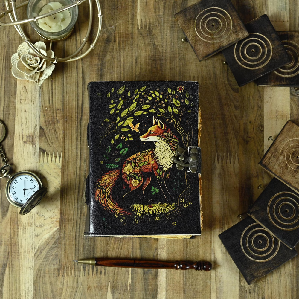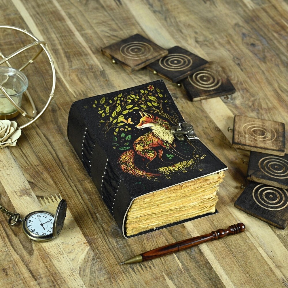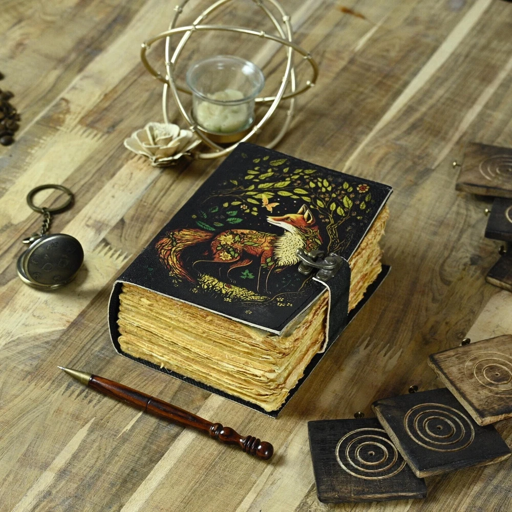 The 400 Page Large Fox Vintage Handmade leather Journal is a luxurious and limited edition grimoire fat journal blank, perfect for those seeking a unique and high-quality writing experience. Made with genuine leather cover and crafted in India, this journal exudes elegance and durability. With its vintage appeal and ample space for writing, this journal is ideal for business, creative, or personal use, offering a timeless and stylish option for those looking to capture their thoughts and ideas. ◆ Details 400 Pages - Fox Leather Journal Rustic vintage leather - Grimoire leather journal - book of shadows - Fat journal gift for men and women •Fox Leather Journal Rustic vintage leather • C-Lock brass • genuine buffalo leather • vintage deckle edge old paper. • 200 Sheet (400 pages both side) • Available Size in 7x5. Fox Leather Journal Rustic Notebook for Writing & Sketching Gift for her, Handcrafted Diary, Book of Shadows, Vintage book, Blank spell book Grimoire journal - Blank spell witch, book of shadows, Gifts For Men and Women ● Antique Paper - Vintage Journal is made of unique vintage paper which looks like it was pulled from history. You will love the old looking handmade cotton paper (200 pages) which is unique to our vintage journals. ● VINTAGE LOCK AND STURDY BINDING - The vintage lock will keep all your valuable writing locked inside.Sturdy hand stitched binding to make sure that no paper comes out loose from your vintage notebook. ● Sketchbook is great for keeping by the bedside to jot down dreams, or for use as a diary or journal. ● It is a truly unique and wonderful gift for a friend, the men, women, and wiccans in your life! or to treat yourself to as a special keepsake ● our journals are influenced by symbolism that is derived from the Wicca/Pagan community, creating a personalized space where your inner creative genius can flourish. ● The paper is made from sustainable cotton and jute canvas. The paper is acid-free and pH neutral therefore is a timeless piece of art. ● Use Any Kind Of Pen - Sketch, Doodle, Write on your journal notebook with a Calligraphy Pen Fountain Pen, Brush Pen, Ball Pen, Acrylic Colours, Watercolor and many more. Grimoire The Skull lover Leather Print journal Antique Notebook And Deckle Edge unlined paper. My clients usage: Gifts for him , valentines gift, anniversary or wedding or housewarming gifts, home decor, modern home decor and many more