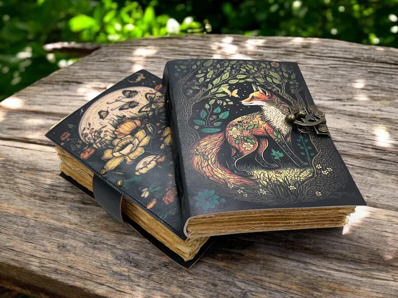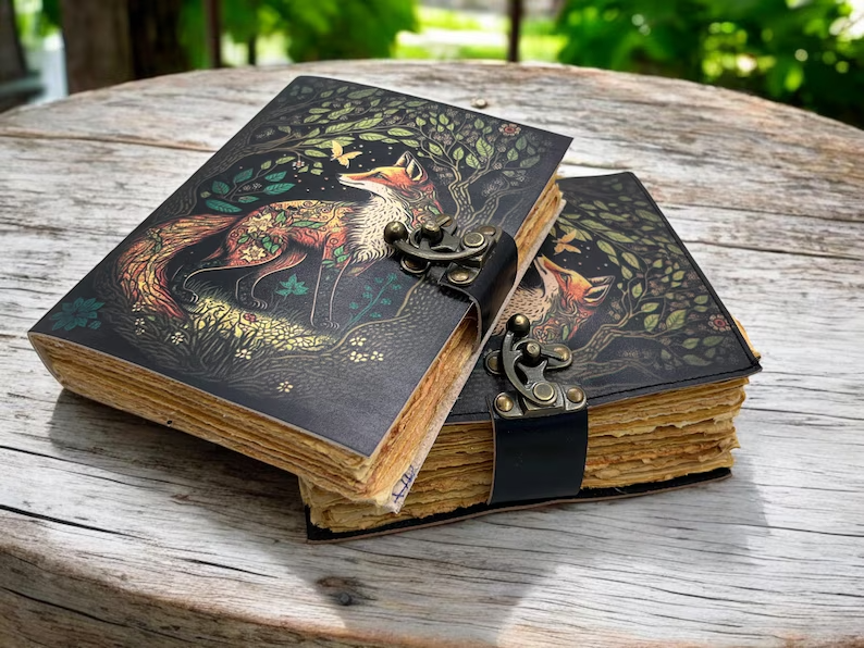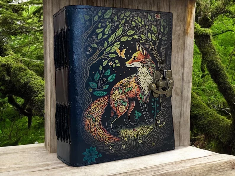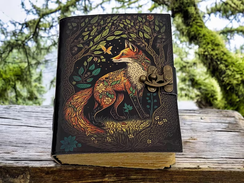 The product is a large vintage fox journal made of leather, with 400 blank pages for writing. Handmade and designed like a grimoire, it evokes the feel of a spell book, perfect for those looking for a unique and mystical writing experience. This diary is ideal for anyone seeking a meaningful and creative way to record their thoughts, plans, and adventures. 400 Page Large Grimoire leather journal, , Blank spell book book of shadows Leather Celestial Gifts For Him Her • Print - Fox leather journal • Vintage lock closure • Genuine buffalo leather • Vintage deckle edge old paper • handmade rustic cotton paper • 100 Sheet (200 pages both side) ●leather journal witchcraft book of shadows notebook is made with 200 pages of Antique Paper which looks like it was pulled from history. You will fall in love with the the antique handmade cotton paper which is unique to our Vintage Journal Notebook. ● The vintage clasp lock will keep all your valuable writing locked inside.Sturdy hand stitched binding to make sure that no paper comes out loose from your spell notebook. ● The witchcraft supplies journal is printed with a special seven stone called “Chakra healing” which helps to reveal inner truth within yourself and encourage self-awareness and self expression. We have taken extra to make sure that the emboss is perfect in every piece. ● Sketch, Doodle, Write on your Leather Blank Spell Journal with a Calligraphy Pen Fountain Pen, Brush Pen, Ball Pen, Acrylic Colours, Watercolor and many more. We guarantee no bleed through. ● Can be used as a notepad, journal, writing notebook, sketch book. 1.25 inch thickness, easy for handwriting, drawing or sketching and compact for carrying in your bag. Ideal for alternative ● Artist Sketchbooks, Photo Album, Traveling Notes, Business Executive, Logbook, Poetry Work, Journalists, Food Planner, Instagram Scrapbook and Bible Journaling. ● Best Gift For Your Companion: A Journal Is Like A Trusted Friend. You Can Use It To Solve Queries, Get Inventive, Or Record Valuable Memories For Them To Last Forever Or You Can Just Use It As A Gift For Your Wife, Son, Or A Daughter Or For Some Enthusiastic Writer In Your Family. Even For Looking For A Miraculous spell book Or A D&D Gamer Looking For His Quest Book. ● Perfectly Sized For Multi-Purpose Use: Length 5", Width 1", Height 7" Inches, This Easy To Carry Personal Diary Is Perfect To Use As A Health Journal, Sketchbook, And Poetry Journal. It’S An Ideal Journal Which Records Your Daily Thoughts And Life Lists. And Also Good For Designing, Doodling, Or Calligraphy Of Your Choice.
