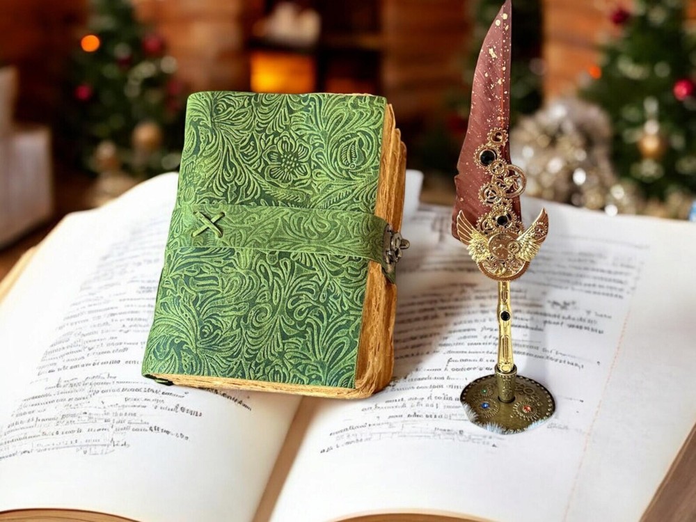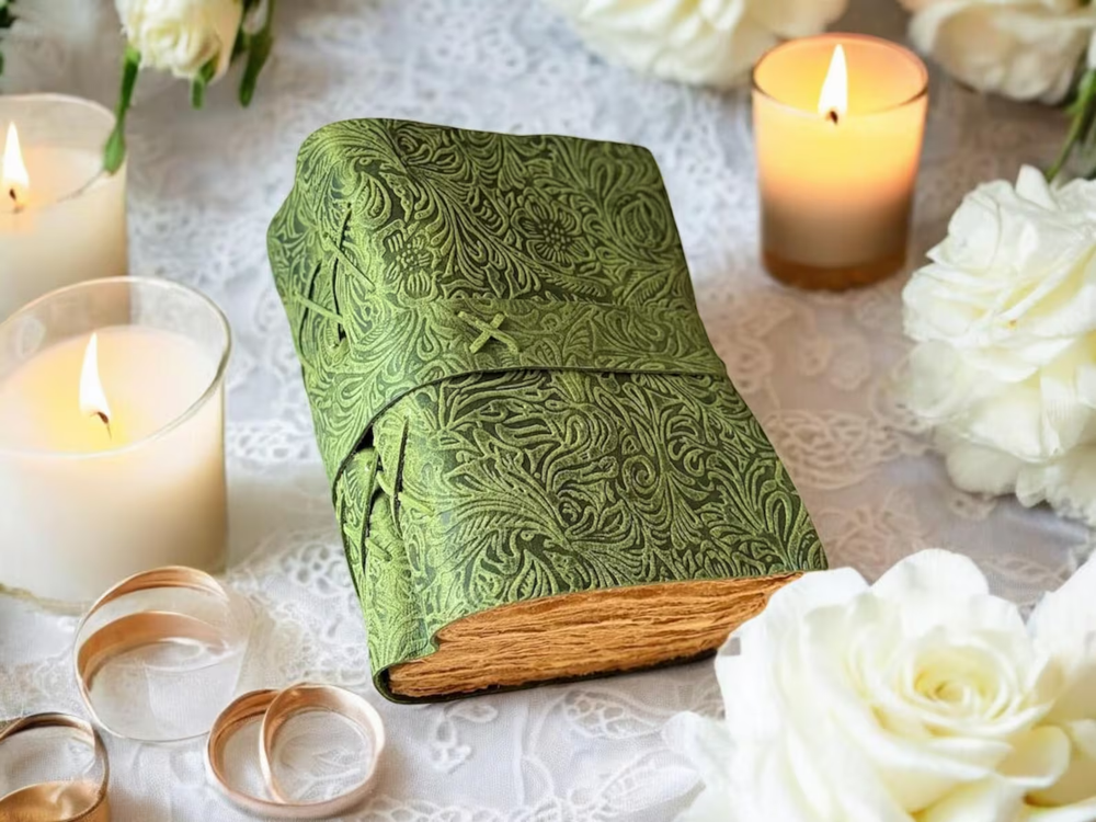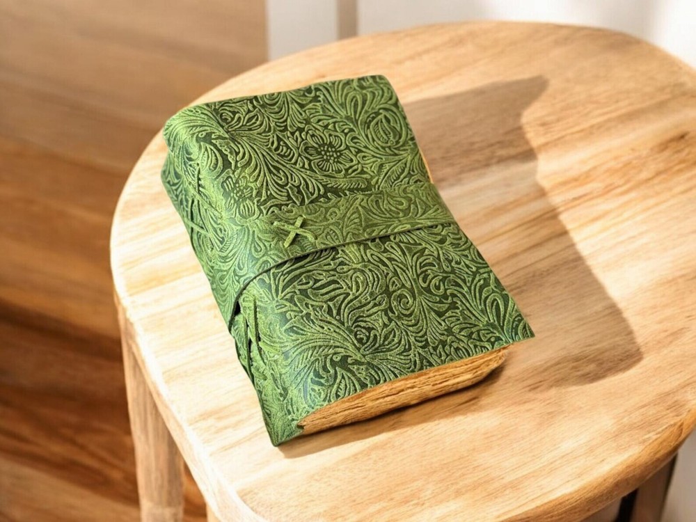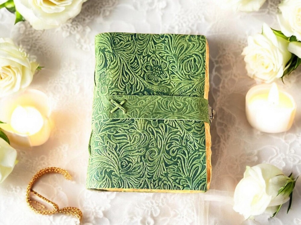 Delve into a world of timeless elegance with our 400-page Large Grimoire Vintage Leather Journal. Each page is waiting to hold your secrets, ideas, and memories within its handcrafted, antique deckle edge parchment. This luxury, limited edition notebook is a first-class treasure, a true collector's item that promises to be as distinguished by its presence as it is by its content. Crafted with care in India, this journal's cover is made from premium leather, exuding a classic charm that only improves with age. It's not personalized, ensuring that its grandeur is preserved for all who appreciate the allure of a finely made, unsigned journal - a piece that blends the old-world feel of vintage paper with the durability of modern craftsmanship. 400 Page Large Grimoire leather journal, , Blank spell book book of shadows Leather Celestial Gifts For Him Her Details UNIQUE HANDMADE VINTAGE JOURNAL- This Vintage Journal is made with purely handmade papers and gives a rich antique look. It looks and shows as if it was pulled from history. We assure you that you will fall in love with the antique handmade journal. *WRITING- Sketch, Doodle, Write and use any kind of a Calligraphy Pen Fountain Pen, Brush Pen, Ball Pen, Acrylic Colours, Water colours and many more. *PREMIUM SOFT THICK GENUINE LEATHER - This leather Journal is made from naturally tanned full-grain leather which feels and smells great. The Journal is totally soft and very easy to use *BINDING AND LEATHER WRAPAROUND - Beautifully handcrafted and hand-stitched binding to make sure that no paper comes out loose from your vintage notebook. *USAGE: Perfect Gift For Friends And Family! Green vintage Leather journals, Notebook Or Sketchbook Vintage Antique Deckle Paper, Book Of Shadows, leather Gift for Men & Women Beautifully handcrafted and very unique design. Soft & Supple green Genuine Leather with a real leather scent and have an amazing feeling of being comfortable. Antique vintage Journal for personal Diary, notebook, sketchbook, Ledger, etc. Material: Leather Handcrafted from Eco-Friendly Leather With Recycled deckled edge Paper. •Calligraphy Of Your Choice. PAYMENT I accept Payoneer. COUNTRY: Shipping Worldwide from India TYPE: Standard Int'l Flat Rate Shipping I usually ship within 24 hours after receipt of payment. The delivery time from Ukraine: 10-25 days. Item will be qualitatively packed. Always leave a positive feedback to good ebayers