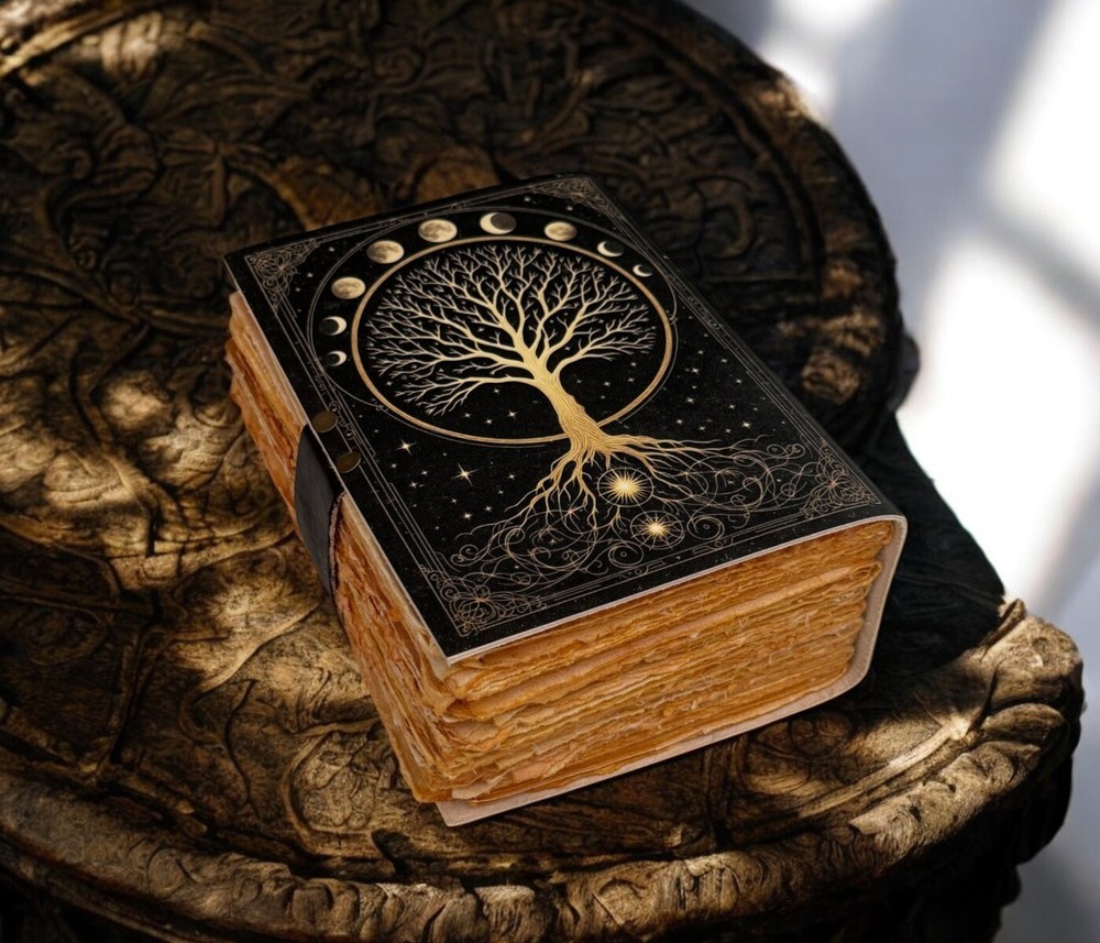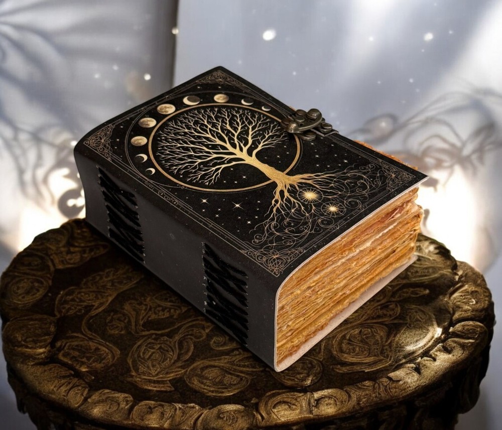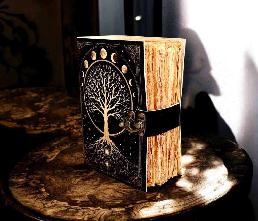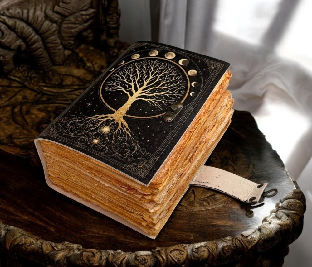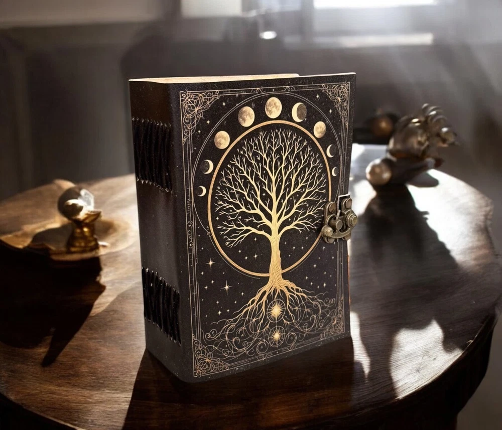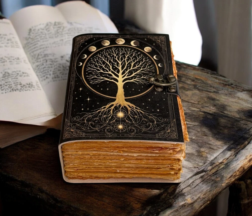 Large Grimoire leather journal, Print Tree of Life Journal, Blank spell book book of shadows Leather Celestial Gifts For Him Her • Print - Tree of life • Vintage lock closure • Genuine buffalo leather • Vintage deckle edge old paper • handmade rustic cotton paper • 100 Sheet (200 pages both side) • 200 Sheet (400 pages both side) ●Leather journal witchcraft book of shadows notebook is made with 200 pages of Antique Paper which looks like it was pulled from history. You will fall in love with the the antique handmade cotton paper which is unique to our Vintage Journal Notebook. ● The vintage clasp lock will keep all your valuable writing locked inside.Sturdy hand stitched binding to make sure that no paper comes out loose from your spell notebook. ● The witchcraft supplies journal is printed with a special seven stone called “Chakra healing” which helps to reveal inner truth within yourself and encourage self-awareness and self expression. We have taken extra to make sure that the emboss is perfect in every piece. ● Sketch, Doodle, Write on your Leather Blank Spell Journal with a Calligraphy Pen Fountain Pen, Brush Pen, Ball Pen, Acrylic Colours, Watercolor and many more. We guarantee no bleed through. ● Can be used as a notepad, journal, writing notebook, sketch book. 1.25 inch thickness, easy for handwriting, drawing or sketching and compact for carrying in your bag. Ideal for alternative ● Artist Sketchbooks, Photo Album, Traveling Notes, Business Executive, Logbook, Poetry Work, Journalists, Food Planner, Instagram Scrapbook and Bible Journaling. ● Best Gift For Your Companion: A Journal Is Like A Trusted Friend. You Can Use It To Solve Queries, Get Inventive, Or Record Valuable Memories For Them To Last Forever Or You Can Just Use It As A Gift For Your Wife, Son, Or A Daughter Or For Some Enthusiastic Writer In Your Family. Even For Looking For A Miraculous Spell Book Or A D&D Gamer Looking For His Quest Book. ● Perfectly Sized For Multi-Purpose Use: Length 5", Width 1", Height 7" Inches, This Easy To Carry Personal Diary Is Perfect To Use As A Health Journal, Sketchbook, And Poetry Journal. It’S An Ideal Journal Which Records Your Daily Thoughts And Life Lists. And Also Good For Designing, Doodling, Or Calligraphy Of Your Choice.