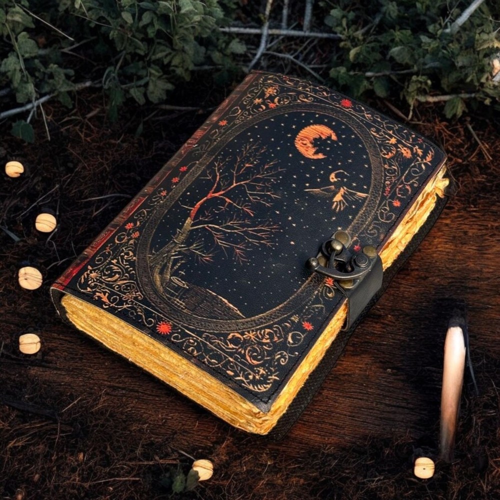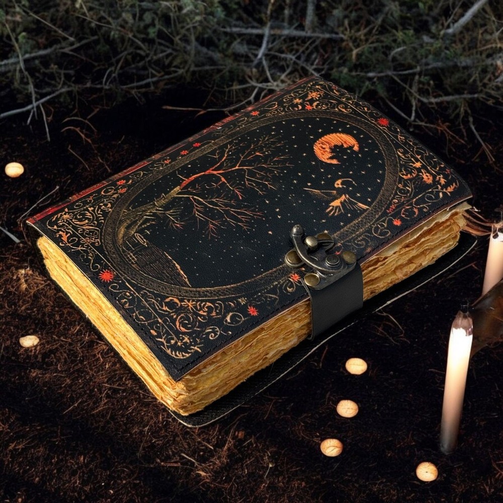 Large Grimoire leather journal, Print Tree of Life Journal, Blank spell book book of shadows Leather Celestial Gifts For Him Her • Print - Tree of life • Vintage lock closure • Genuine buffalo leather • Vintage deckle edge old paper • handmade rustic cotton paper • 100 Sheet (200 pages both side) • 200 Sheet (400 pages both side) ●Leather journal witchcraft book of shadows notebook is made with 200 pages of Antique Paper which looks like it was pulled from history. You will fall in love with the the antique handmade cotton paper which is unique to our Vintage Journal Notebook. ● The vintage clasp lock will keep all your valuable writing locked inside.Sturdy hand stitched binding to make sure that no paper comes out loose from your spell notebook. ● The witchcraft supplies journal is printed with a special seven stone called “Chakra healing” which helps to reveal inner truth within yourself and encourage self-awareness and self expression. We have taken extra to make sure that the emboss is perfect in every piece. ● Sketch, Doodle, Write on your Leather Blank Spell Journal with a Calligraphy Pen Fountain Pen, Brush Pen, Ball Pen, Acrylic Colours, Watercolor and many more. We guarantee no bleed through. ● Can be used as a notepad, journal, writing notebook, sketch book. 1.25 inch thickness, easy for handwriting, drawing or sketching and compact for carrying in your bag. Ideal for alternative ● Artist Sketchbooks, Photo Album, Traveling Notes, Business Executive, Logbook, Poetry Work, Journalists, Food Planner, Instagram Scrapbook and Bible Journaling. ● Best Gift For Your Companion: A Journal Is Like A Trusted Friend. You Can Use It To Solve Queries, Get Inventive, Or Record Valuable Memories For Them To Last Forever Or You Can Just Use It As A Gift For Your Wife, Son, Or A Daughter Or For Some Enthusiastic Writer In Your Family. Even For Looking For A Miraculous Spell Book Or A D&D Gamer Looking For His Quest Book. ● Perfectly Sized For Multi-Purpose Use: Length 5", Width 1", Height 7" Inches, This Easy To Carry Personal Diary Is Perfect To Use As A Health Journal, Sketchbook, And Poetry Journal. It’S An Ideal Journal Which Records Your Daily Thoughts And Life Lists. And Also Good For Designing, Doodling, Or Calligraphy Of Your Choice.