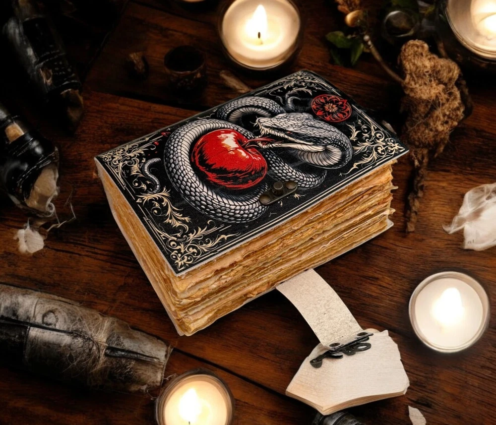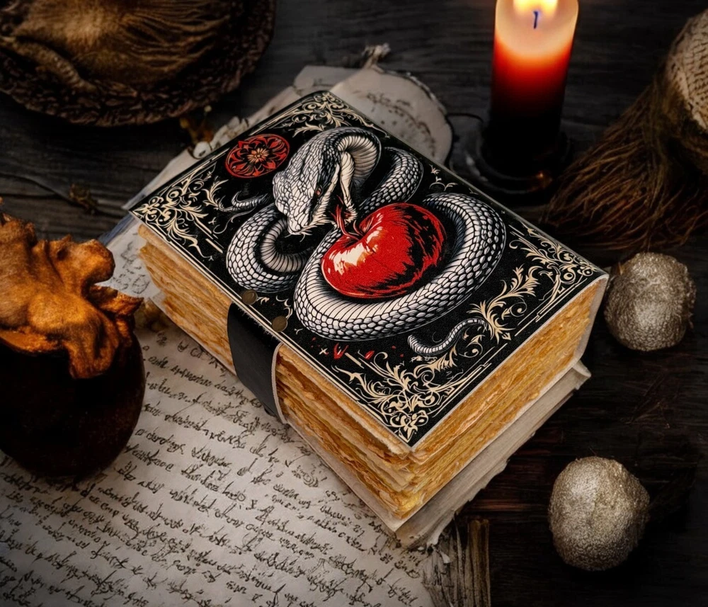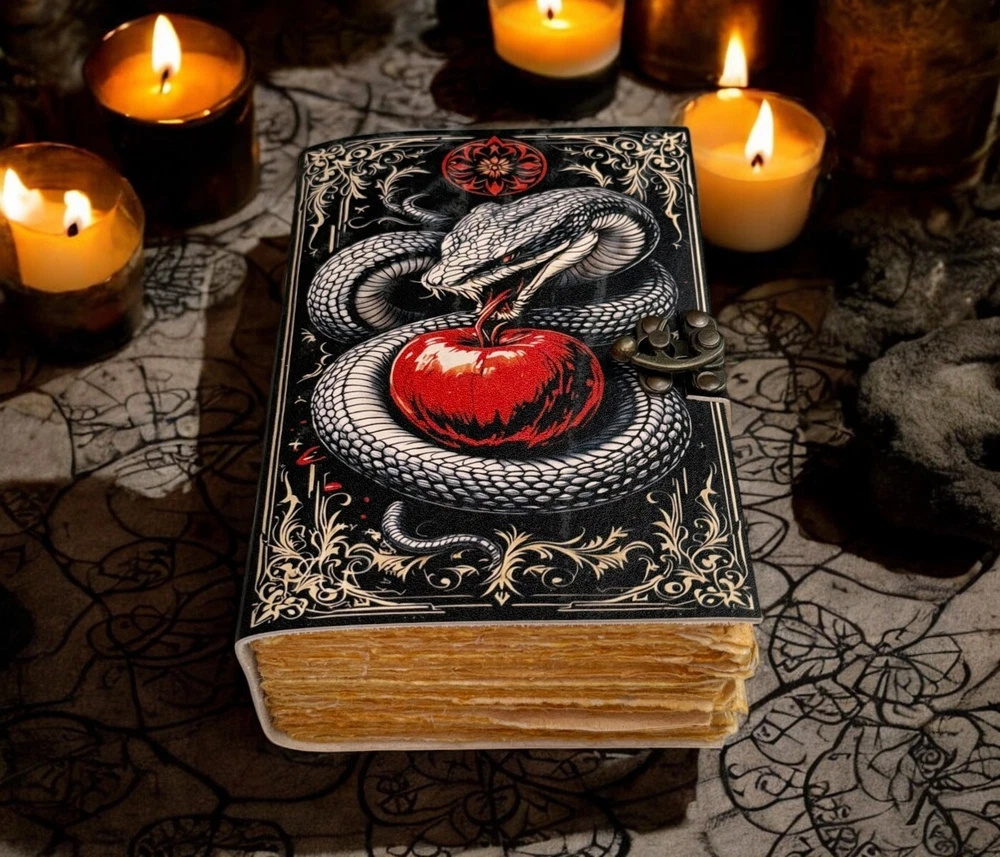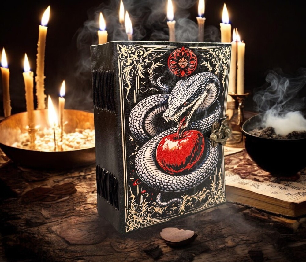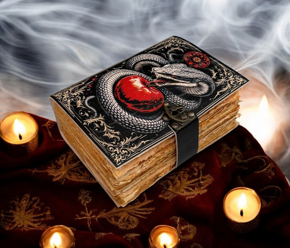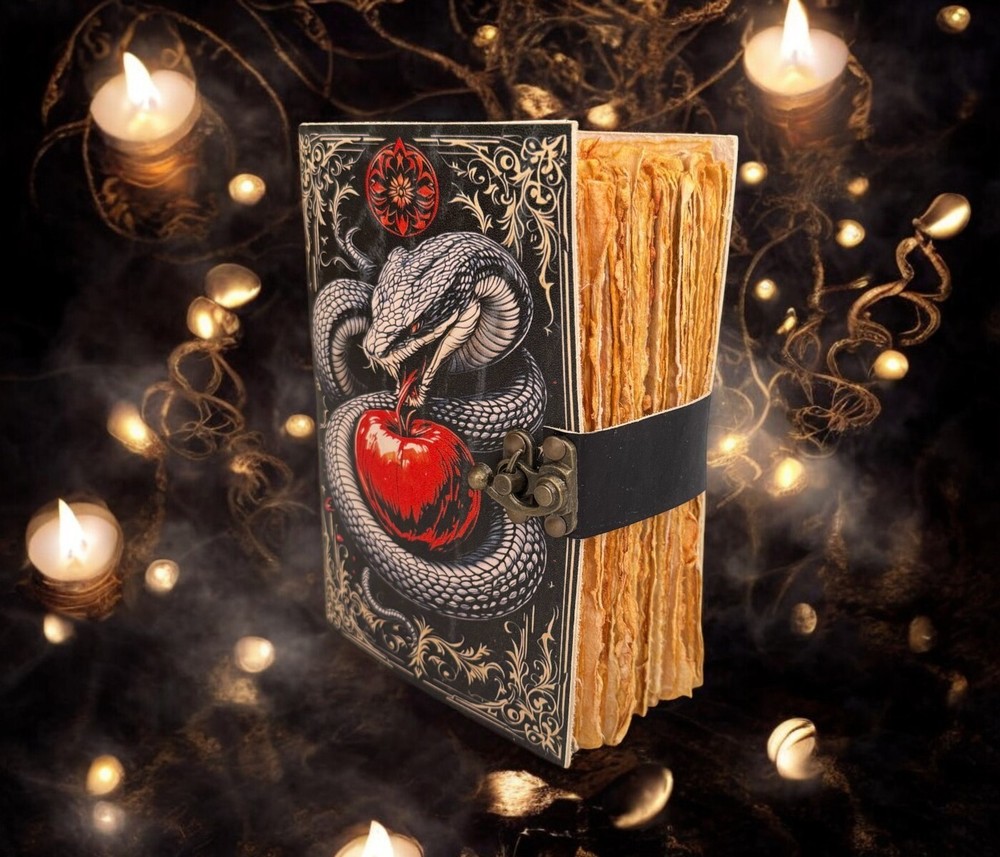 SERPENTINE APPLE LEATHER PRINTED DESIGN - Perfectly print with the Serpent apple designs, this journal makes a thoughtful gift to anyone of different cultures. The serp symbolizes firmness, strength, and power while the moon represents calmness, beauty, and nurturing STYLISHLY MEDIEVAL HANDMADE VINTAGE PAPER - Ancient looking rustic cotton paper combined with the beauty of distressed leather, hand-stitched by Artisans, creates a keepsake you will cherish forever. Makes a great gift for the men, women, and Wiccans in your life! IMMACULATE CRAFTMANSHIP - These journals are built from 200 pages of excellent quality handmade vintage papers with 150 GSM thick, and rich, durable handcrafted genuine brown leather covers. STRONG, STURDY BINDING & SMALL BRASS C-LOCK- Great quality journals always start with their binding. For the Vintage Leather Cat Printed Journal, the binding is stitched by sturdy hands to make sure that the papers are safe and secure. Many Uses - Can be used as a notepad, journal, writing notebook, sketch book. 1.25 inch thickness, easy for handwriting, drawing or sketching and compact for carrying in your bag. Ideal for alternative Artist Sketchbooks, Photo Album, Traveling Notes, Business Executive, Logbook, Poetry Work, Journalists, Food Planner, Instagram Scrapbook and Bible Journaling.
