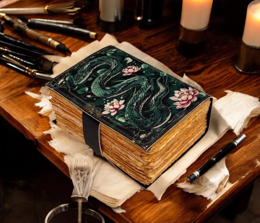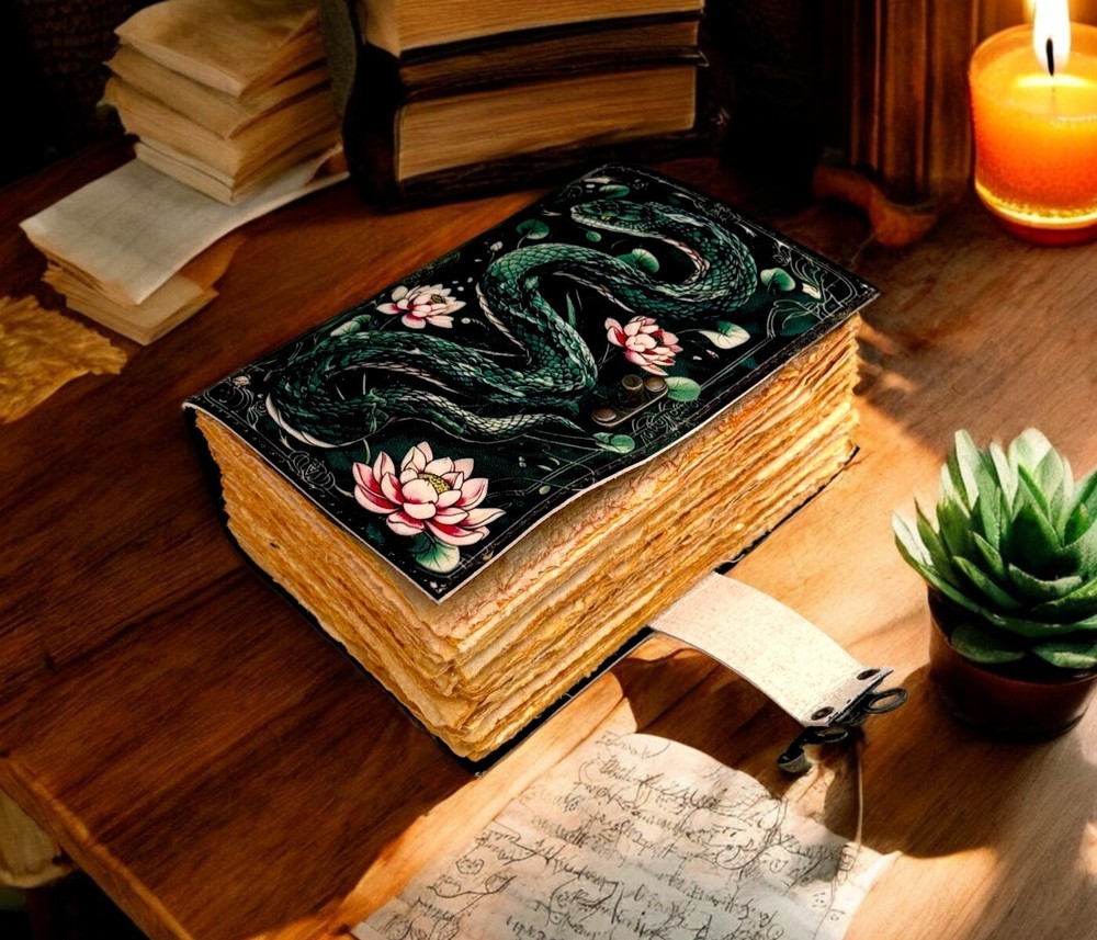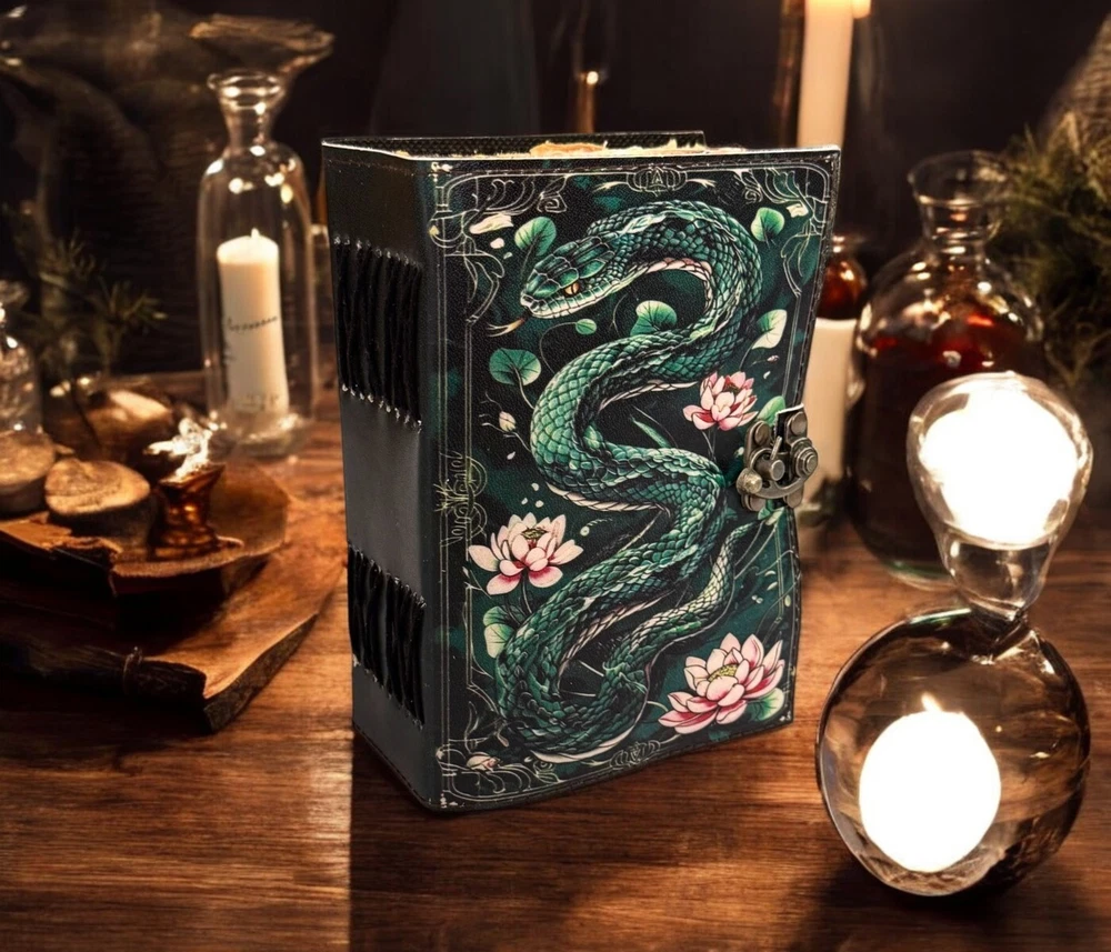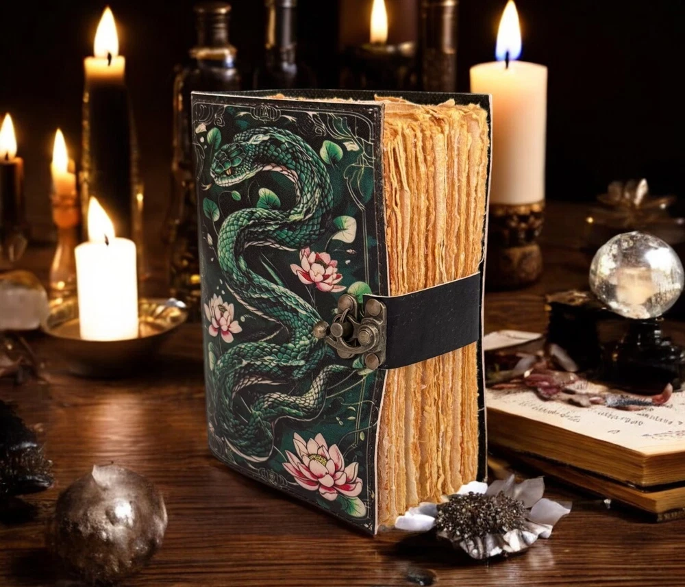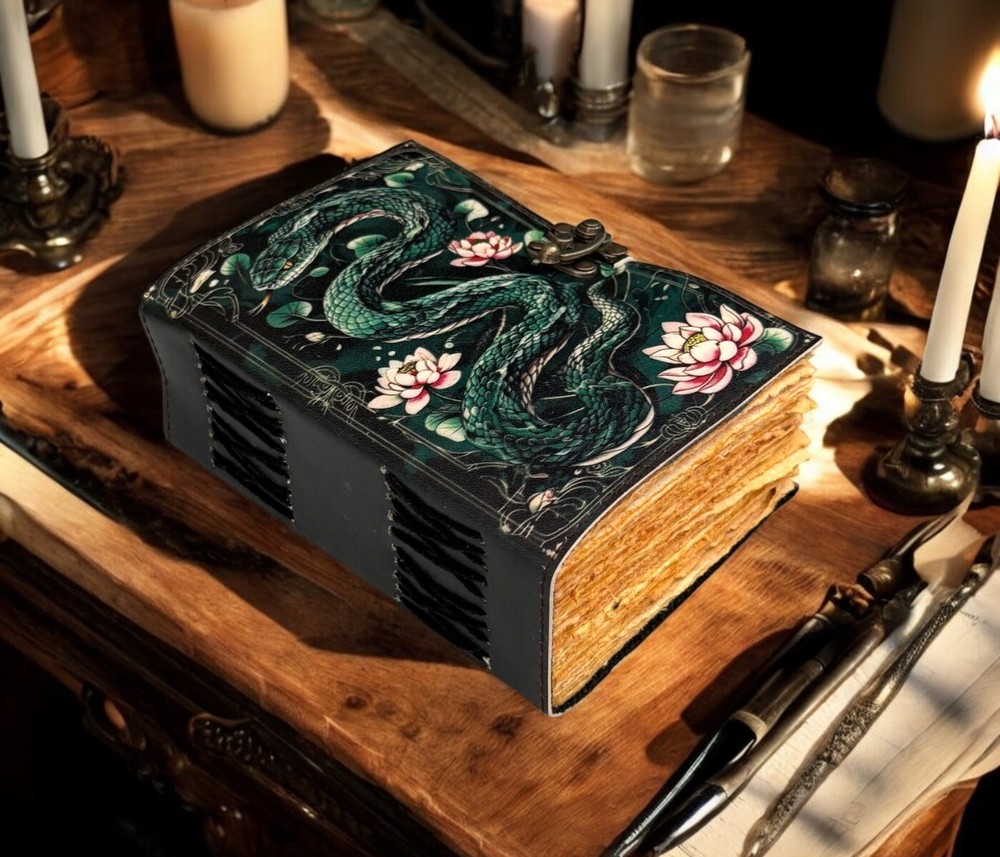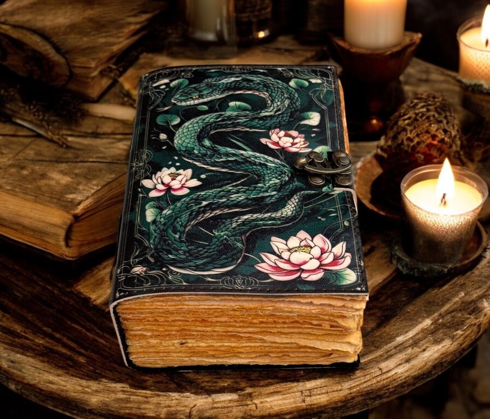 SERPENTINE APPLE LEATHER PRINTED DESIGN - Perfectly print with the Serpent apple designs, this journal makes a thoughtful gift to anyone of different cultures. The serp symbolizes firmness, strength, and power while the moon represents calmness, beauty, and nurturing STYLISHLY MEDIEVAL HANDMADE VINTAGE PAPER - Ancient looking rustic cotton paper combined with the beauty of distressed leather, hand-stitched by Artisans, creates a keepsake you will cherish forever. Makes a great gift for the men, women, and Wiccans in your life! IMMACULATE CRAFTMANSHIP - These journals are built from 200 pages of excellent quality handmade vintage papers with 150 GSM thick, and rich, durable handcrafted genuine brown leather covers. STRONG, STURDY BINDING & SMALL BRASS C-LOCK- Great quality journals always start with their binding. For the Vintage Leather Cat Printed Journal, the binding is stitched by sturdy hands to make sure that the papers are safe and secure. Many Uses - Can be used as a notepad, journal, writing notebook, sketch book. 1.25 inch thickness, easy for handwriting, drawing or sketching and compact for carrying in your bag. Ideal for alternative Artist Sketchbooks, Photo Album, Traveling Notes, Business Executive, Logbook, Poetry Work, Journalists, Food Planner, Instagram Scrapbook and Bible Journaling.