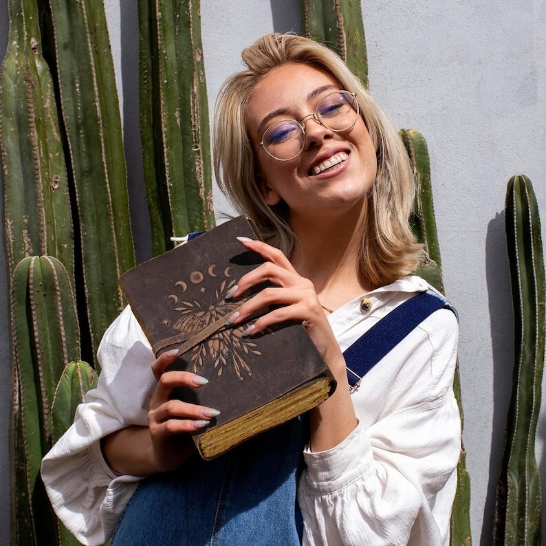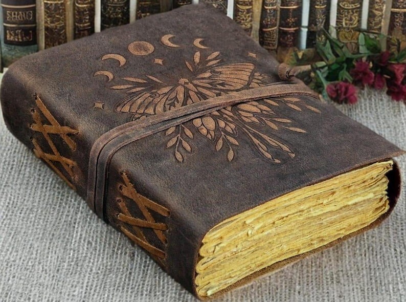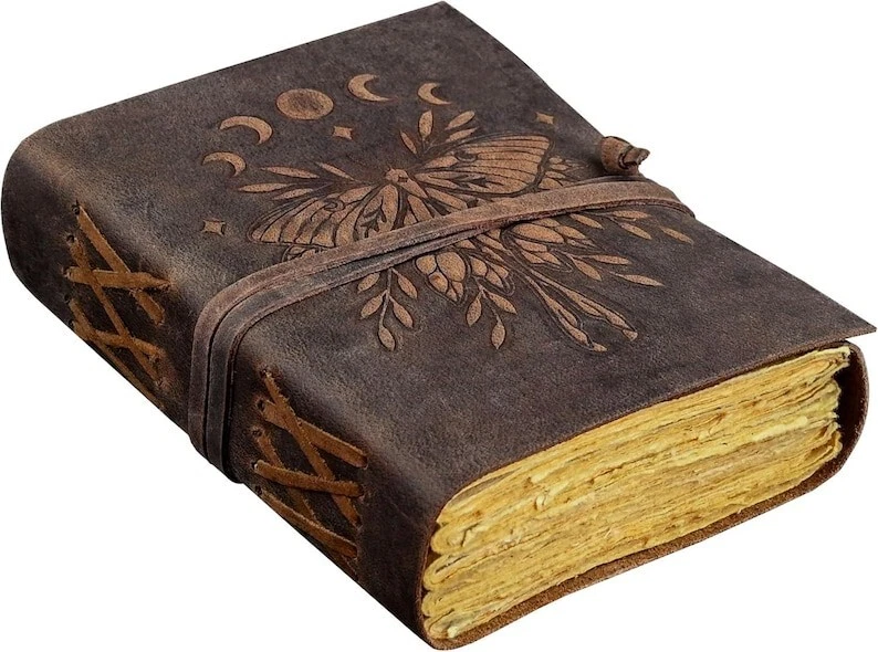 400 Pages Large Luna Moth Spell Book Leather Journal - Luna Moth Magic Journal Book of Shadows - Witchcraft Supplies Wiccan Decor Notebook Luna Moth Leather Journal LEATHER JOURNAL HAS BEEN THROUGHOUT SANITIZED Beautifully Soft and Durable Top Grain Leather Coptic binding means the pages stay firmly in place A lovely distressed vintage style with a gorgeous, real leather scent handmade leather naturally tanned with oil 200 Pages of Thick Antique Vintage Cotton Deckle Paper which looks like thousand years old. A BEAUTIFUL LEATHER JOURNAL OF THE HIGHEST QUALITY The leather Key journal made from antique paper is a treasure that you can pass down the generations. vintage journals grimoire Bound leather book of shadows journal blank spell notebook black the garden flower uncharted merchandise deckle edge paper wiccan sketchbook for women is very beautifully embossed and hand made 100 leaves 200 pages notebook features a green leather binding with embossed designs on both front and back Handmade Deckle Edge Old Vintage Paper Hand crafted Paper using Old Style Cotton Paper , perfectly complementing the black leather Tree-free and Acid-free means you purchasing a product that not harmful A perfect size 200 both side pages journal, not too bulky, easy to write in from the very first page Easy to write in and draw on, use any fountain pens or different colors without worrying about bleed through