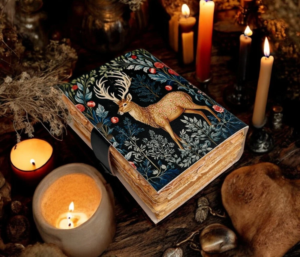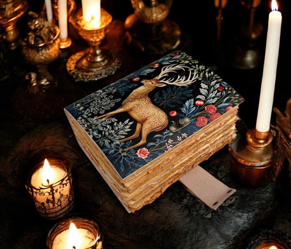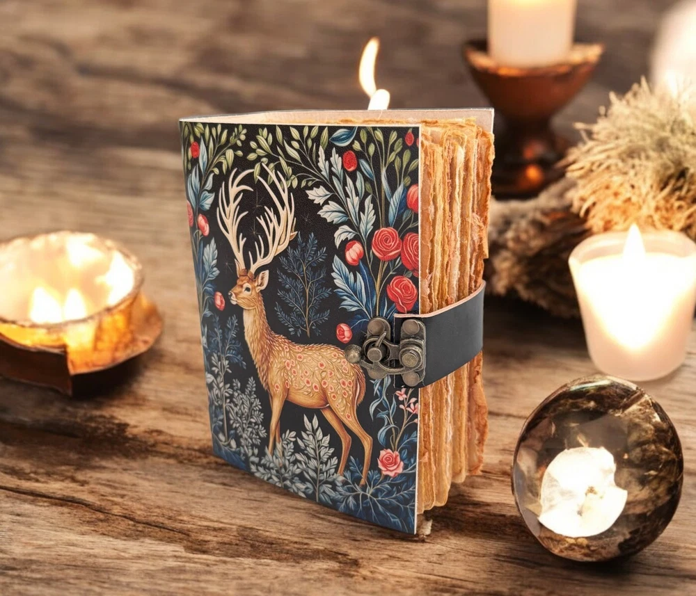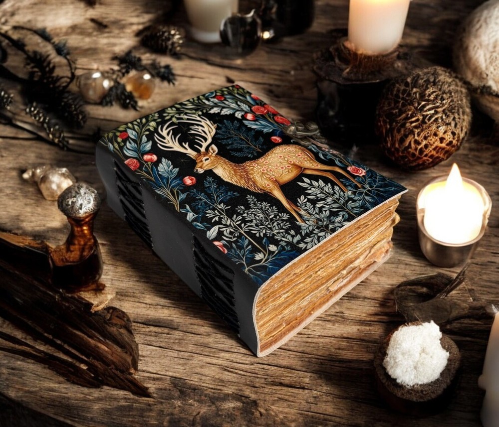Vintage leather Journal Deer printed Journal Blank spell Book of Shadows Handmade Leather Journal Grimoire Journal with Deckle Edge Paper Details :- Grimoire The Deer Leather Print journal Antique Notebook And Deckle Edge unlined paper. The lovers • Size - 7×5 inches,8 x 6 inches, 10x7 Inches 13X10 Inches • Color - • C-Lock • genuine leather • vintage deckle edge old paper • 100 Sheet (200 pages both side) ● Antique Paper - Vintage Journal is made of unique vintage paper which looks like it was pulled from history. You will love the old looking handmade cotton paper (200 pages) which is unique to our vintage journals. ● VINTAGE LOCK AND STURDY BINDING - The vintage lock will keep all your valuable writing locked inside.Sturdy hand stitched binding to make sure that no paper comes out loose from your vintage notebook. ● Sketchbook is great for keeping by the bedside to jot down dreams, or for use as a diary or journal. ● It is a truly unique and wonderful gift for a friend, the men, women, and wiccans in your life! or to treat yourself to as a special keepsake ● our journals are influenced by symbolism that is derived from the Wicca/Pagan community, creating a personalized space where your inner creative genius can flourish. ● The paper is made from sustainable cotton and jute canvas. The paper is acid-free and pH neutral therefore is a timeless piece of art. ● Use Any Kind Of Pen - Sketch, Doodle, Write on your journal notebook with a Calligraphy Pen Fountain Pen, Brush Pen, Ball Pen, Acrylic Colours, Watercolor and many more.