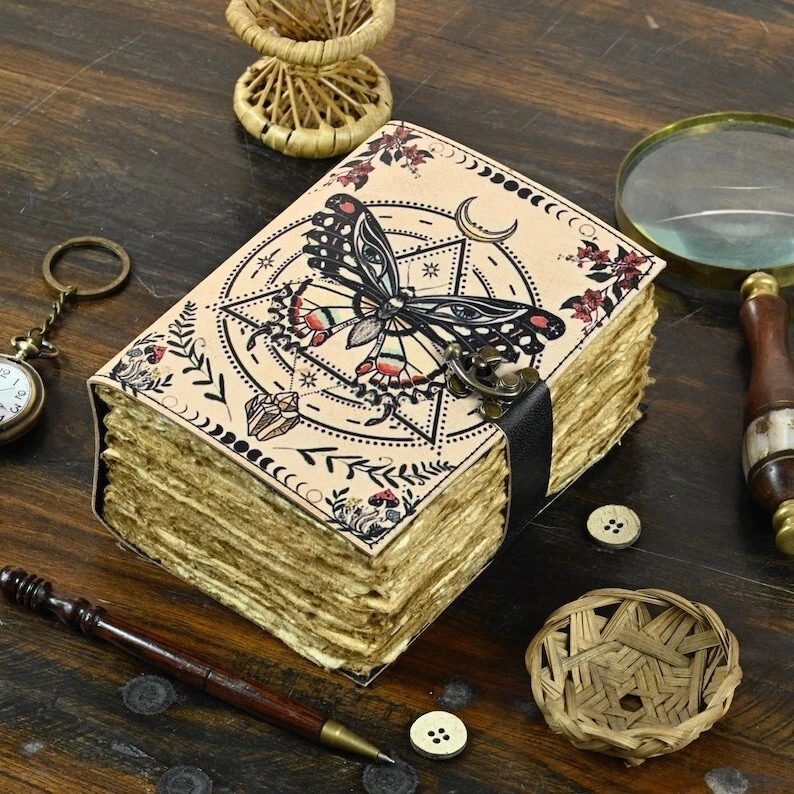 400 Pages Large Luna Moth spell book leather journal - Luna Moth magic journal book of shadows - witchcraft supplies Wiccan Decor Notebook Luna Moth leather journal leather journal HAS BEEN THROUGHOUT SANITIZED Beautifully Soft and Durable Top Grain Leather Coptic binding means the pages stay firmly in place A lovely distressed vintage style with a gorgeous, real leather scent handmade leather naturally tanned with oil 200 Pages of Thick Antique Vintage Cotton Deckle Paper which looks like thousand years old. A BEAUTIFUL leather journal OF THE HIGHEST QUALITY The leather Key journal made from antique paper is a treasure that you can pass down the generations. vintage journals grimoire Bound leather book of shadows journal blank spell notebook black the garden flower uncharted merchandise deckle edge paper wiccan sketchbook for women is very beautifully embossed and hand made 100 leaves 200 pages notebook features a green leather binding with embossed designs on both front and back Handmade Deckle Edge Old Vintage Paper Hand crafted Paper using Old Style Cotton Paper , perfectly complementing the black leather Tree-free and Acid-free means you purchasing a product that not harmful A perfect size 200 both side pages journal, not too bulky, easy to write in from the very first page Easy to write in and draw on, use any fountain pens or different colors without worrying about bleed through