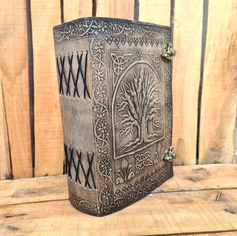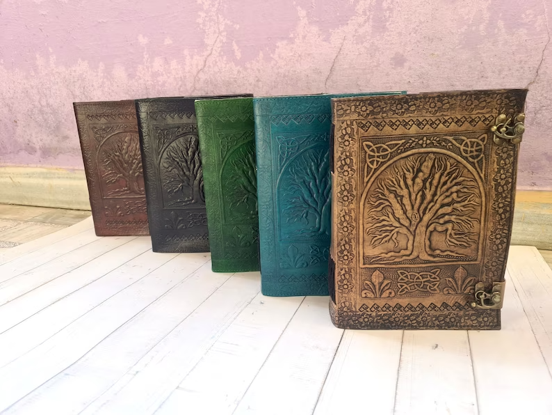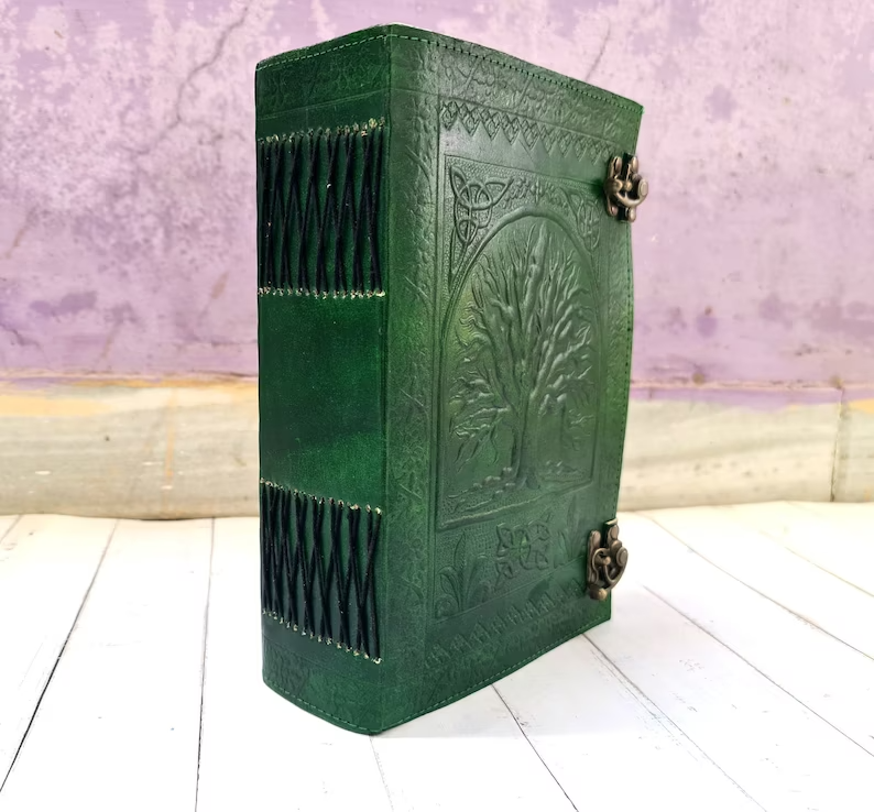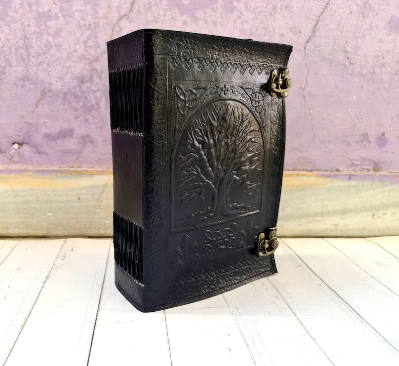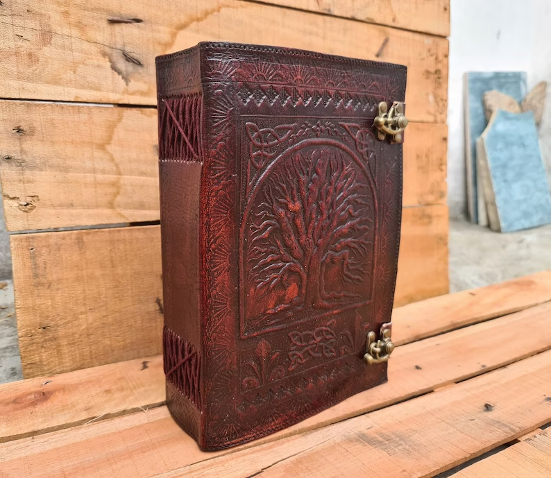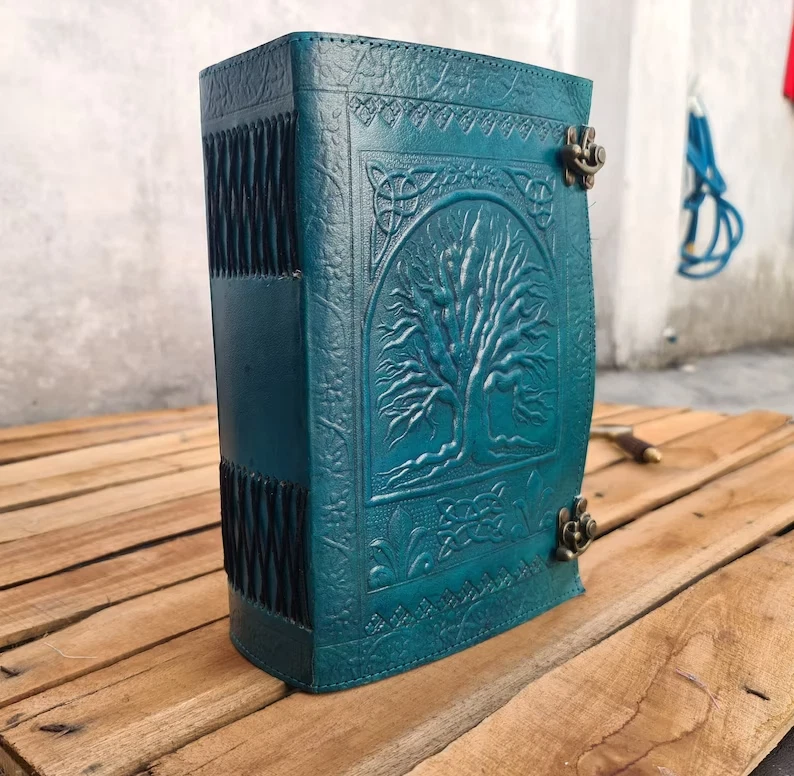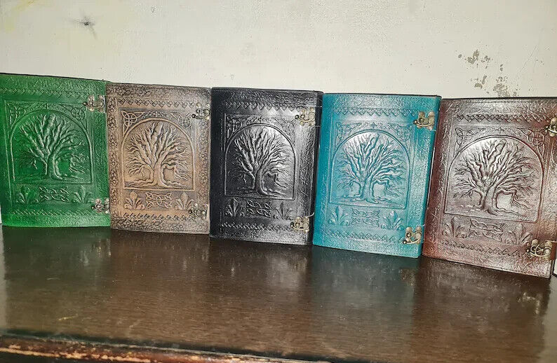 Journal Tree of life leather journal Notebook Writing Journal With Tree of Life refillable notebook Gift For Valentine's day Men & Women Handmade Large Tree of life Journal made from cow hide leather. This notebook tree of life entirely done by hand embossed. Tree of life leather journal notebook with blank paper are fixed with a removable string binding which make it possible to replace with the new paper once used. Provided with 300 sheets of paper ( 600 pages counting on both side). Leather journal notebook can be use as a personal journal for writing, journal to write in, leather notebook, spell book, sketchbook, drawing, travel notebook, daily notepad, leather dairy, story writing, vacation journal. Perfect for gift - Suitable for men or women Celtic Embossed tree of life leather journal is perfect for gift Christmas, New year, family members, your loved once, relatives, occasions, celebration, festivals. Size: Length - 7" Width - 3" Height - 10" Inches