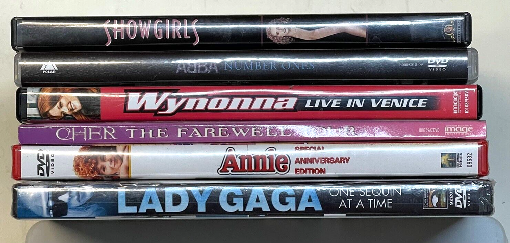 6-DVDs Music Lot, Showgirls?, Abba, Wynonna, Cher, Annie and Lady Gaga, EX+ Condition. Annie and Lady Gaga Still Sealed! From a Local Estate. What you see in the photos is what you will receive. Shipped Quickly! Satisfaction Guaranteed! Thanks. Julie. (Garblkwirerack)