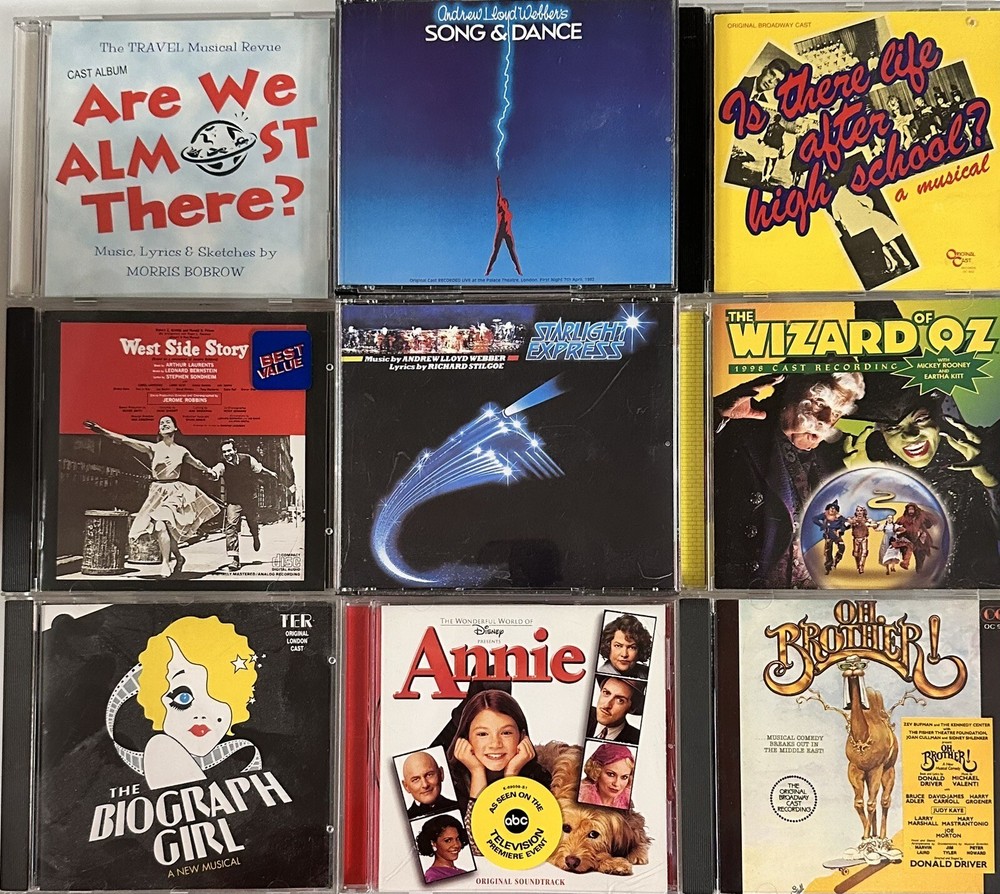 9 Broadway Shows CD’s The Wizard of Oz, 1998 cast recording with Mickey Rooney and Eartha Kitt Oh brother, the original Broadway cast recording Westside Story Annie Original soundtrack Andrew Lloyd Webber, song and dance The biography girl a new musical Starlight express music by Andrew Lloyd Webber lyrics by Richard Stilcoe Is there life after high school a musical Are we almost there cast album?