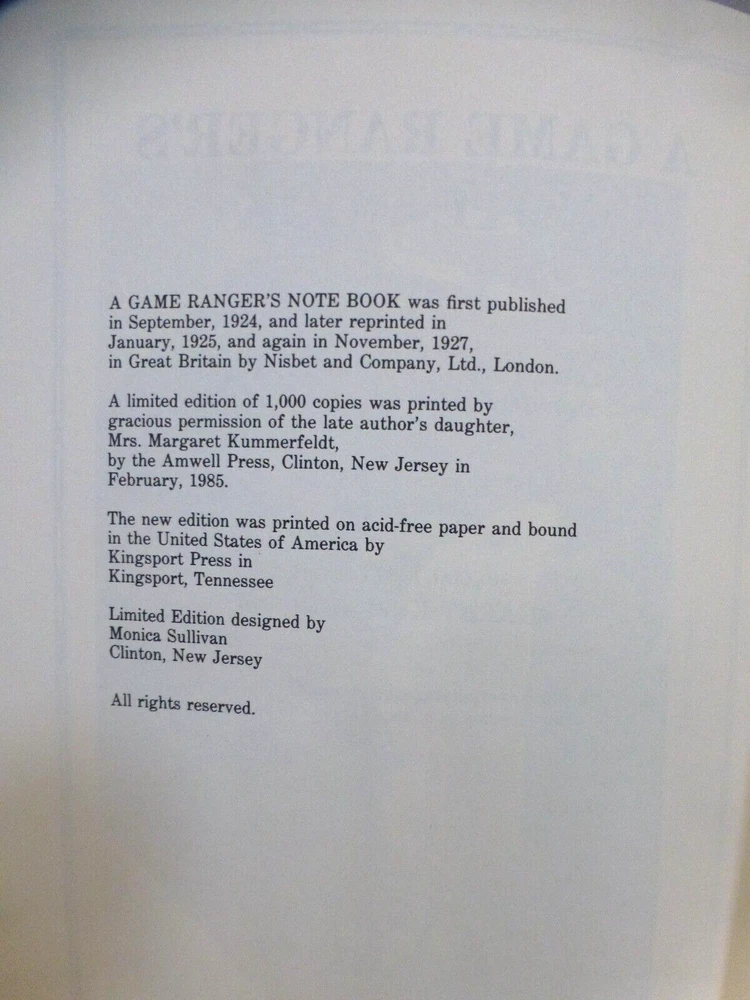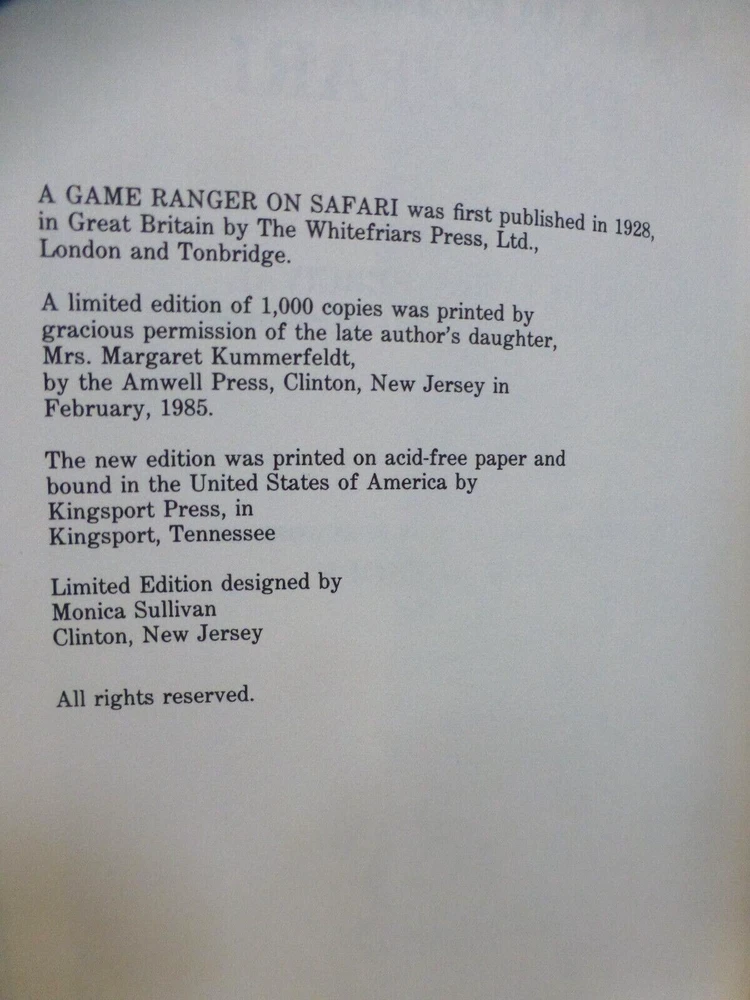 Limited edition of 1000, this box set of two leather bound books with both books being No.902. Books are signed by the daughter of the author (who authorized this limited edition): Margaret Kummerfeldt, and the president of the National Shooting Fraternity Limited: Jim Rikhoff I also have several books listed in the African collection published by Briar Patch Press. Also have books in the Asian Series, and the Kenneth Anderson Series both published by John Culler & Sons. Most are As New condition, with many still wrapped in parchment paper. I carefully unwrap to take photos. Several books published by Amwell press in the same general topic of Africa and Safari. Most copies in the African Collection are No. 333 out of 500. Most books In the Asian Series are No. 110 out of 500 Most books in Kenneth Anderson Series are No.90 of 580 We are a retail used bookstore, all books are for sale in our store so we reserve the right to cancel listings at any time, items are not returnable so please ask any and all questions before purchase, we are happy to take additional photos or answer questions you may have. Also, if you are in Las Vegas/Henderson NV area books are available for in-person pick-up. I wrap carefully with bubble wrap and ship insured via USPS.